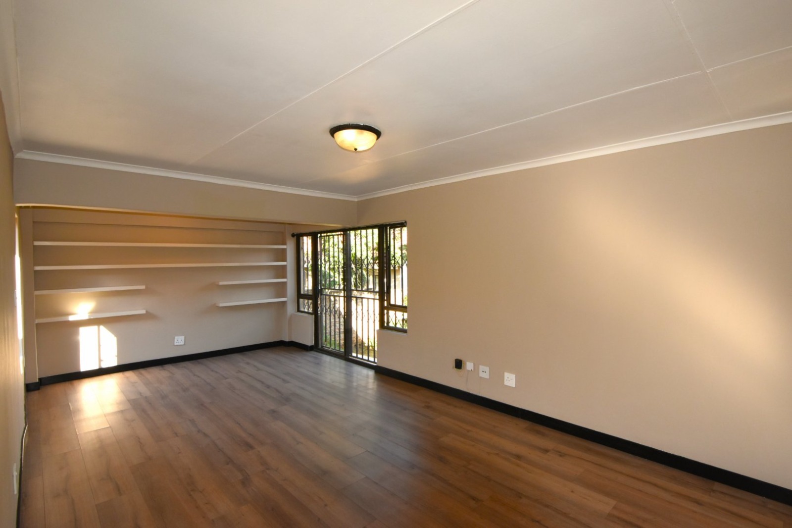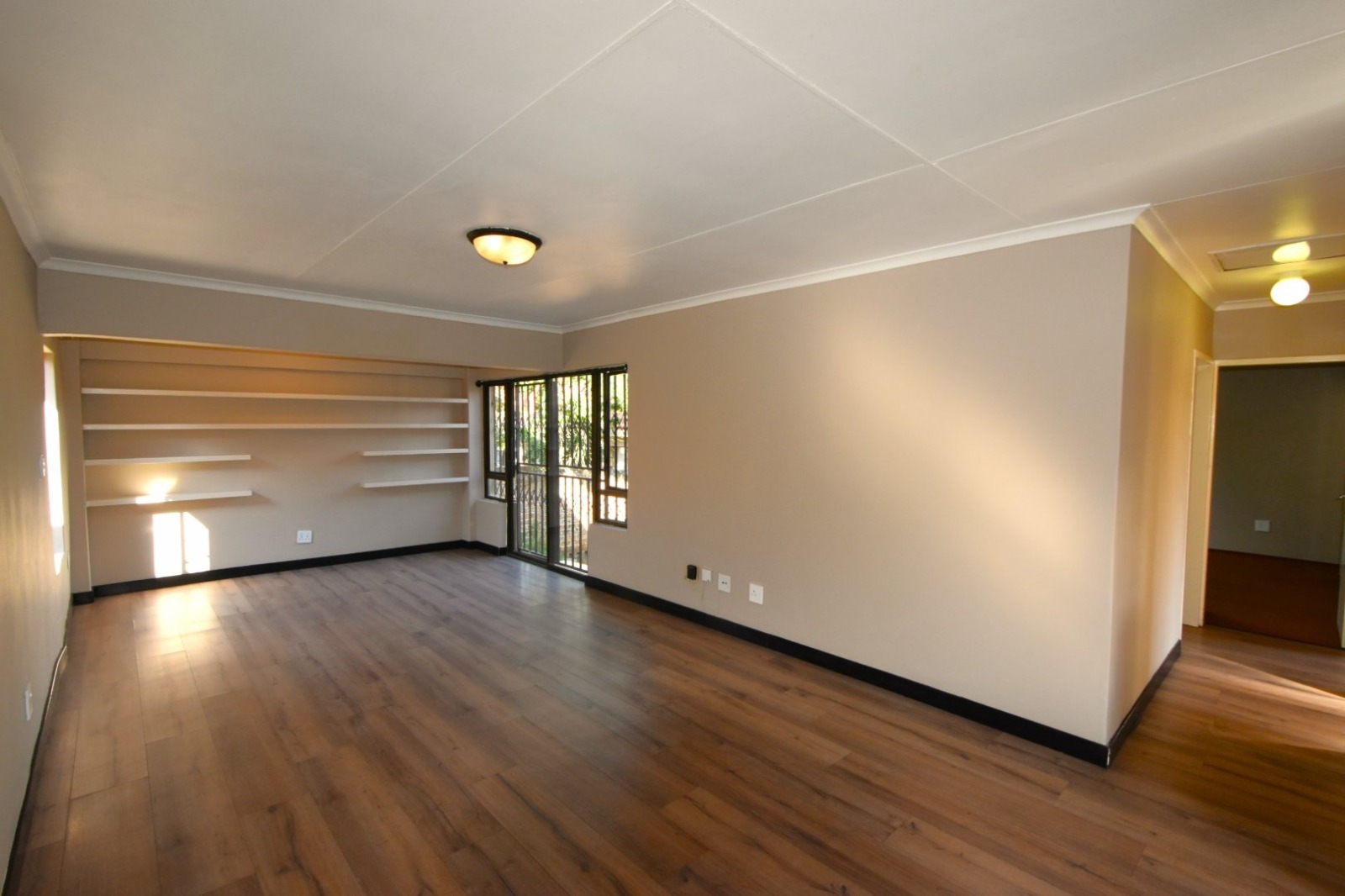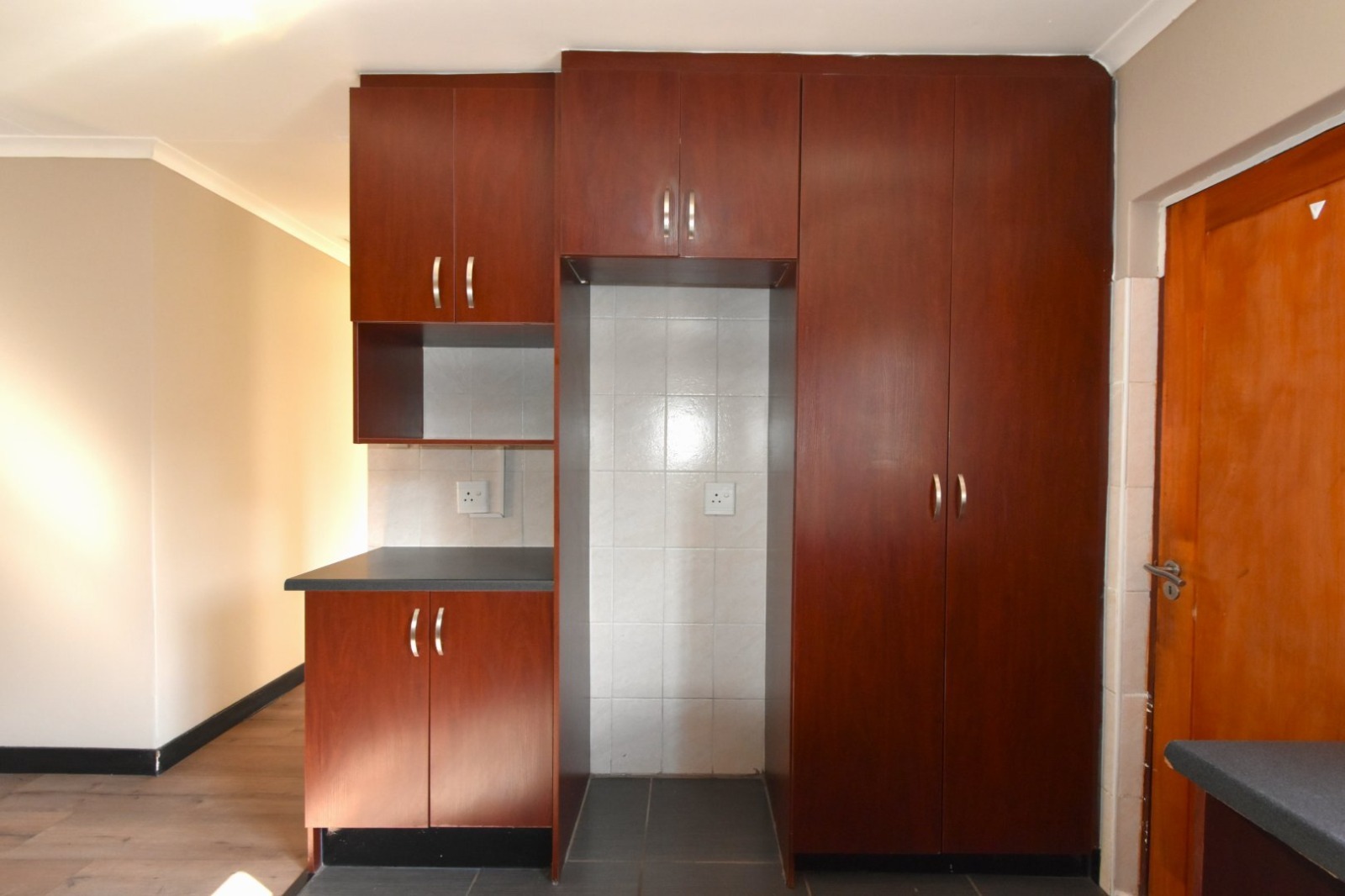 Discover this inviting 3-bedroom, 2-bathroom residence situated within a secure complex in Albemarle, Germiston. Designed for practical living, the home features an open-plan layout seamlessly connecting the kitchen and living areas, bathed in natural light from well-placed windows. The functional kitchen is equipped with dark wood cabinetry, offering ample storage, an integrated wine rack, a convenient breakfast bar, and essential built-in appliances including a stove, oven, and extractor fan. Tiled flooring in the kitchen transitions smoothly to laminate in the adjacent living space, which also benefits from built-in shelving.