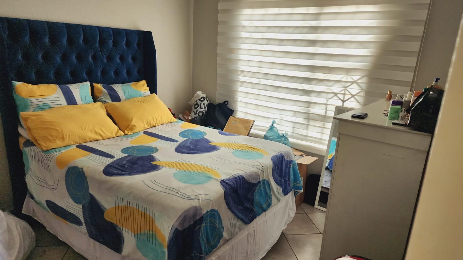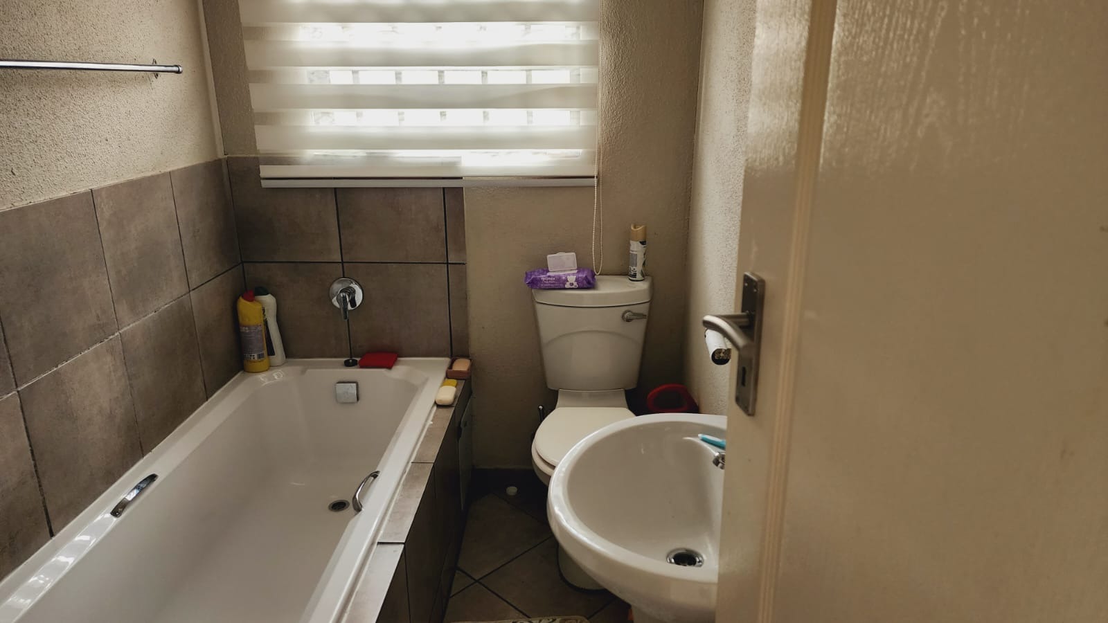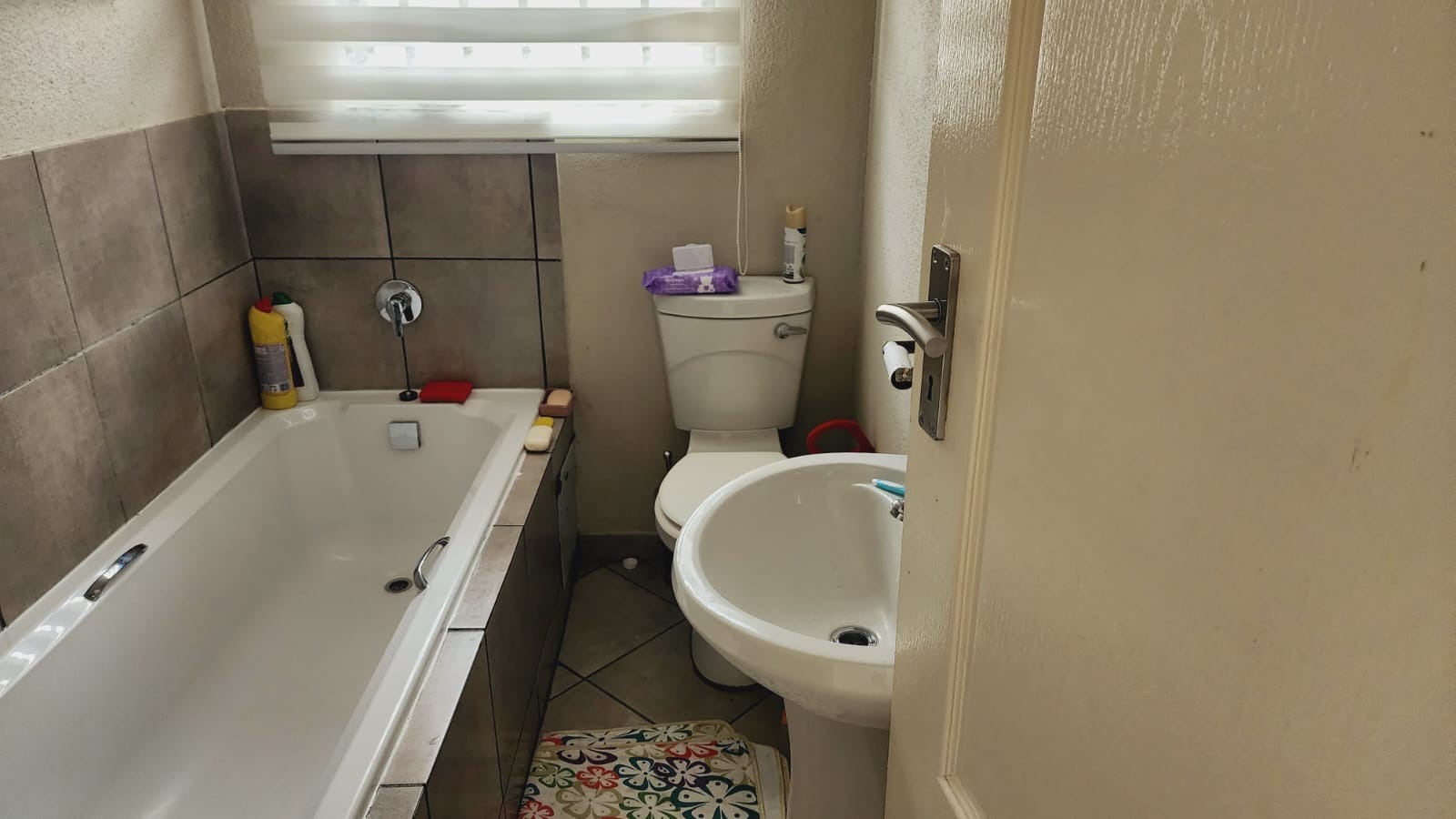 The residence offers three well-proportioned bedrooms, providing ample accommodation for family members or guests. Complementing these are two functional bathrooms, each featuring a bathtub with an integrated shower mixer, a toilet, and a pedestal sink, all surrounded by durable tiled walls. Natural light and privacy are managed by windows fitted with blinds.