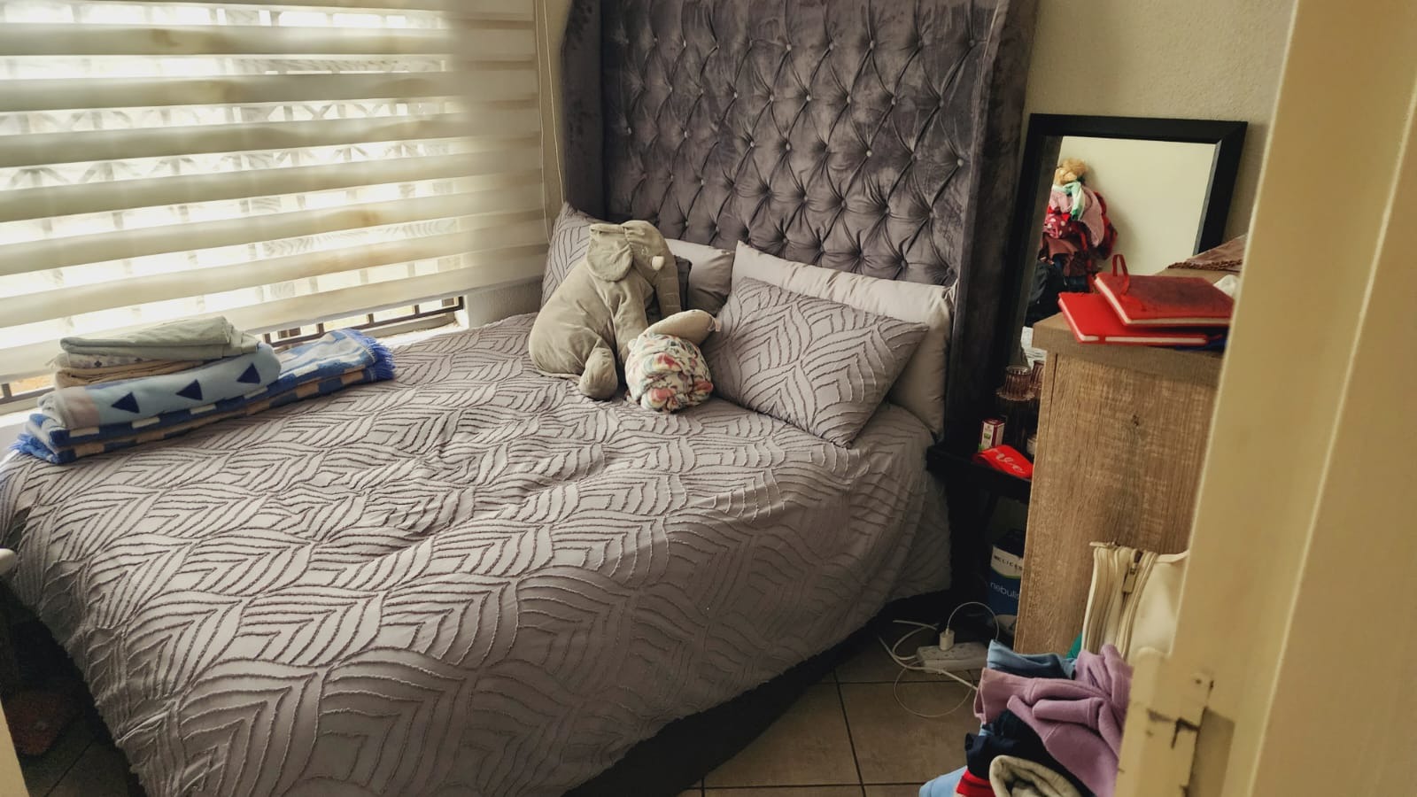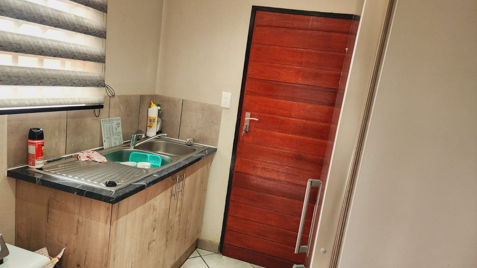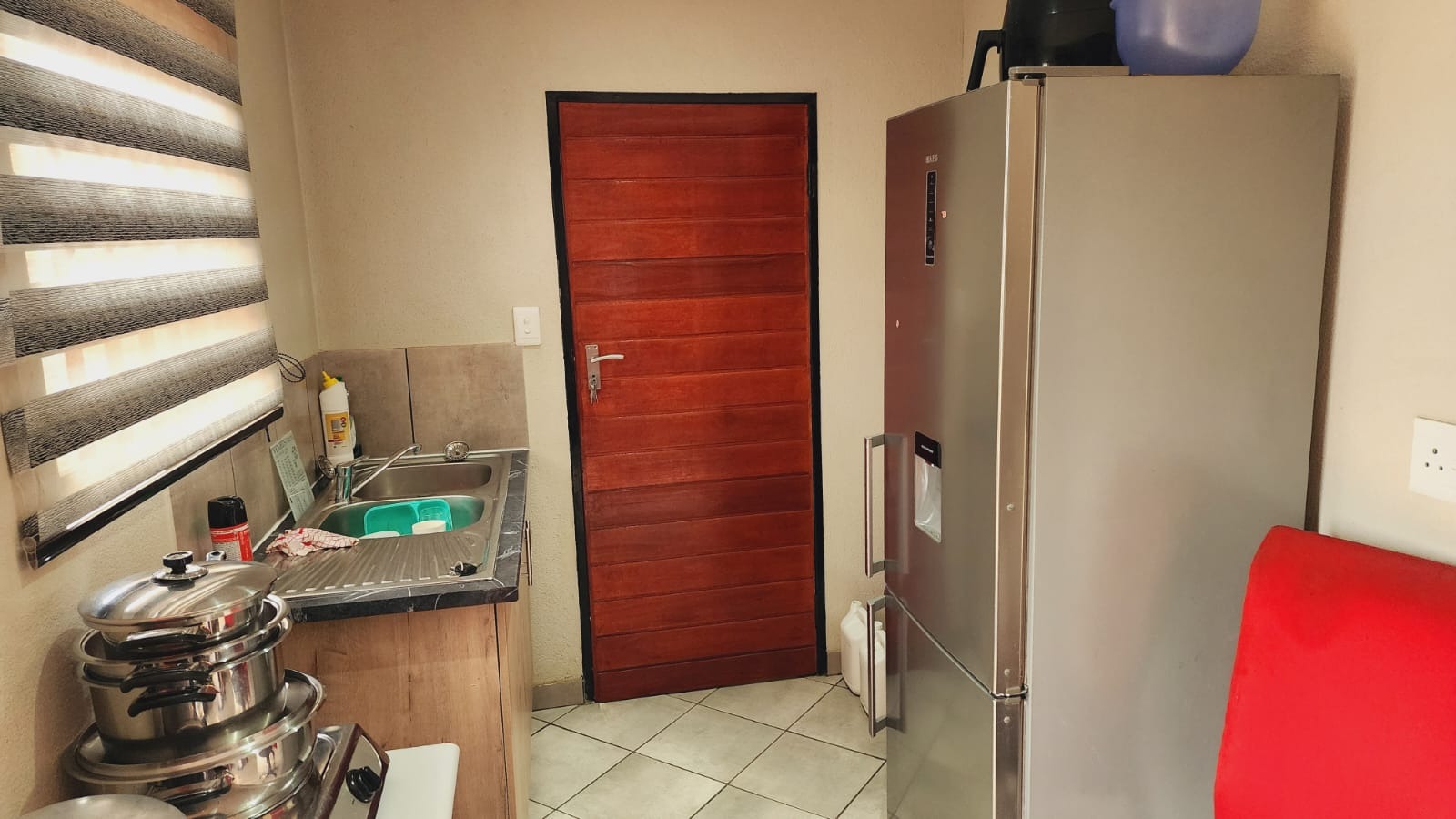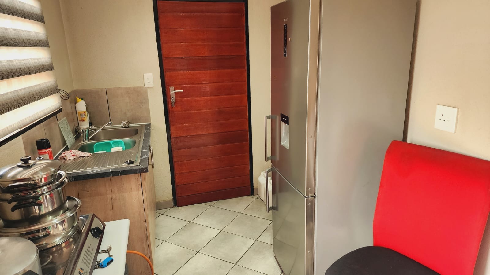 Step inside to find a functional interior designed for comfortable living. The home features tiled flooring throughout, ensuring easy maintenance. The compact kitchen is equipped with a modern stainless steel refrigerator, a practical sink with a tiled backsplash, and light wood-effect cabinetry, providing essential amenities for daily meal preparation. While currently featuring a portable gas stove, this space offers potential for future upgrades to suit your culinary preferences. The living area provides a versatile space, ready to be furnished to your taste, complete with window blinds for privacy and light control.The house does not have fitted warddrobes in the bedrooms.