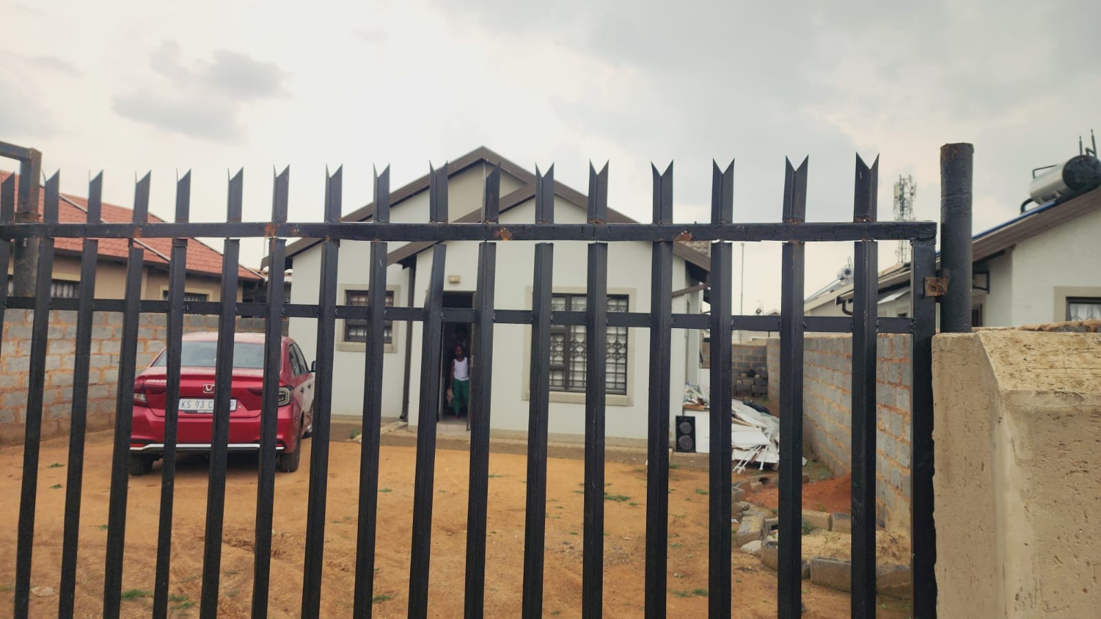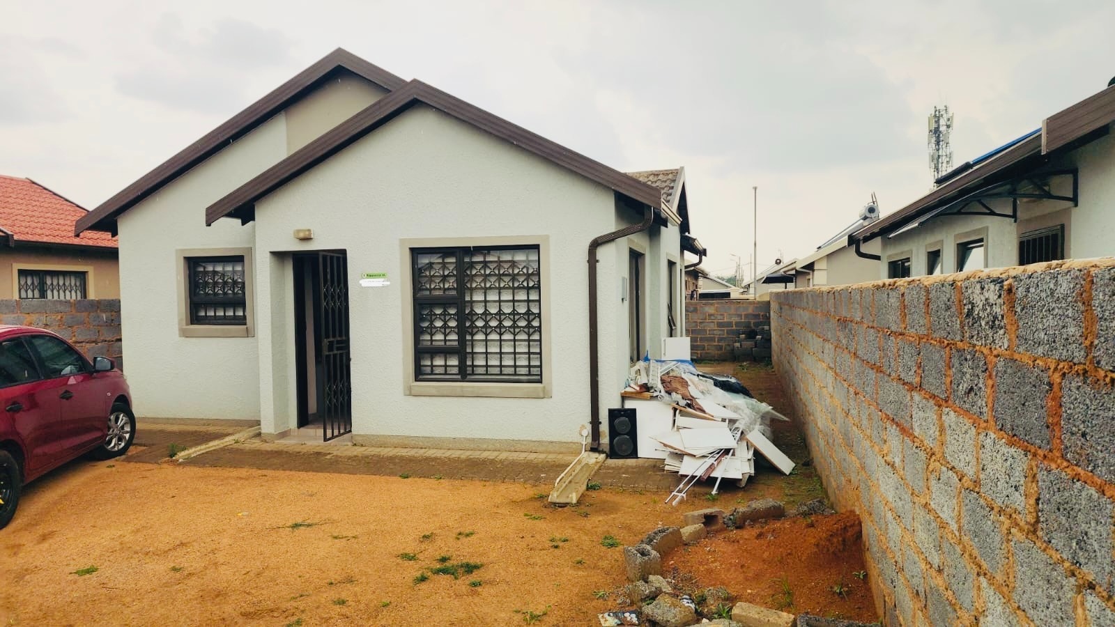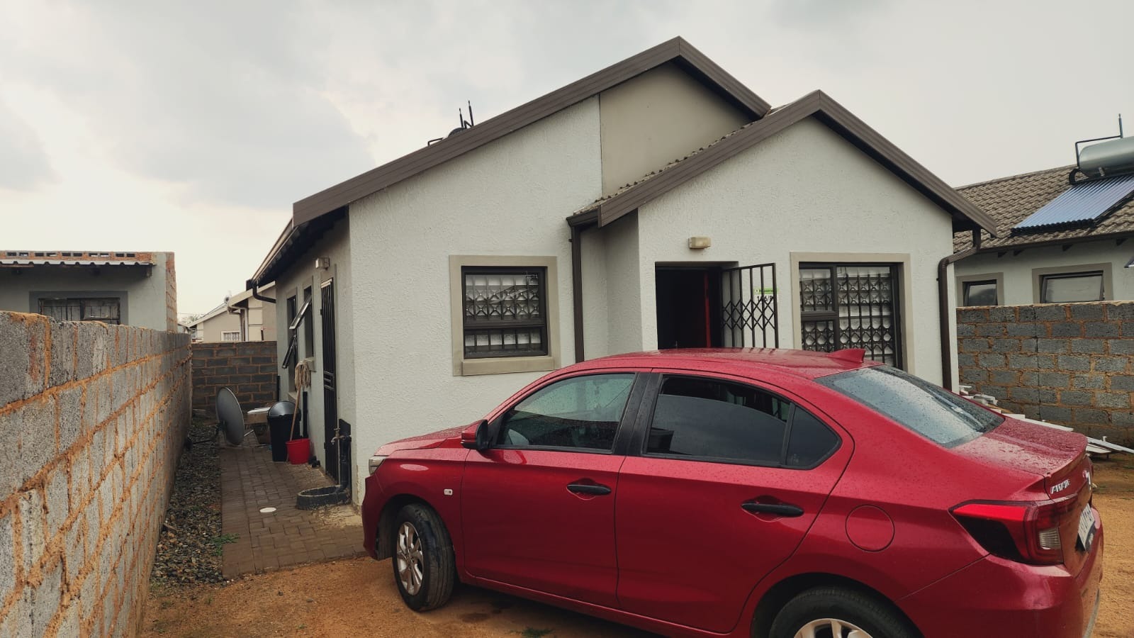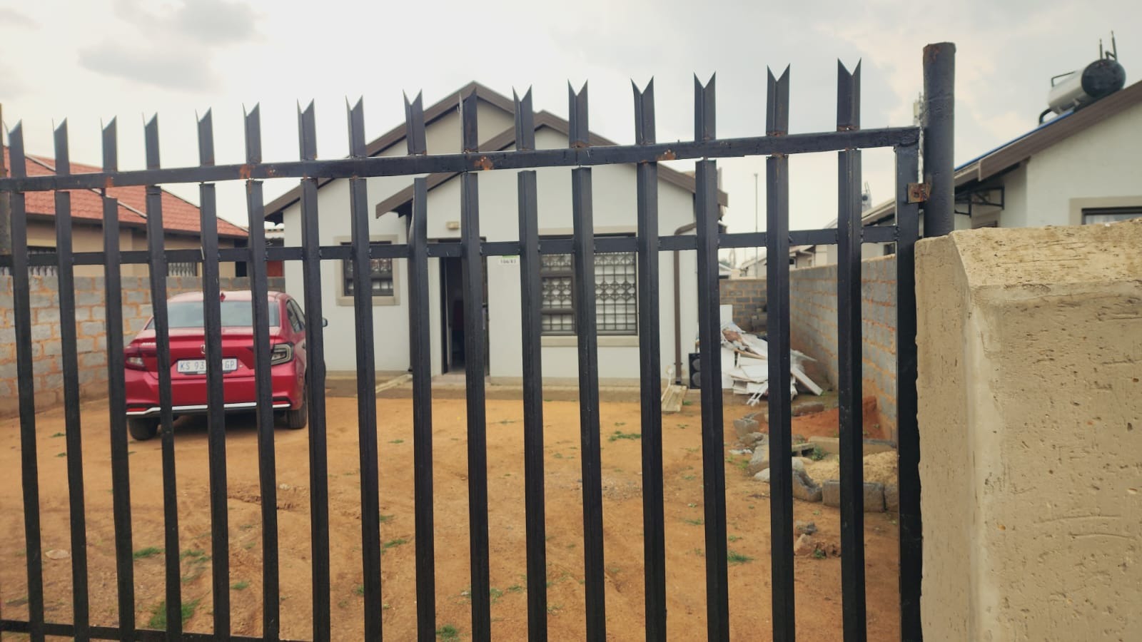 Security is a key feature of this property, with robust window bars, a secure entrance gate, and a spike fence ensuring peace of mind. While the exterior currently presents an unlandscaped dirt yard with an unfinished boundary wall, this offers a blank canvas for the new owner to design their dream garden, create a paved driveway, or add personalized outdoor living spaces on the 202 sqm erf.