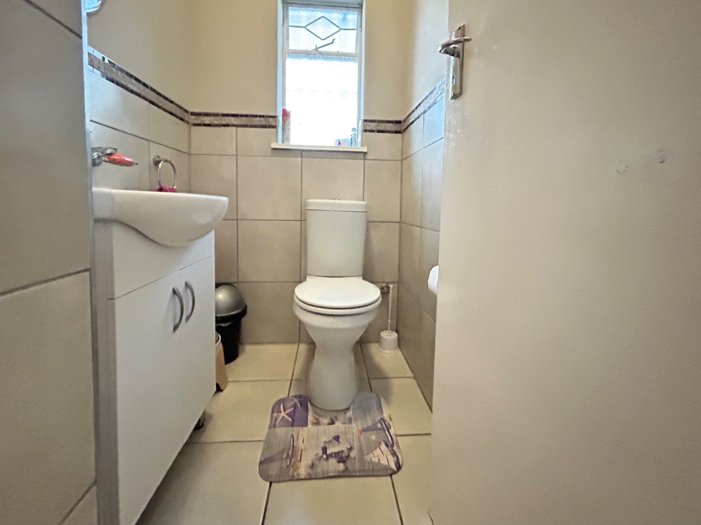 This home offers three comfortable bedrooms, each providing a neutral canvas for personal touches. The bedrooms benefit from built-in wardrobes, ensuring generous storage solutions. The main bathroom is equipped with a modern vanity sink, tiled walls and floor for easy maintenance, and a bathtub, while an additional guest toilet adds to the home's convenience.
