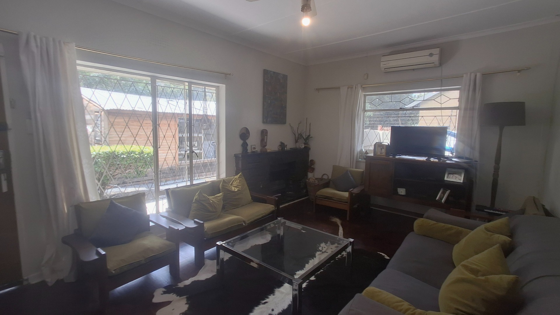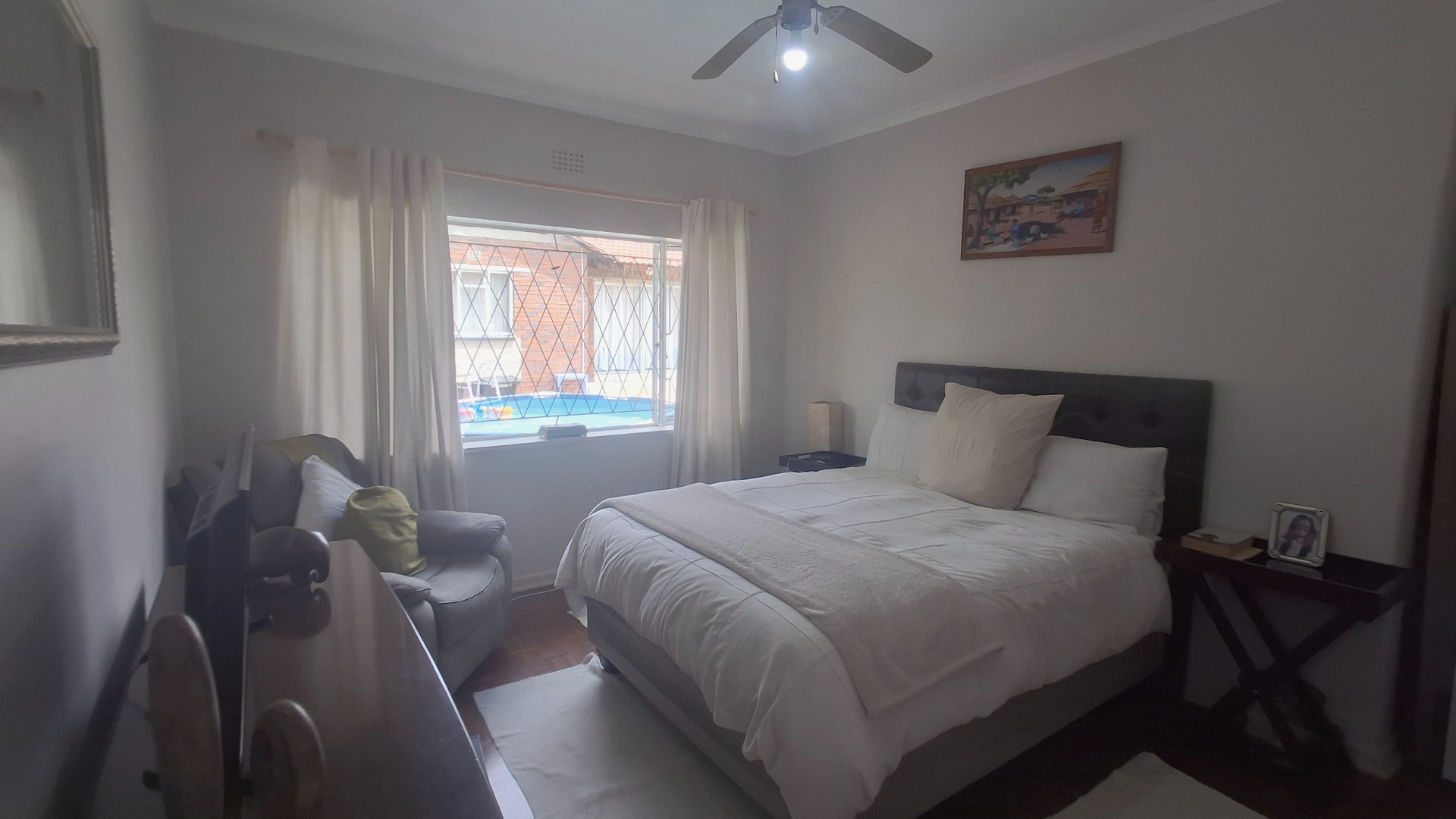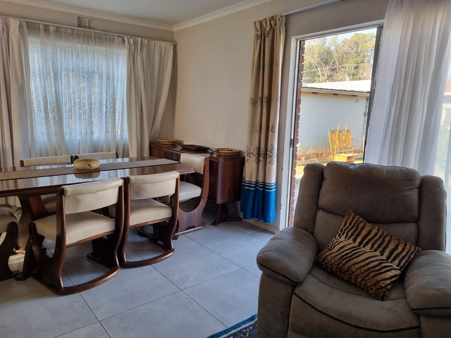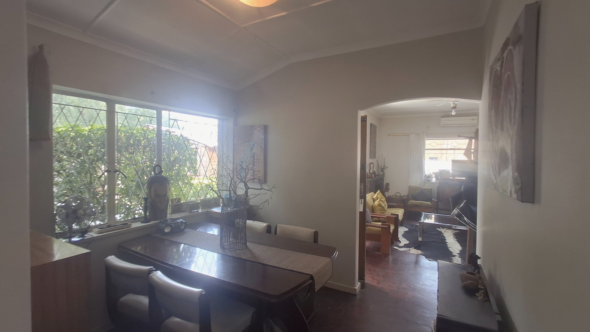 Step inside to a welcoming interior featuring a spacious lounge and a dedicated dining room, both adorned with warm hardwood flooring. Natural light floods these areas through large windows, creating a bright and airy atmosphere. Designed for year-round enjoyment, the lounge features a ceiling fan to maintain a pleasant breeze and a traditional fireplace that sets the perfect mood for cooler nights. Arched doorways add architectural character, leading to the functional kitchen, equipped for daily living. The home provides three comfortable bedrooms and a well-appointed bathroom, catering to household needs with a practical flow.