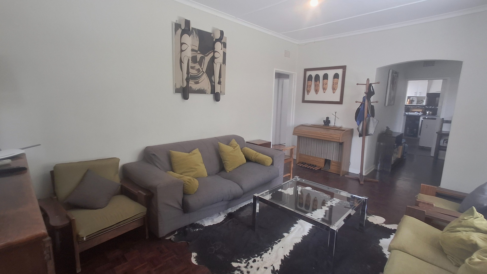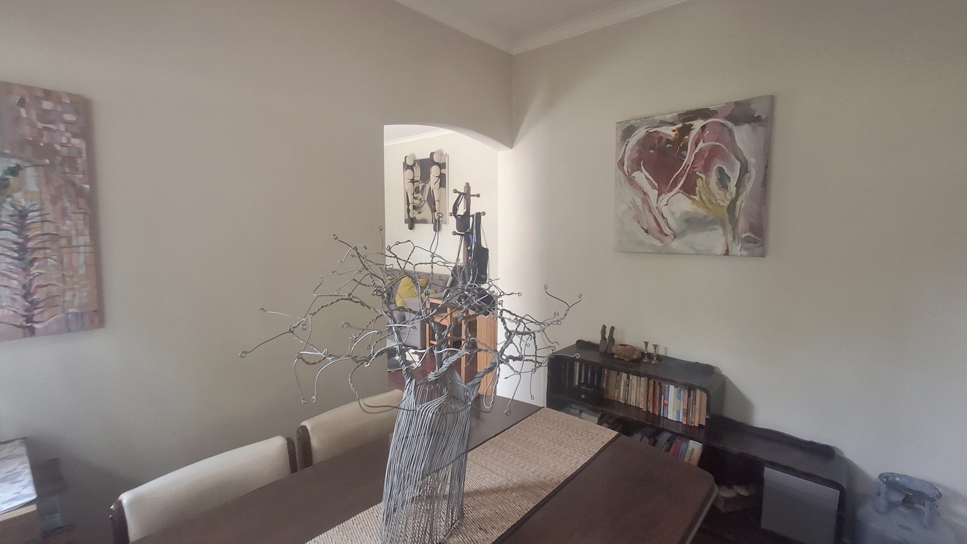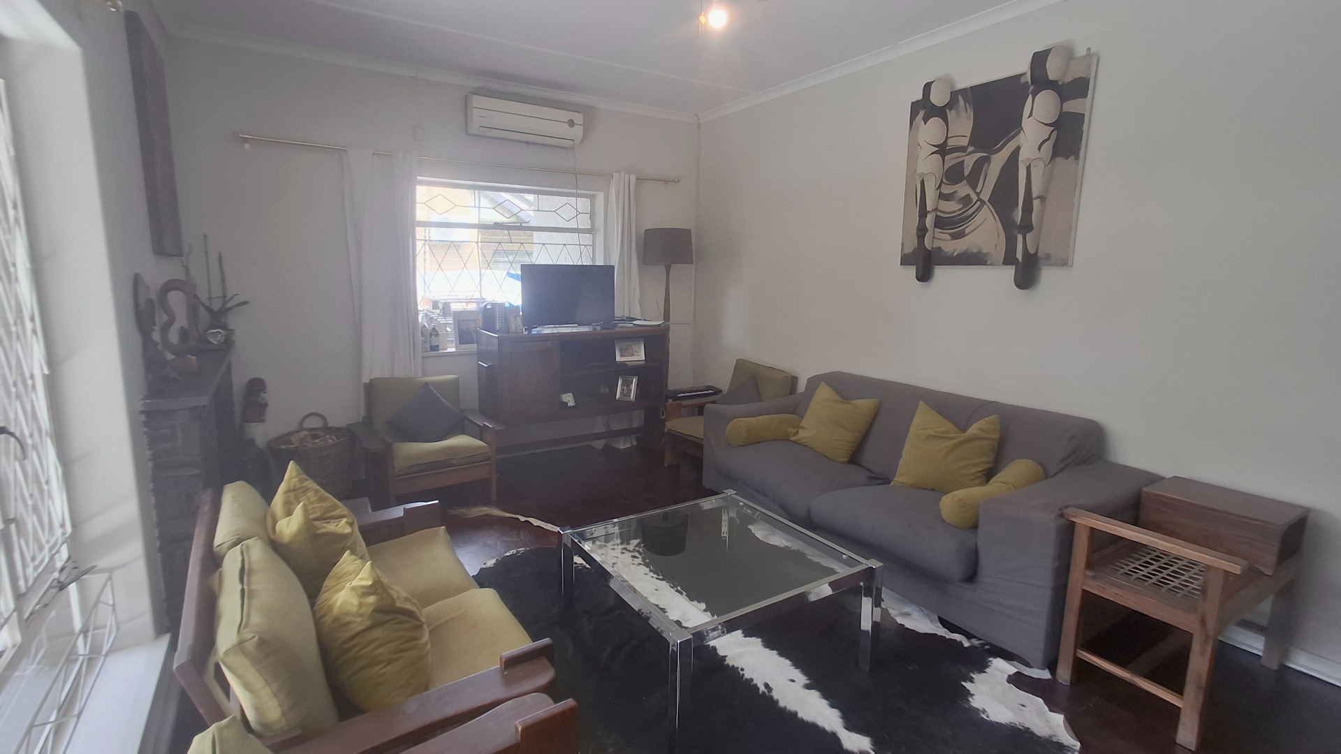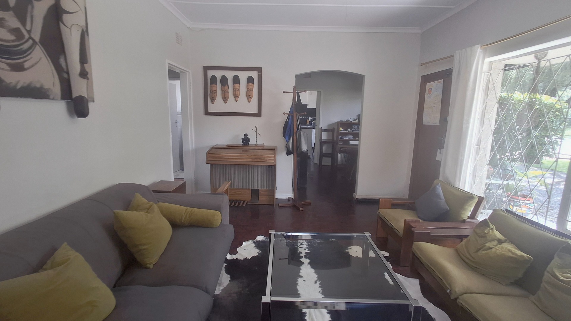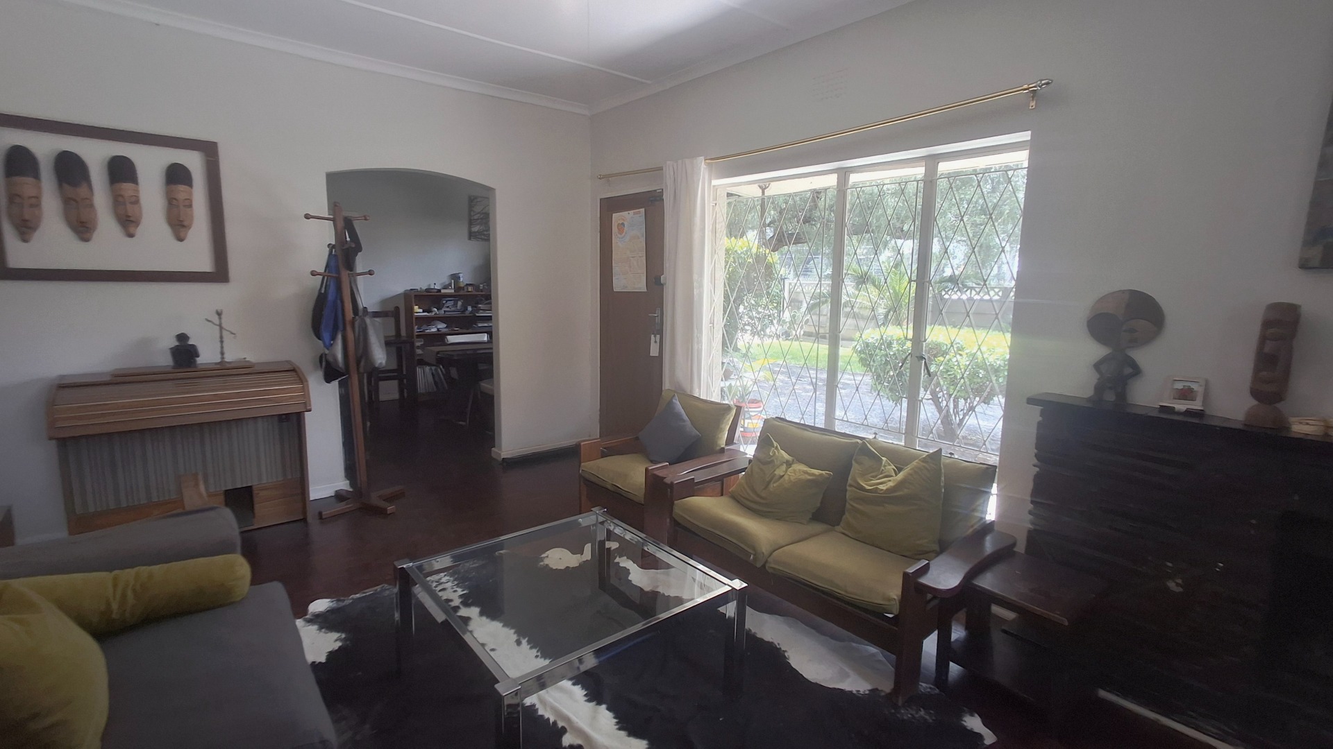 Step inside to a welcoming interior featuring a spacious lounge and a dedicated dining room, both adorned with warm hardwood flooring. Natural light floods these areas through large windows, creating a bright and airy atmosphere. Designed for year-round enjoyment, the lounge features a ceiling fan to maintain a pleasant breeze and a traditional fireplace that sets the perfect mood for cooler nights. Arched doorways add architectural character, leading to the functional kitchen, equipped for daily living. The home provides three comfortable bedrooms and a well-appointed bathroom, catering to household needs with a practical flow.