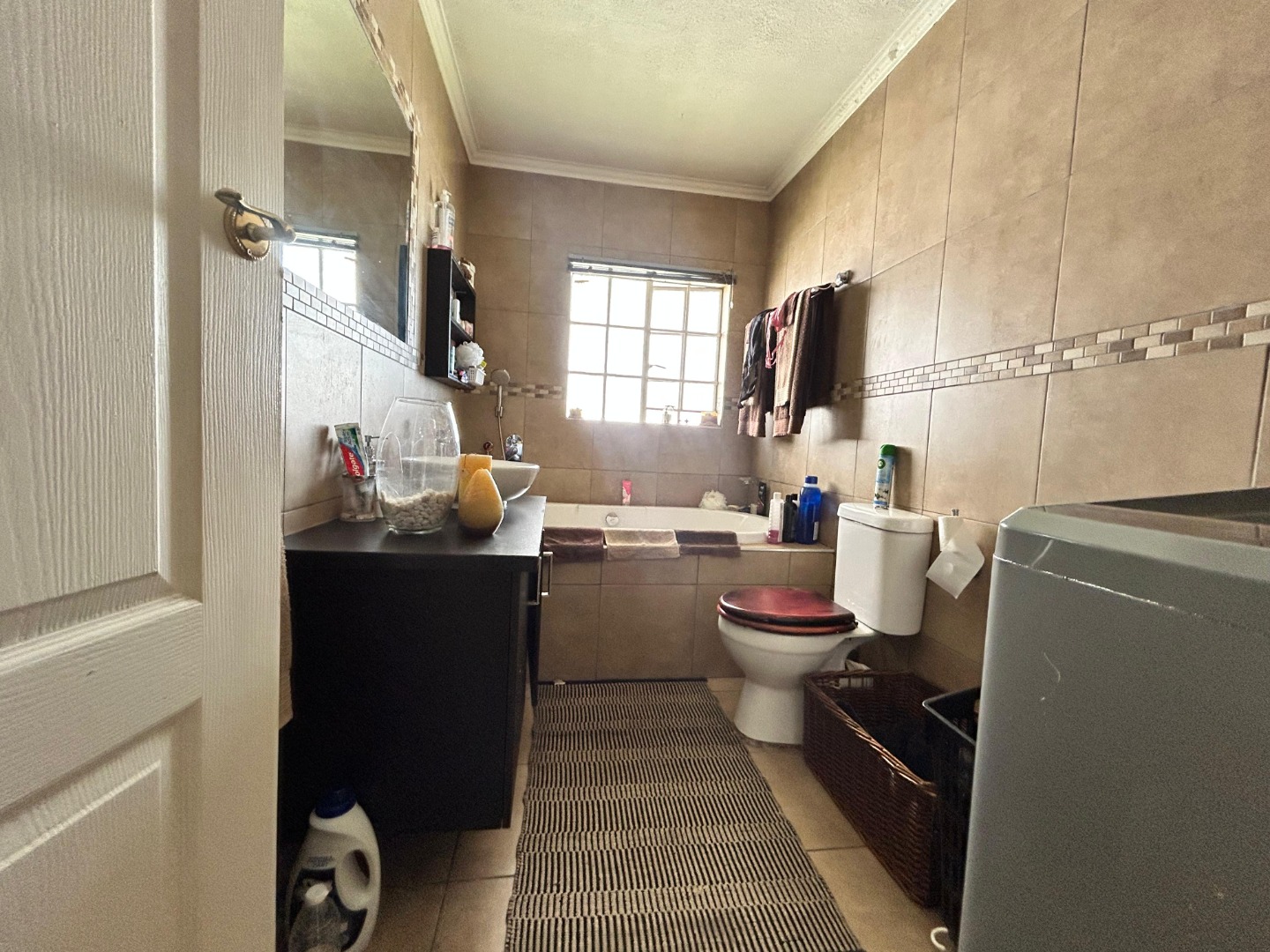 The rustic-style kitchen features wooden cabinetry, a tiled floor, and exposed ceiling beams, providing a warm and functional space for culinary pursuits. Natural light streams in through a window, and an integrated dishwasher adds convenience. The home offers three comfortable bedrooms and two bathrooms, with one bathroom fully tiled and including a bathtub and vanity.