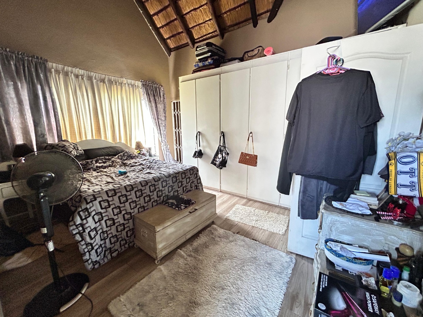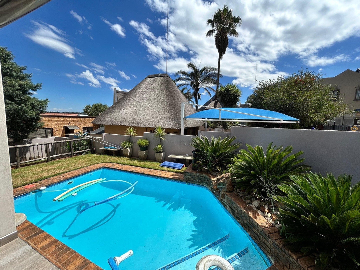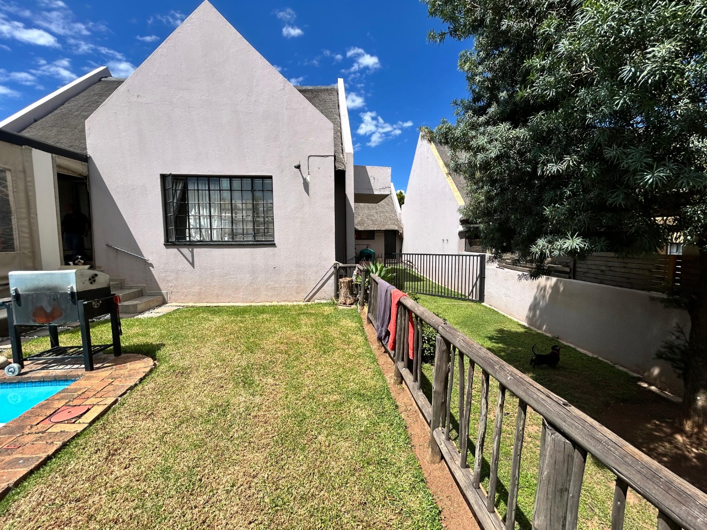 Discover this distinctive 3-bedroom, 2-bathroom residence nestled in the suburban heart of Elandshaven, Germiston. Boasting a unique thatched roof design, this property immediately captures attention with its charming kerb appeal. Secure gated access, a paved driveway, and a well-maintained garden with mature landscaping create an inviting first impression, complemented by visible 24-hour security signage for peace of mind.