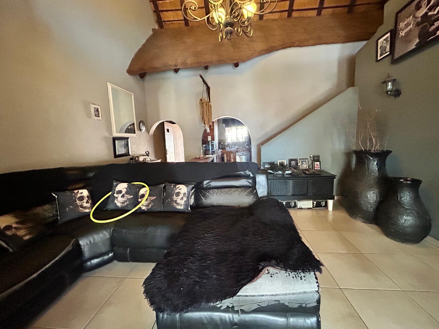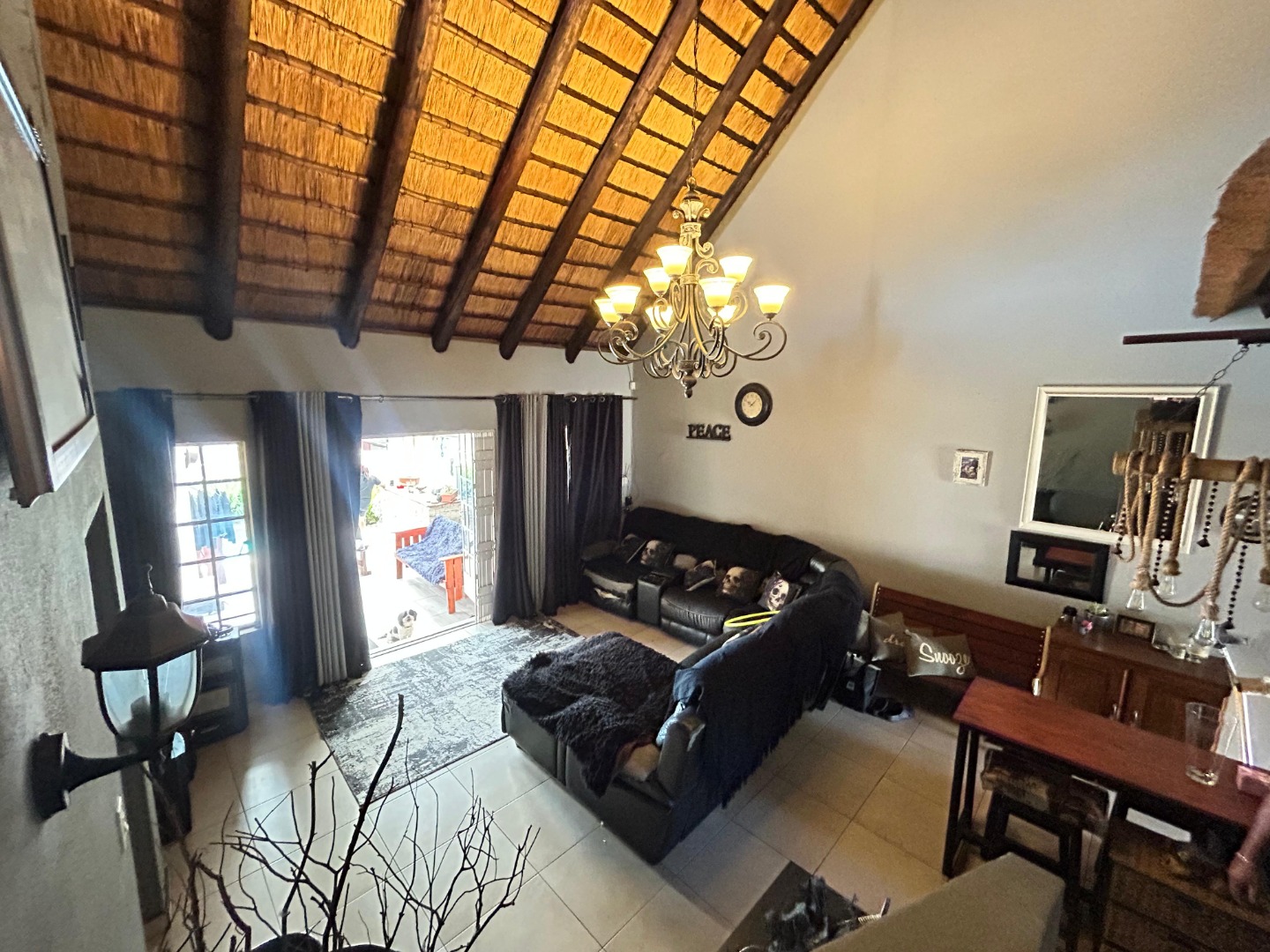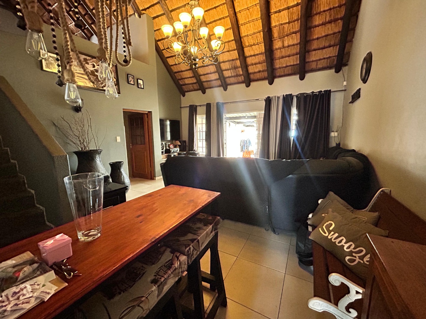 The interior unfolds into a spacious, open-plan living area, characterized by striking vaulted thatched ceilings and elegant chandeliers that add significant architectural character. Durable tiled flooring extends throughout these communal spaces, which include a dedicated lounge and dining room, offering ample room for relaxation and entertaining. Large glass doors provide excellent natural light and seamless access to the outdoor areas, enhancing the flow of the home.