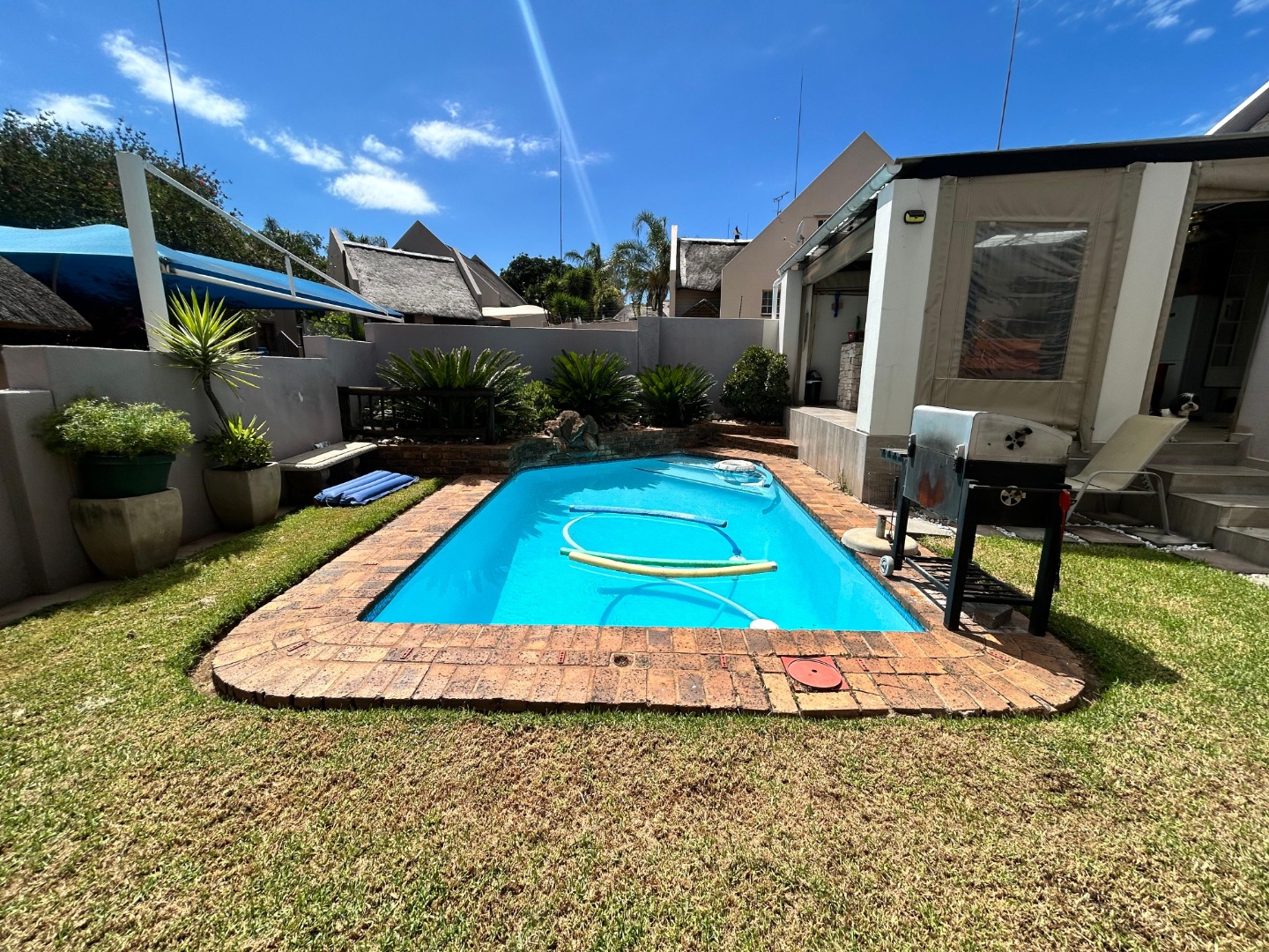 Outdoor living is a highlight, with a private pool and deck perfect for leisure and entertaining. The property also features a lapa, ideal for outdoor gatherings, and a well-maintained garden. Practical amenities include a double garage, domestic rooms, and the property is pet-friendly, making it suitable for families. Security is enhanced by a fence, access gate, and burglar bars.