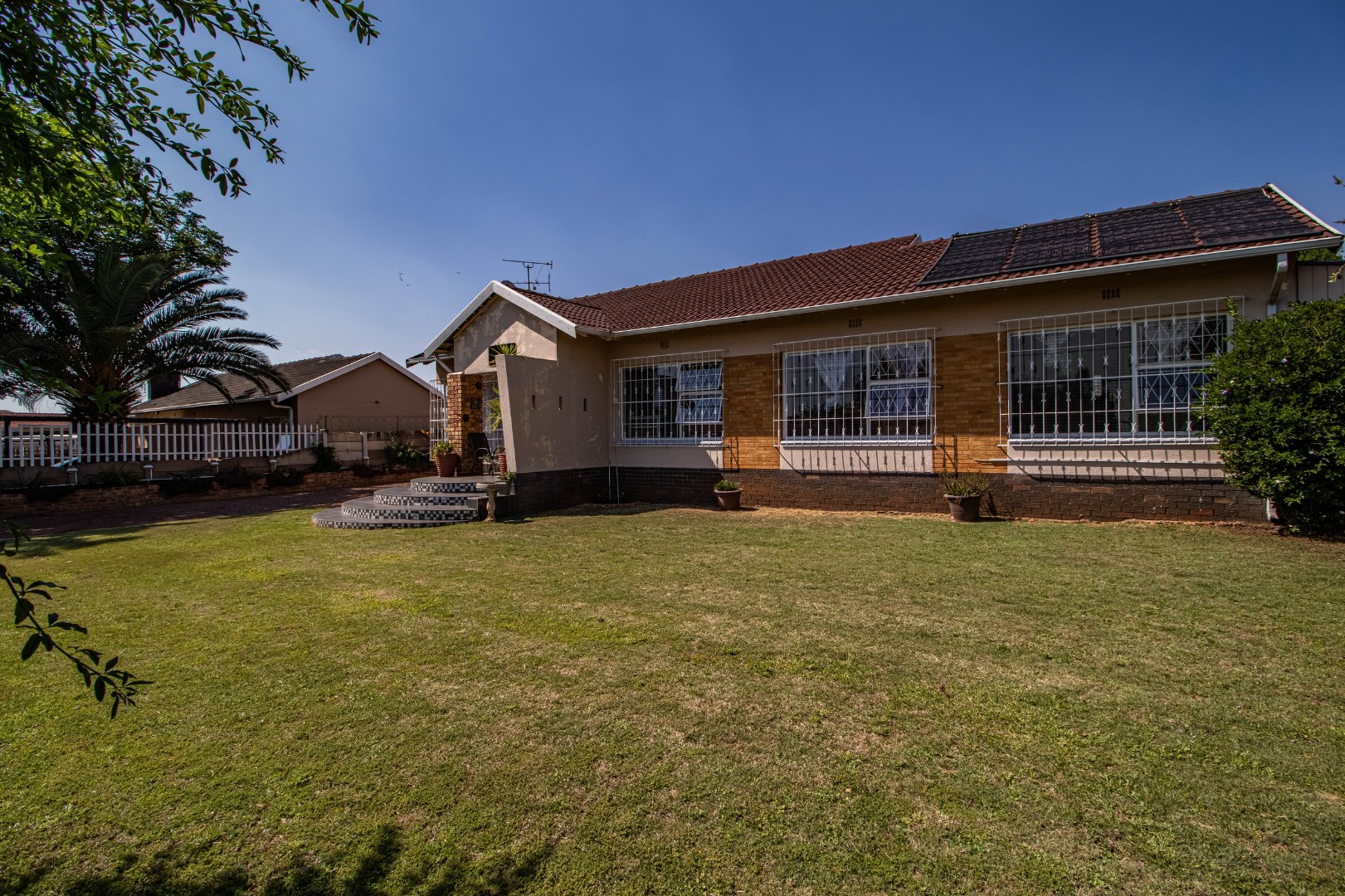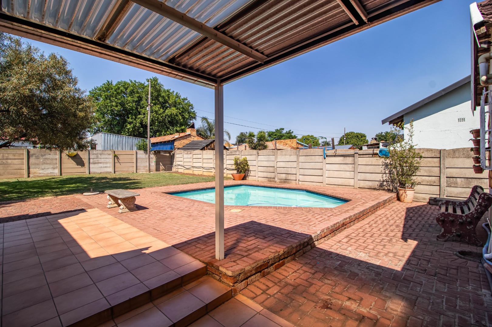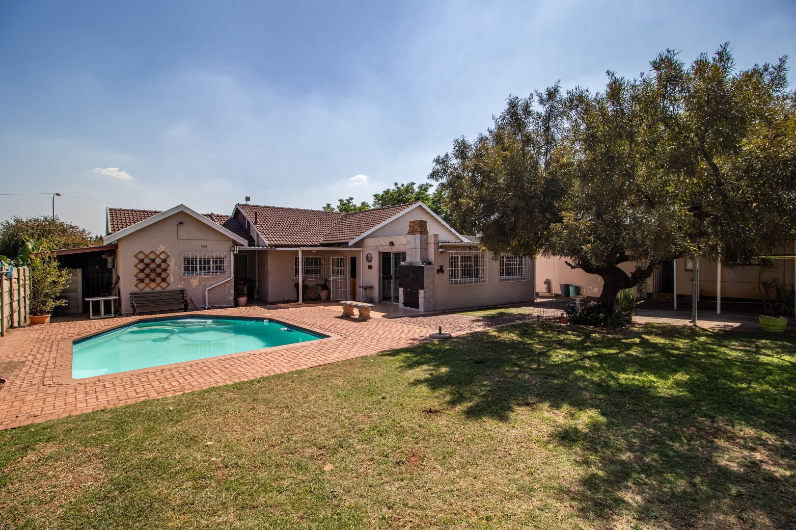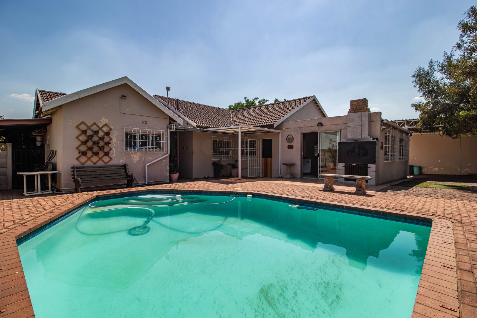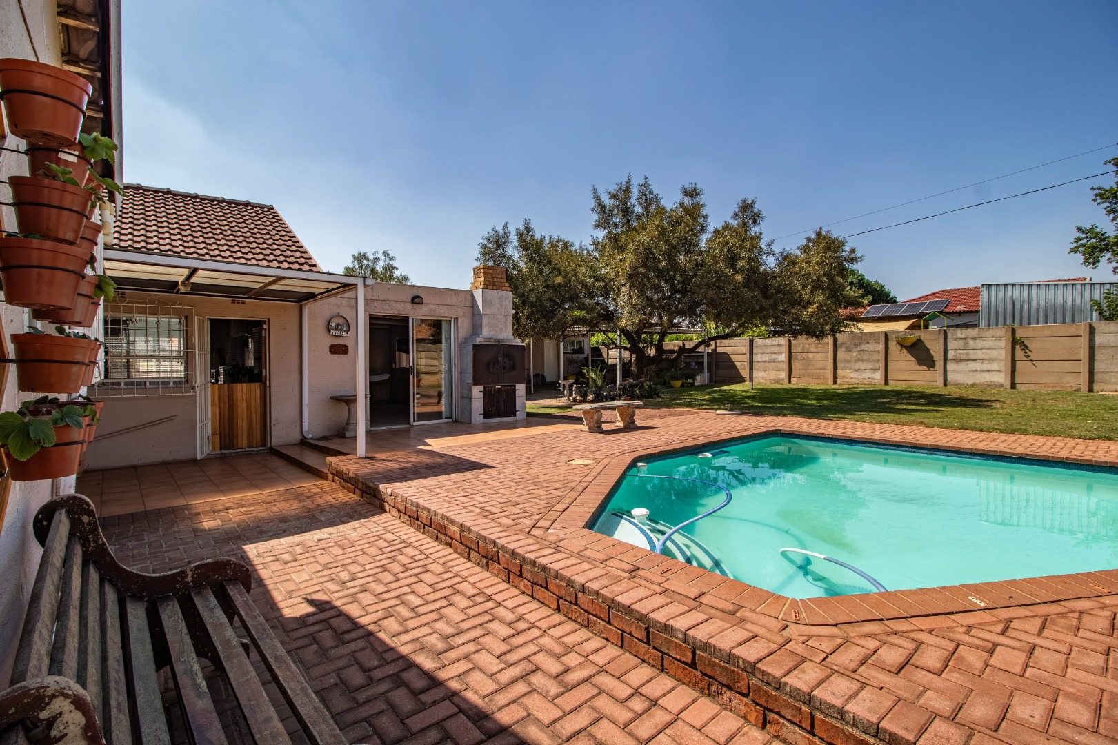 Outdoors, the expansive grounds host a sparkling swimming pool, offering a refreshing escape during warmer months. Parking is abundant with a single garage and additional space for three vehicles. The property also includes convenient domestic rooms and is pet-friendly, catering to every family need. Security is paramount, featuring robust burglar bars and a security gate for peace of mind.