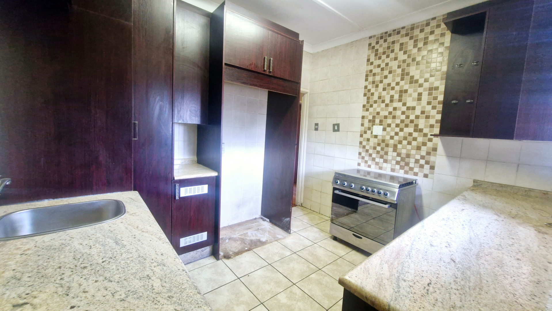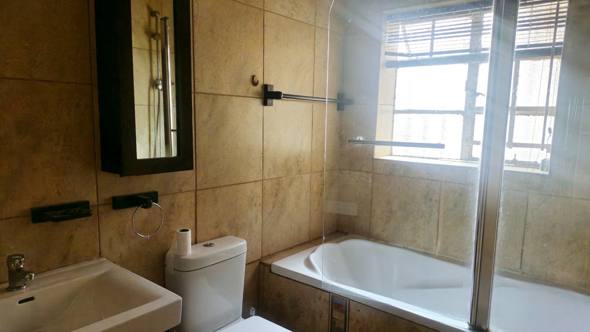 The modern Kitchen is fitted with a Gas stove, built-in cupboards, and a pantry. Other features include 3 Bedrooms—all with built-in cupboards—and 1 bathroom with a shower–over–bath, basin, and toilet.