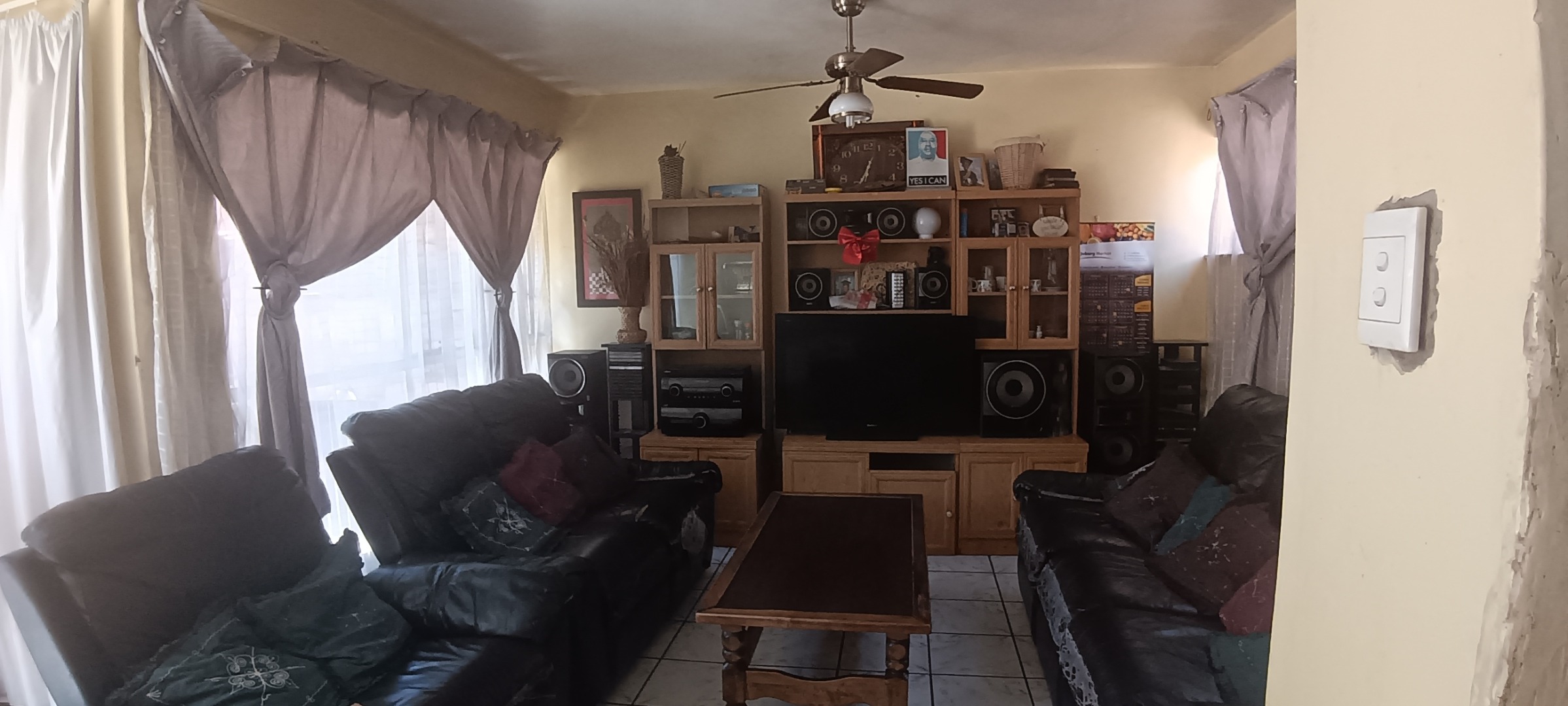 Step inside to a welcoming entryway, featuring practical tiled flooring and ample natural light, leading seamlessly into the main living areas. The home offers a distinct lounge and a separate dining room, creating versatile spaces for both daily living and entertaining guests. Large windows throughout ensure a bright and airy ambiance, with a functional ceiling fan in the living room providing comfort. The kitchen, equipped with a modern stainless steel fridge and a tiled backsplash, provides existing cabinetry and countertop space, ready for a contemporary upgrade to unlock its full potential as the heart of the home. An internal staircase indicates a multi-level layout, adding to the property's spacious feel.