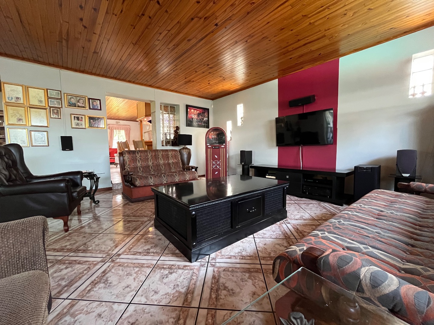 Upon entering, you are welcomed by a spacious open-plan samlessly integrated with a bar area, creating a warm and inviting athere. The entrance hall flows effortlessly into an elegant dining room, which leads to a modern kitchen fitted with granite countertops, a contemporary gas stove, and a dedicated laundry area. Multiple entertainment spaces, including additional bar, lounge, and dining areas, make this home ideal for hosting family and friends.