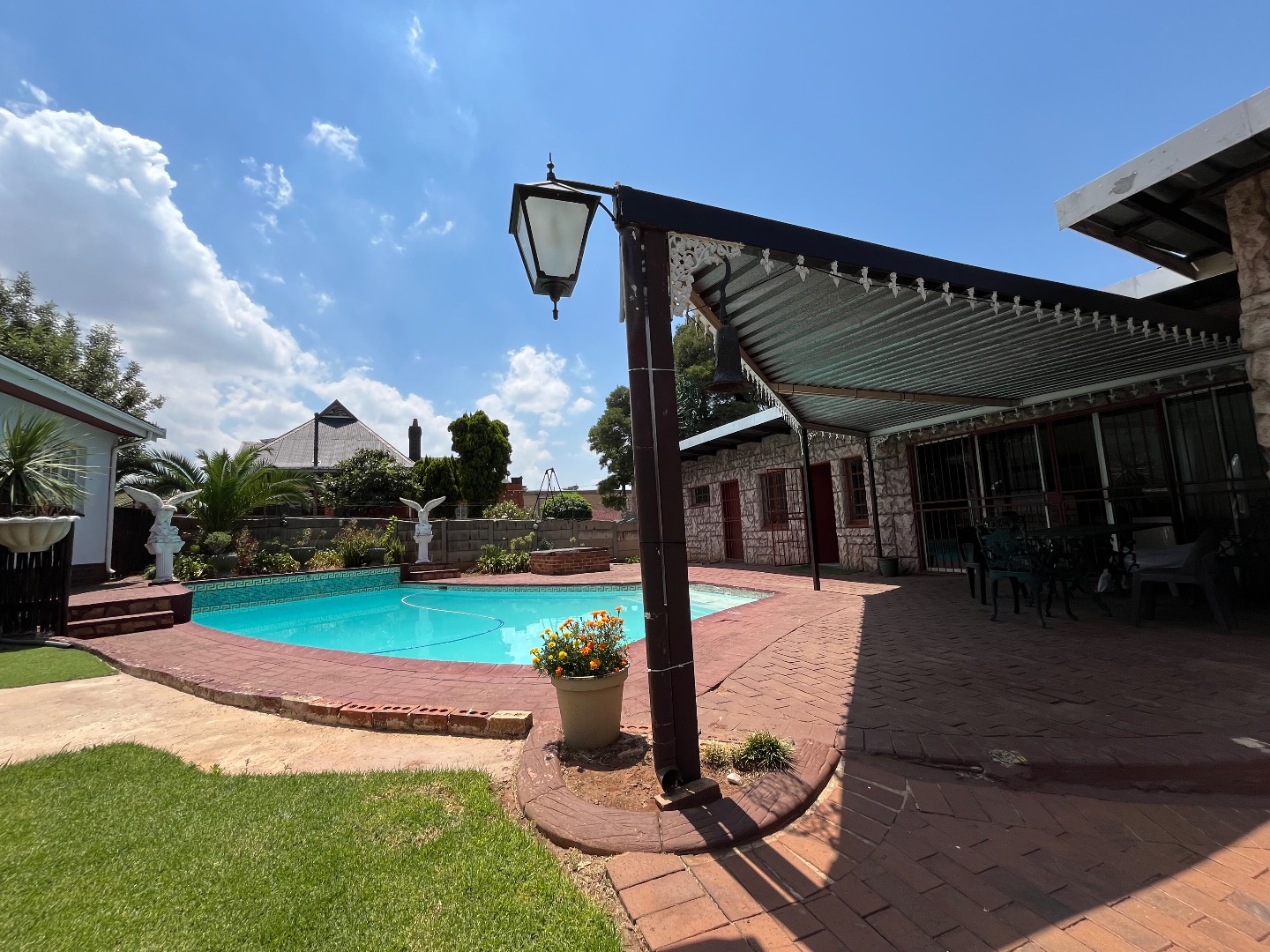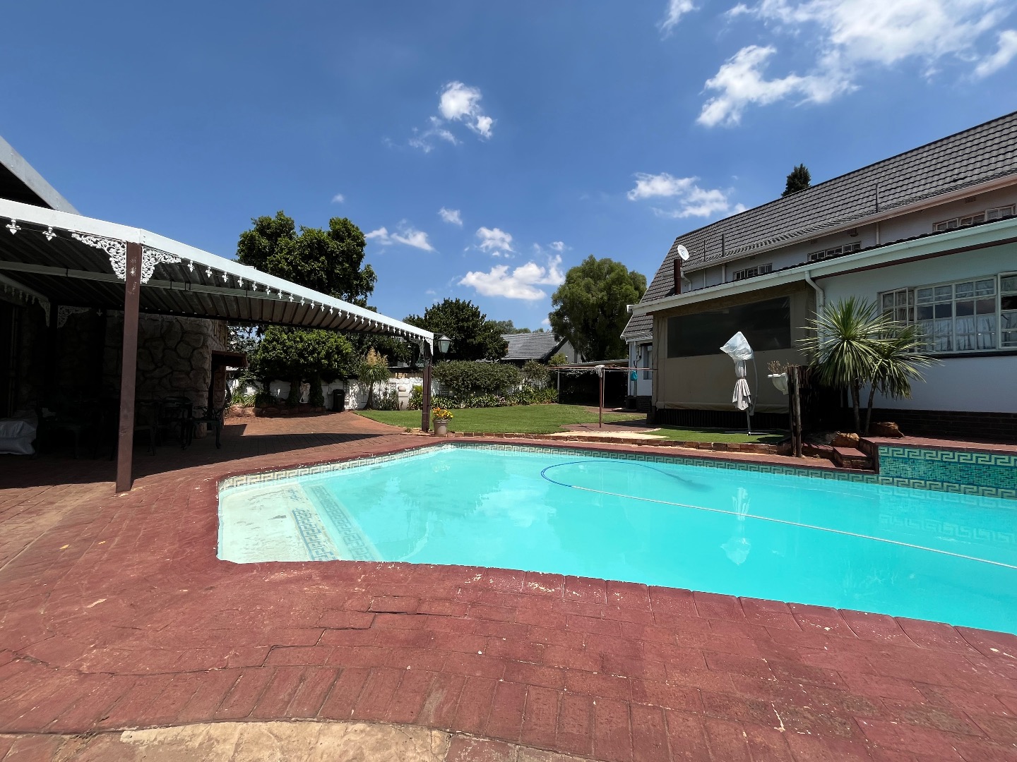 Stepping outside, the property boasts a lovely swimming pool, a covered carport, and a separate flatlet complete with one bedroom, a bathroom, its own kitchen, a sauna room, and an entertainment area—perfect for extended family, guests, or rental potential.