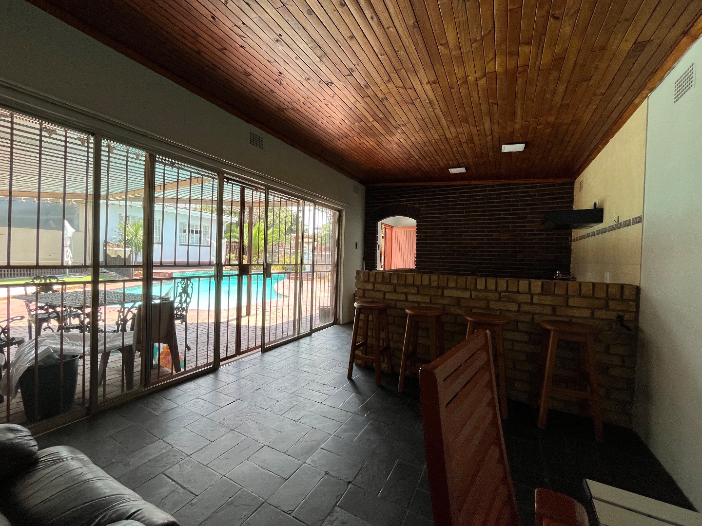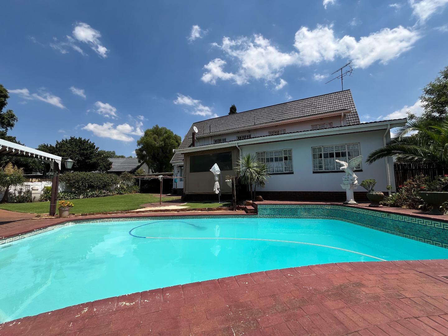Stepping outside, the property boasts a lovely swimming pool, a covered carport, and a separate flatlet complete with one bedroom, a bathroom, its own kitchen, a sauna room, and an entertainment area—perfect for extended family, guests, or rental potential.