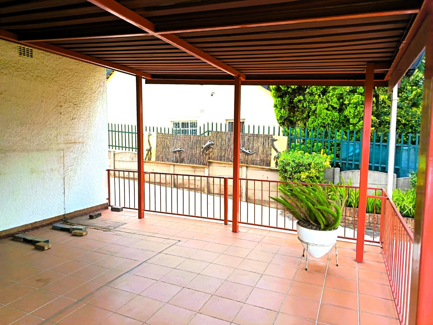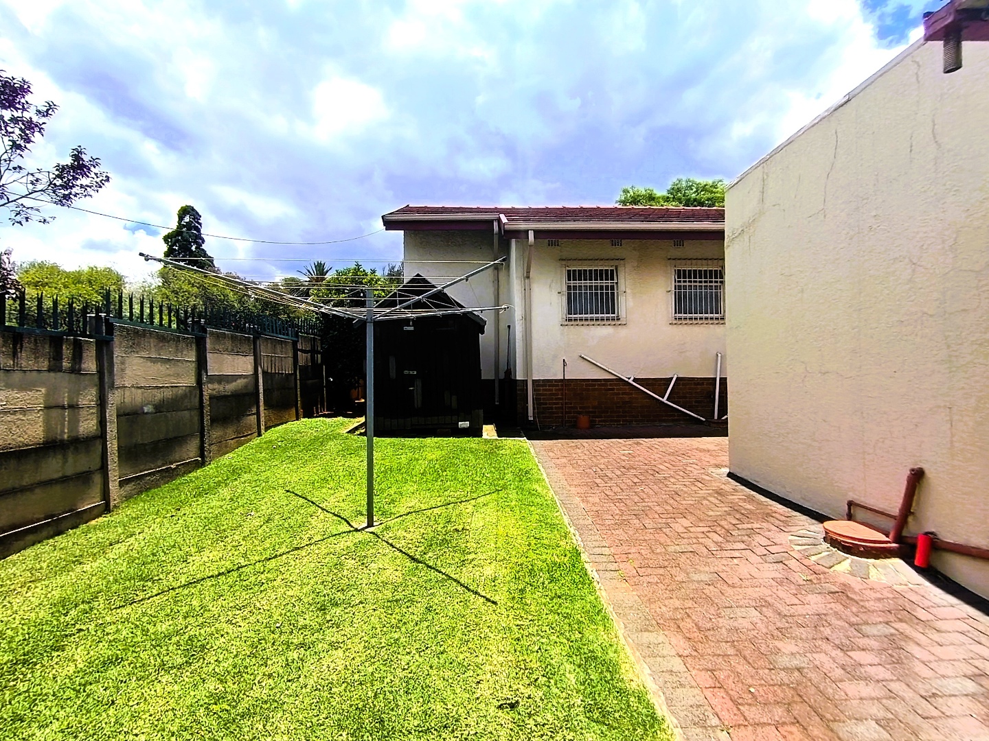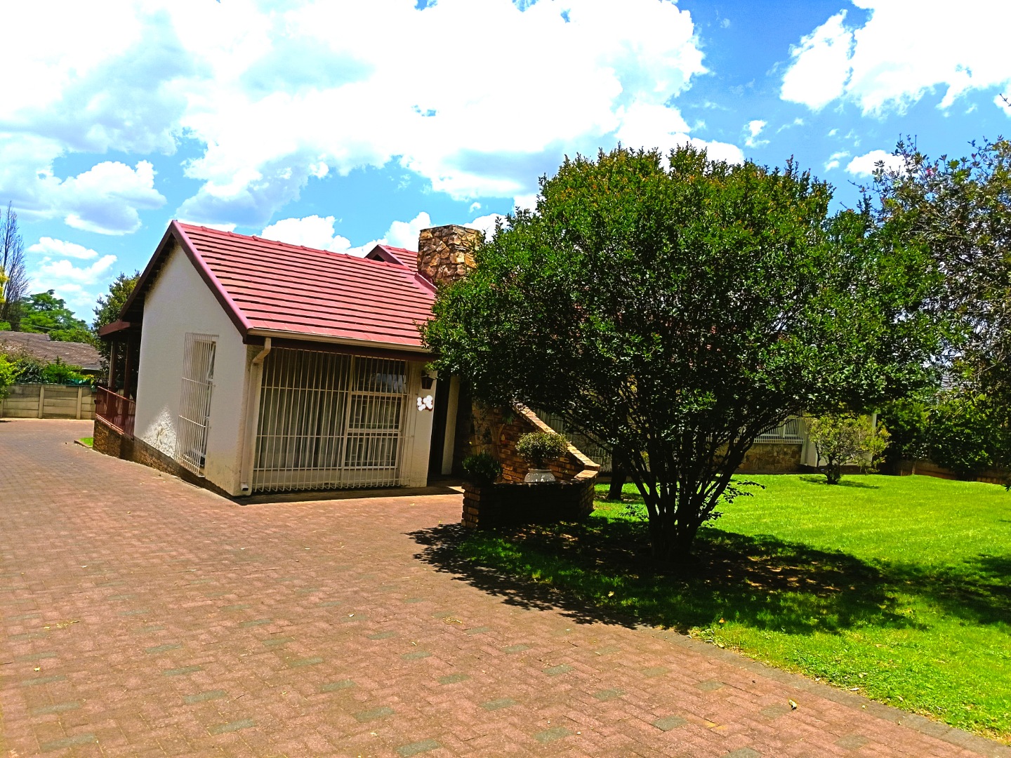 Outdoor living is facilitated by a covered patio or veranda, ideal for enjoying the garden views. The property includes a well-kept garden, paving, and practical amenities such as staff quarters, outside toilets, and a wendy house for additional storage. Security is a key feature, with an access gate and security bars on windows providing peace of mind. Pets are also welcome, making this an ideal home for animal lovers.