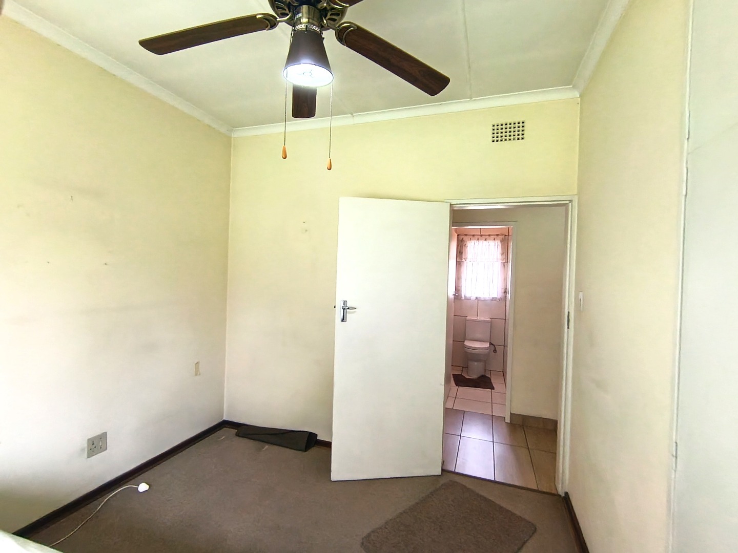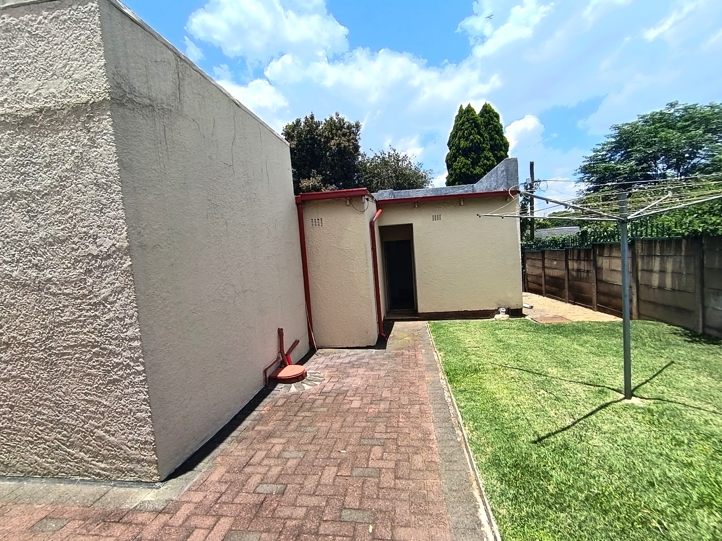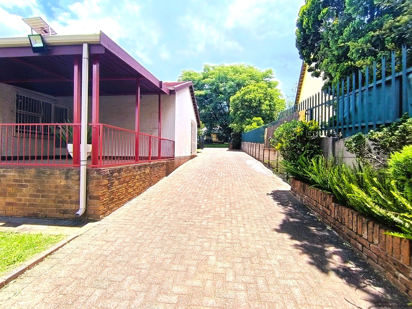 Outdoor living is facilitated by a covered patio or veranda, ideal for enjoying the garden views. The property includes a well-kept garden, paving, and practical amenities such as staff quarters, outside toilets, and a wendy house for additional storage. Security is a key feature, with an access gate and security bars on windows providing peace of mind. Pets are also welcome, making this an ideal home for animal lovers.