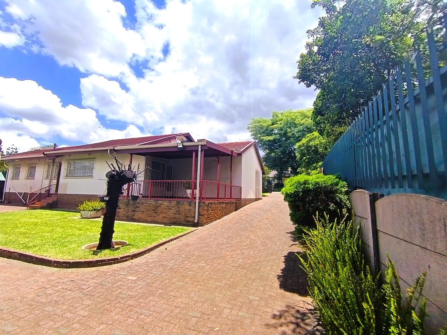 Discover this spacious 3-bedroom, 2.5-bathroom family home located in the established suburban area of Hazelpark, Germiston. Boasting a generous Erf size of 991 sqm and a floor size estimated to 240 sqm, this property offers ample space for comfortable living and outdoor enjoyment. The exterior presents a traditional aesthetic with a red tiled roof, white walls, and attractive stone cladding, complemented by a well-maintained green lawn and mature trees that enhance its curb appeal. A large paved driveway leads to a double carport, providing extensive parking for up to eight vehicles, ensuring convenience for residents and guests.