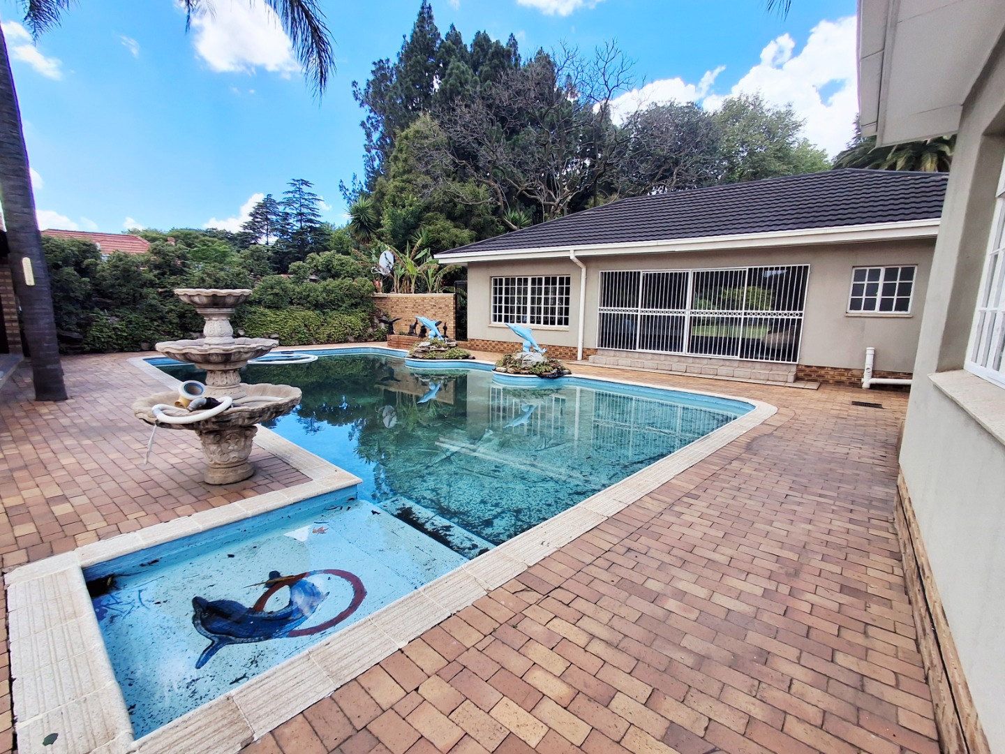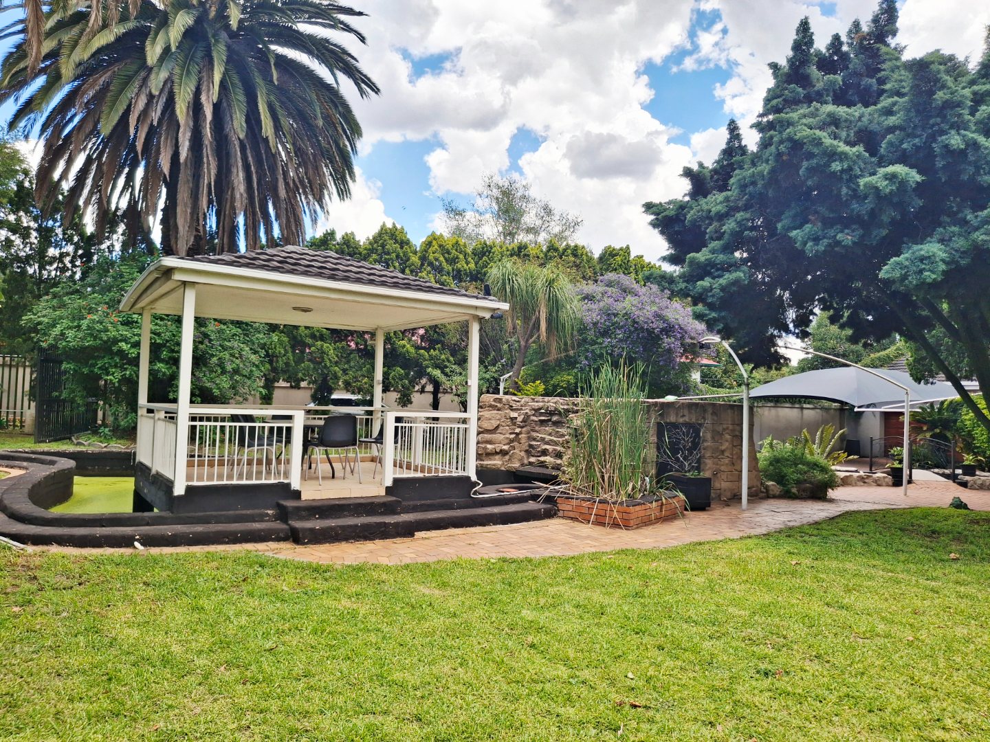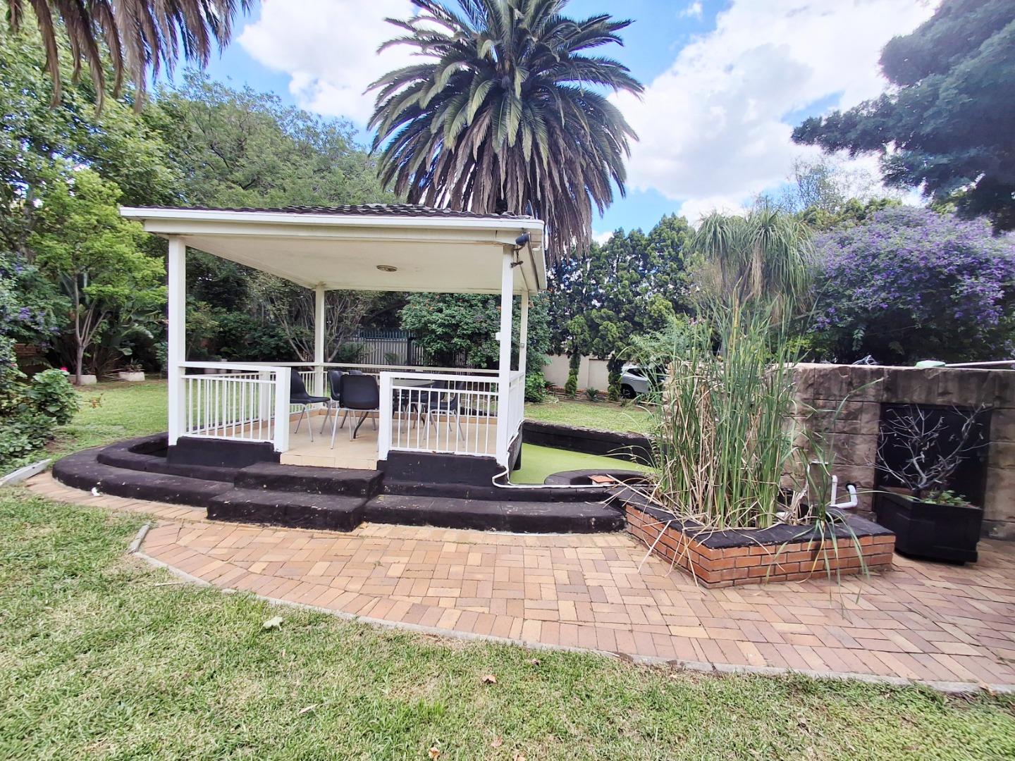 The outdoor spaces are a true highlight, designed for leisure and recreation. Enjoy a large swimming pool with a decorative fountain, a covered patio with a built-in braai, and a lapa, perfect for hosting gatherings. Sports enthusiasts will appreciate the private tennis court. The expansive, established garden boasts mature trees, a charming gazebo, a tranquil pond, and is maintained by a borehole and sprinkler system, creating a serene oasis.