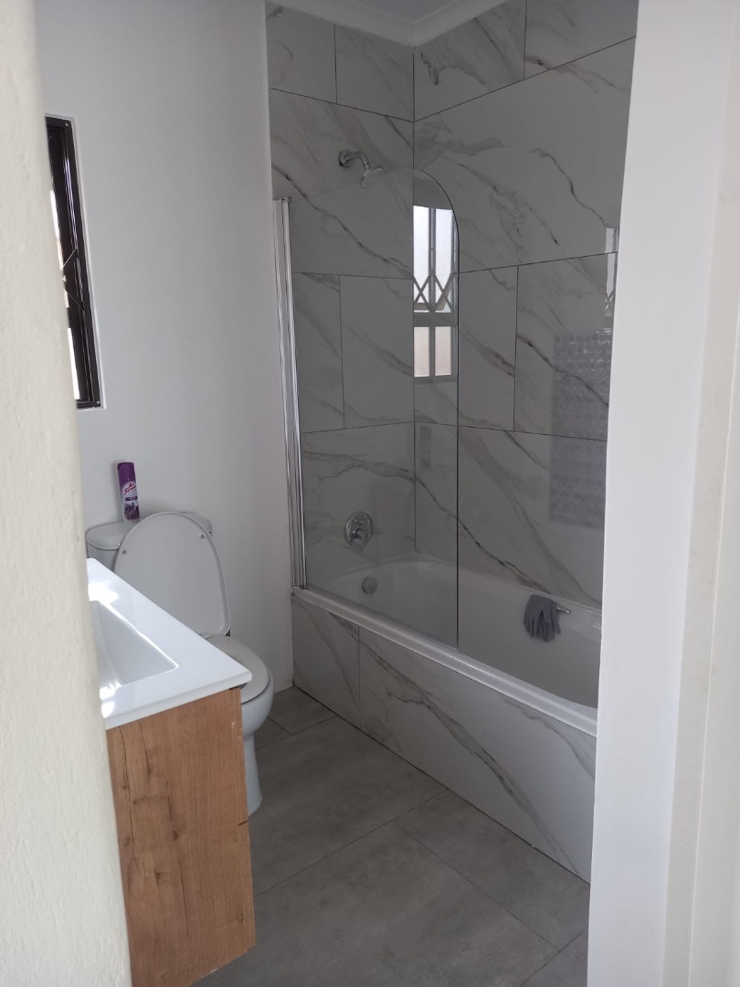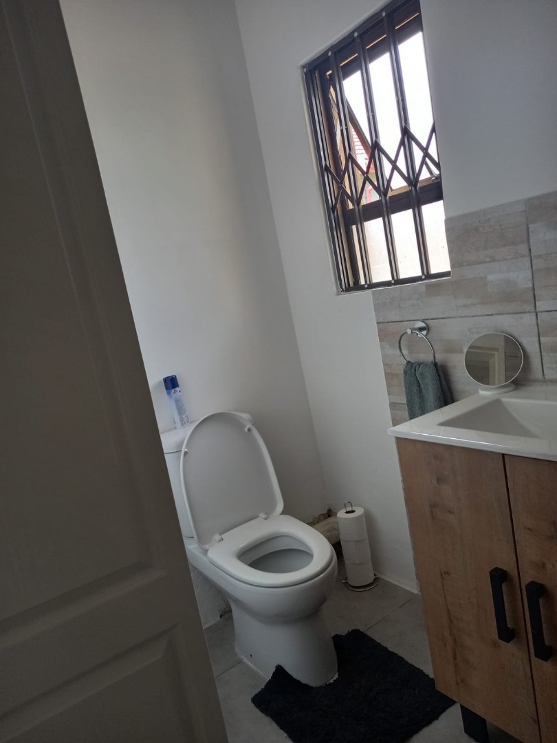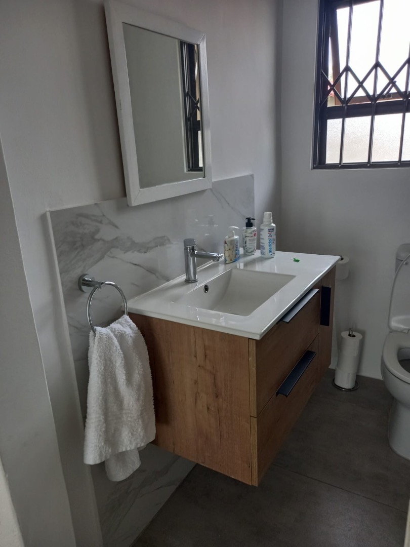 Step inside to find a thoughtfully laid out interior featuring four comfortable bedrooms and two well-appointed bathrooms. The main living areas include a dedicated lounge, a dining room perfect for family meals, and an additional family TV room, offering versatile spaces for relaxation and entertainment. The modern bathroom showcases a stylish floating wood-grain vanity with an integrated basin, a chic marble-look backsplash, and contemporary fixtures, all benefiting from good natural light. A significant advantage of this property is the inclusion of a flatlet, providing excellent potential for extended family living, guest accommodation, or rental income, further complemented by outside toilets for convenience.