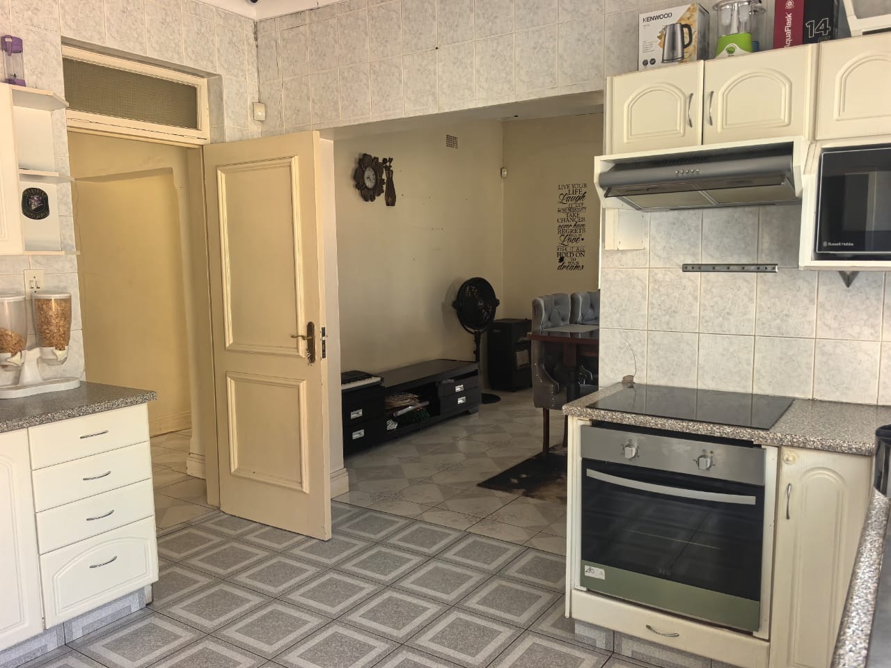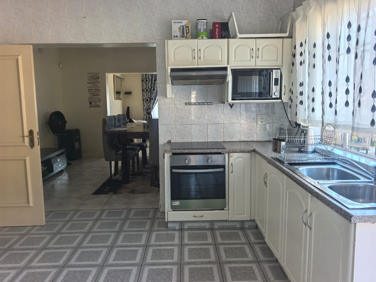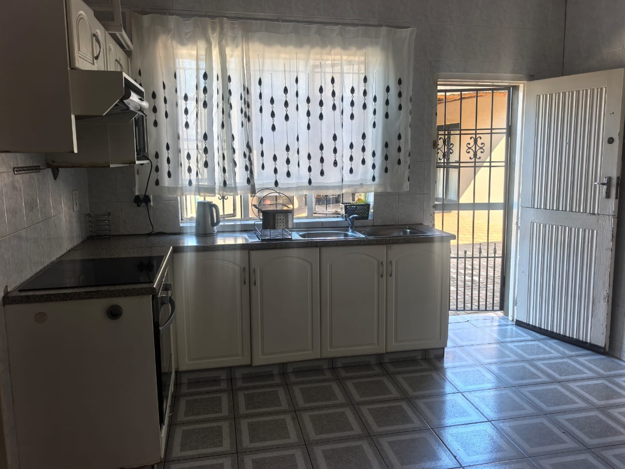 The kitchen is neatly finished, fully tiled, and fitted with a new stove and hob, with a separate laundry area.