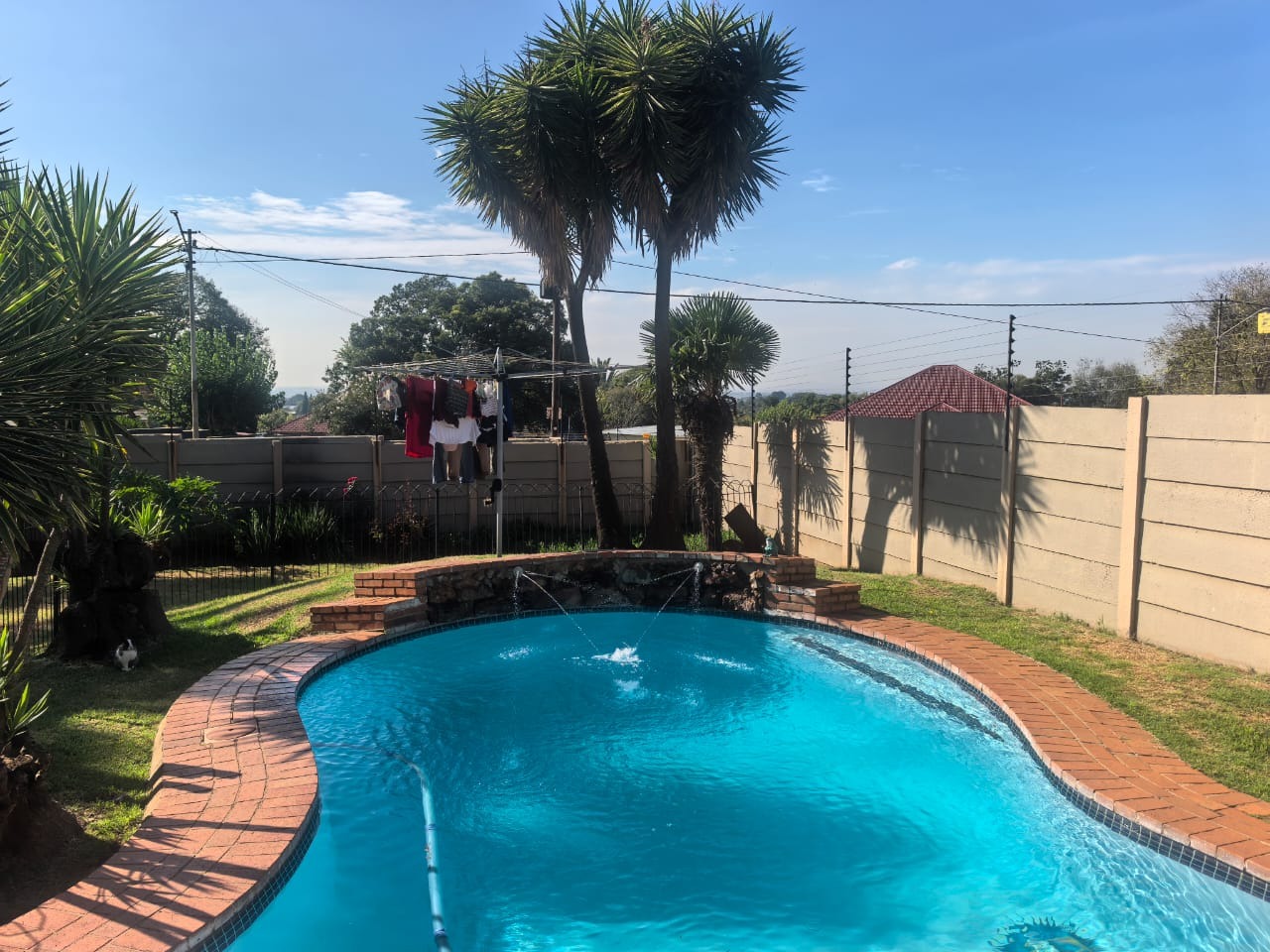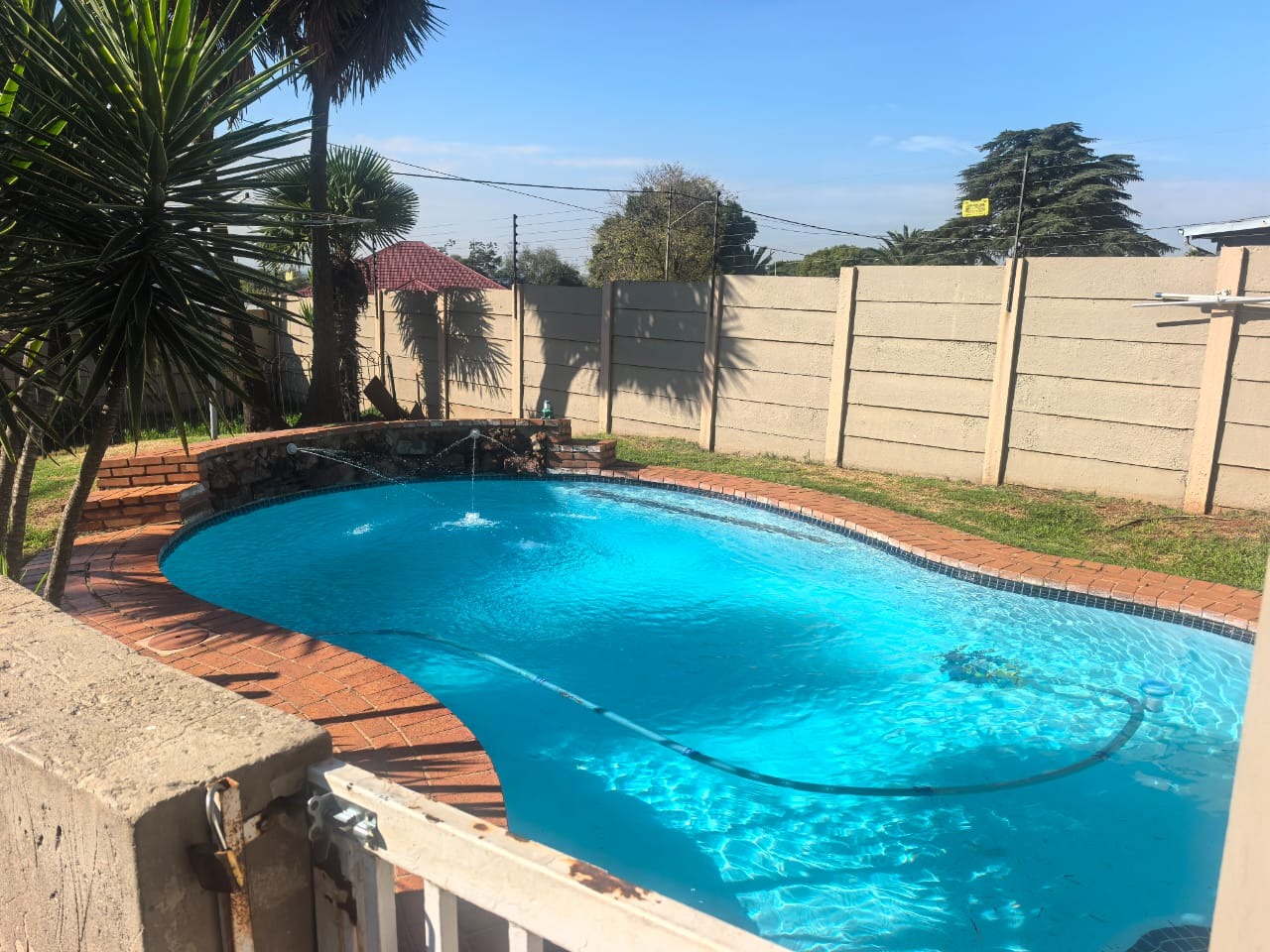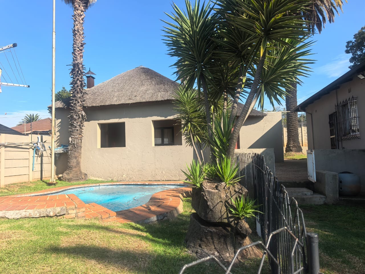 Outside, the property has a swimming pool with a safety fence, as well as a braai area with built-braai covered by a thatch lapa . There is also an additional outside bathroom for the main house. Up front you'll find a well-established garden.