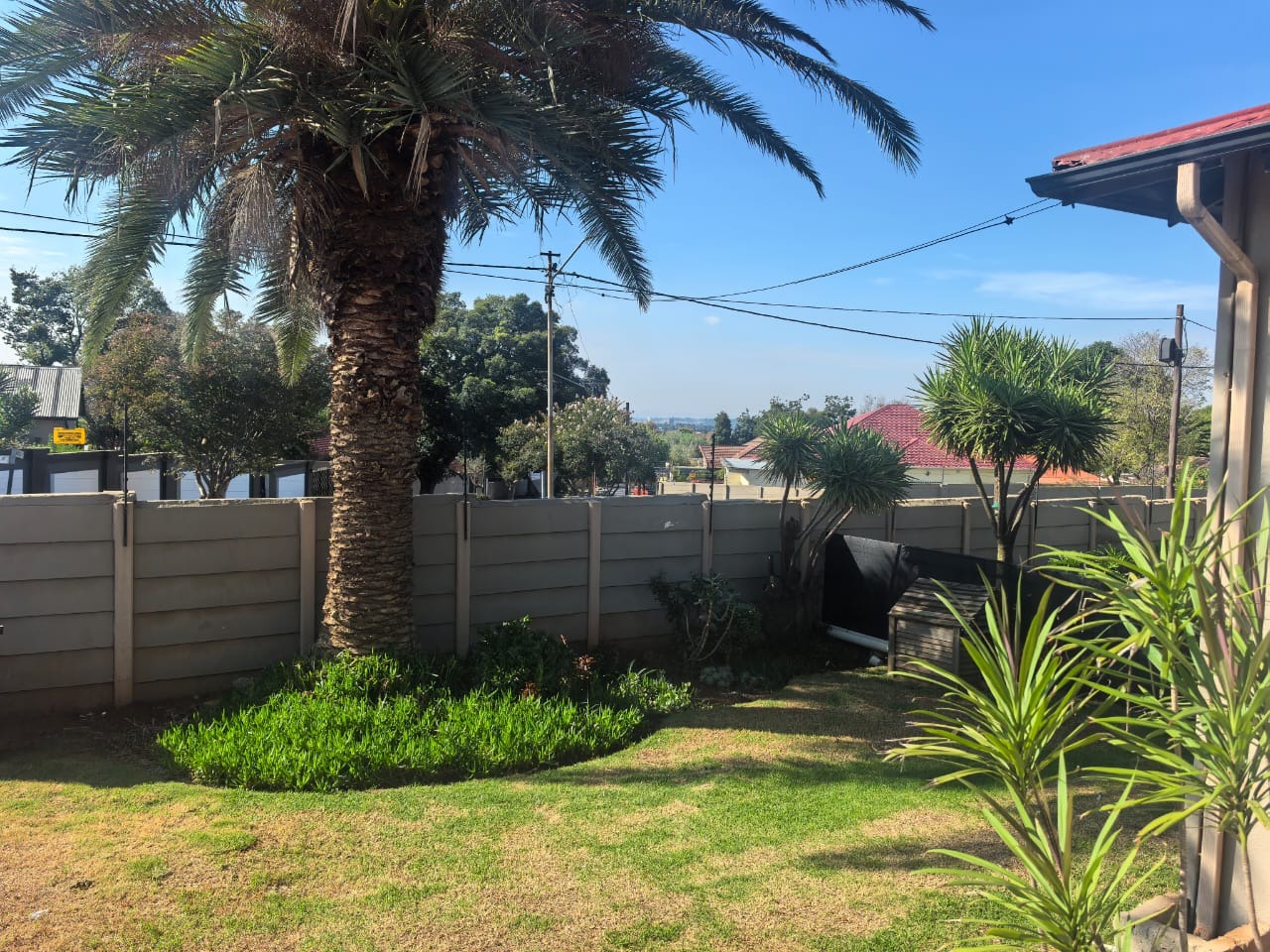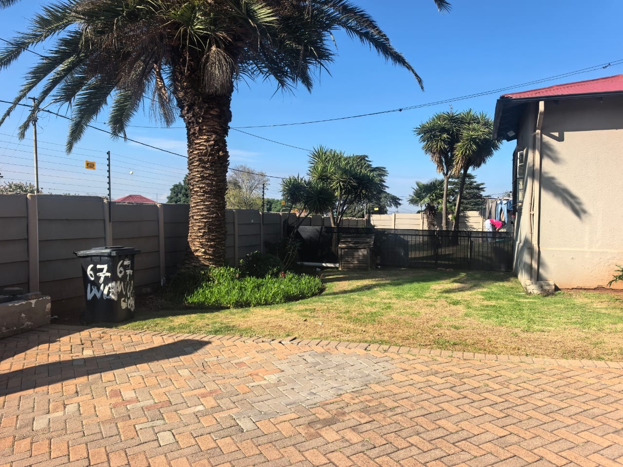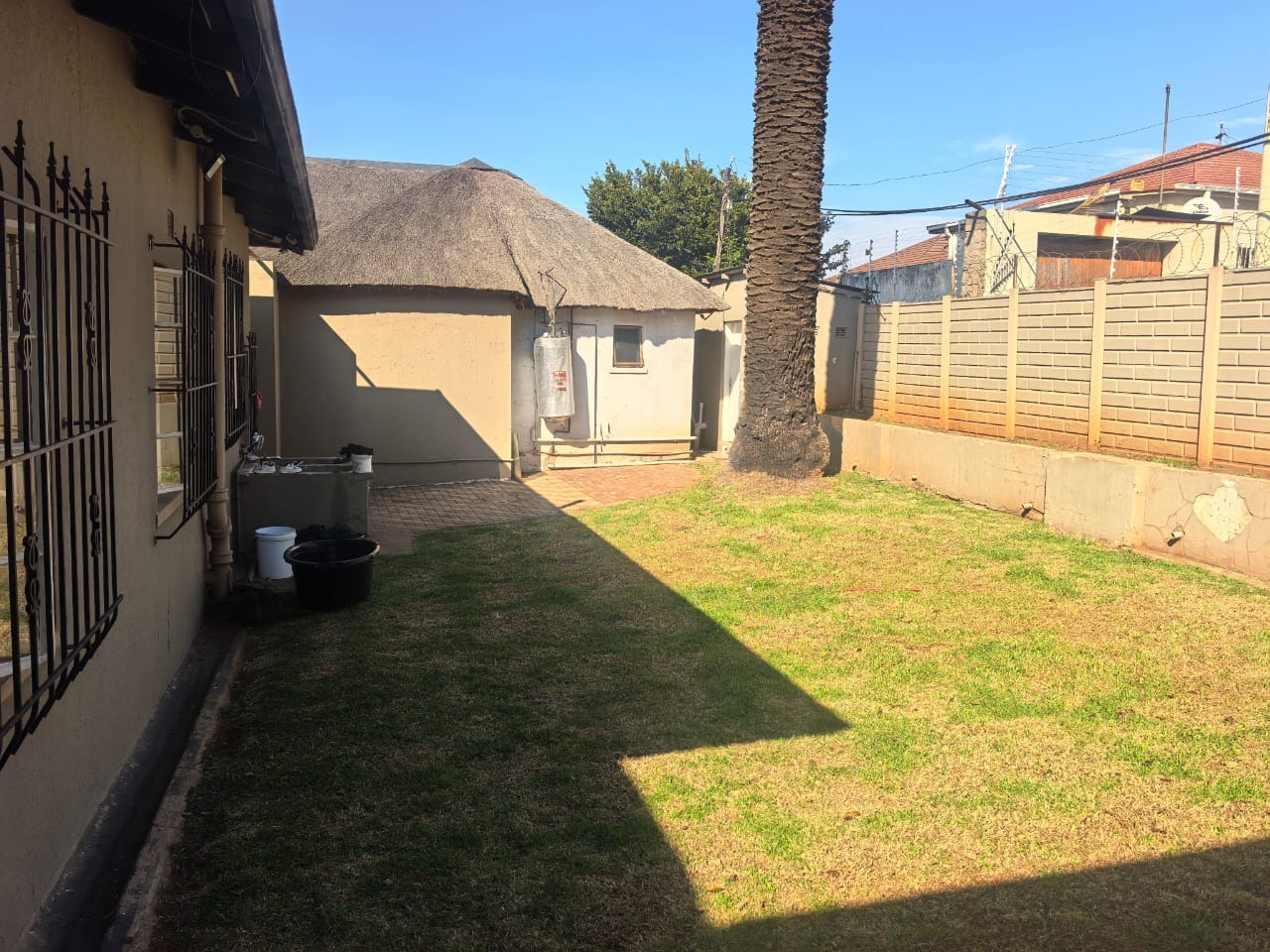 Outside, the property has a swimming pool with a safety fence, as well as a braai area with built-braai covered by a thatch lapa . There is also an additional outside bathroom for the main house. Up front you'll find a well-established garden.