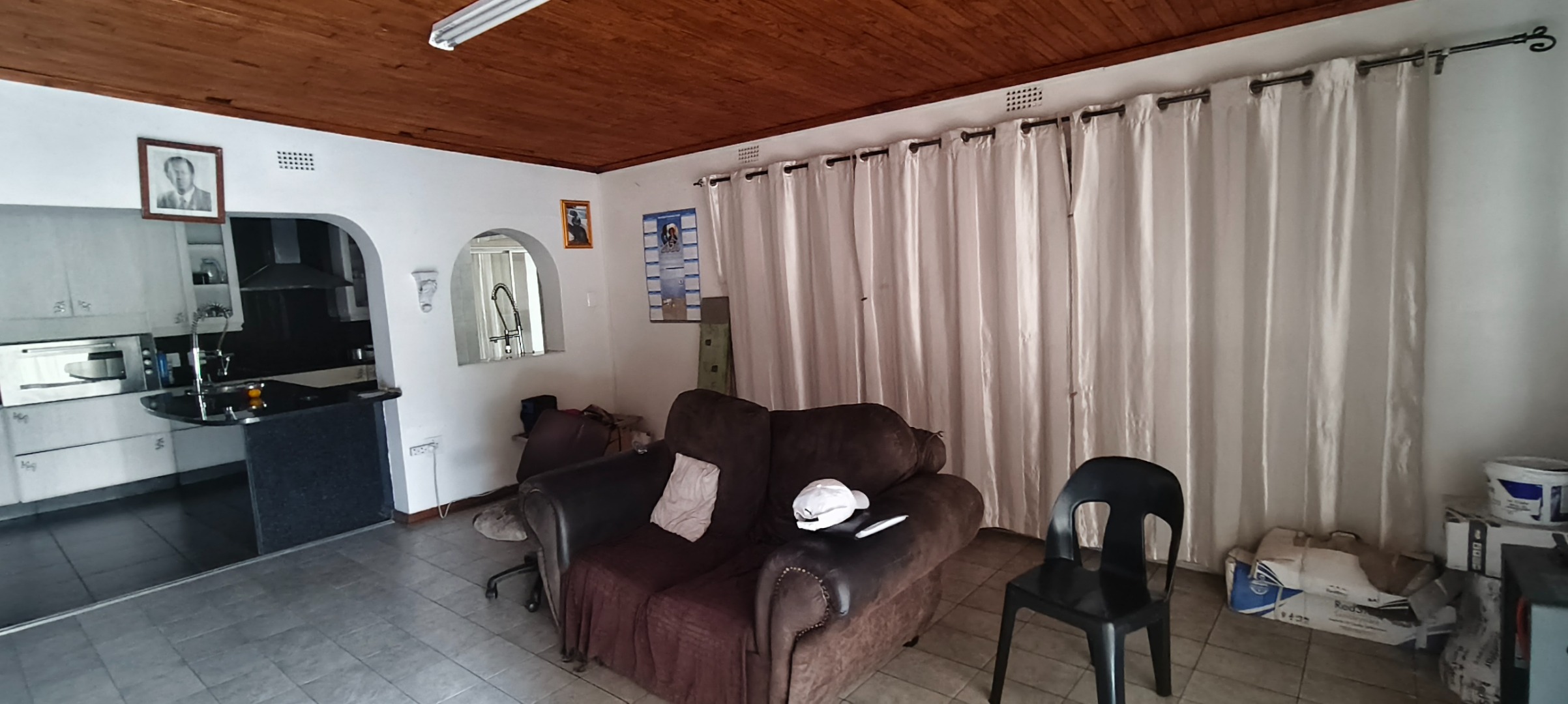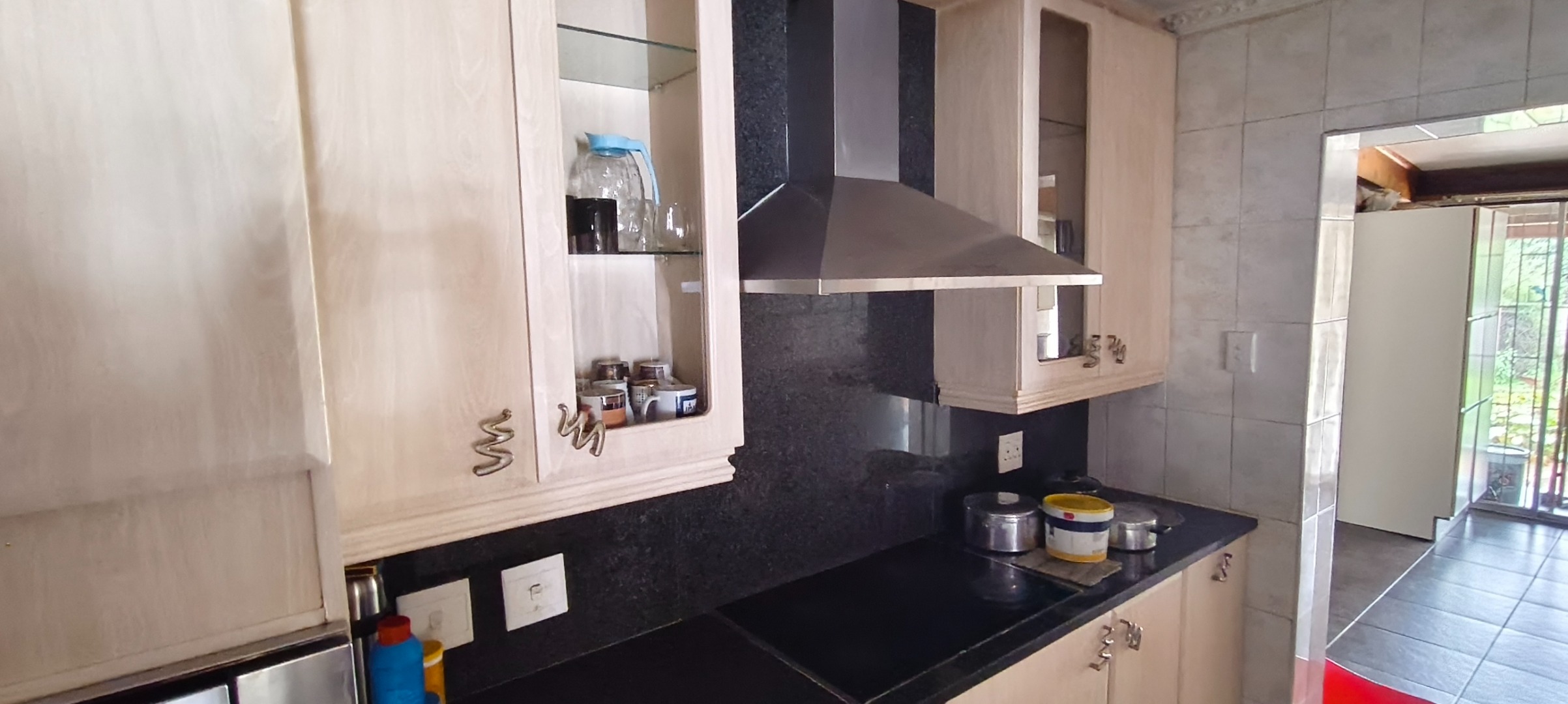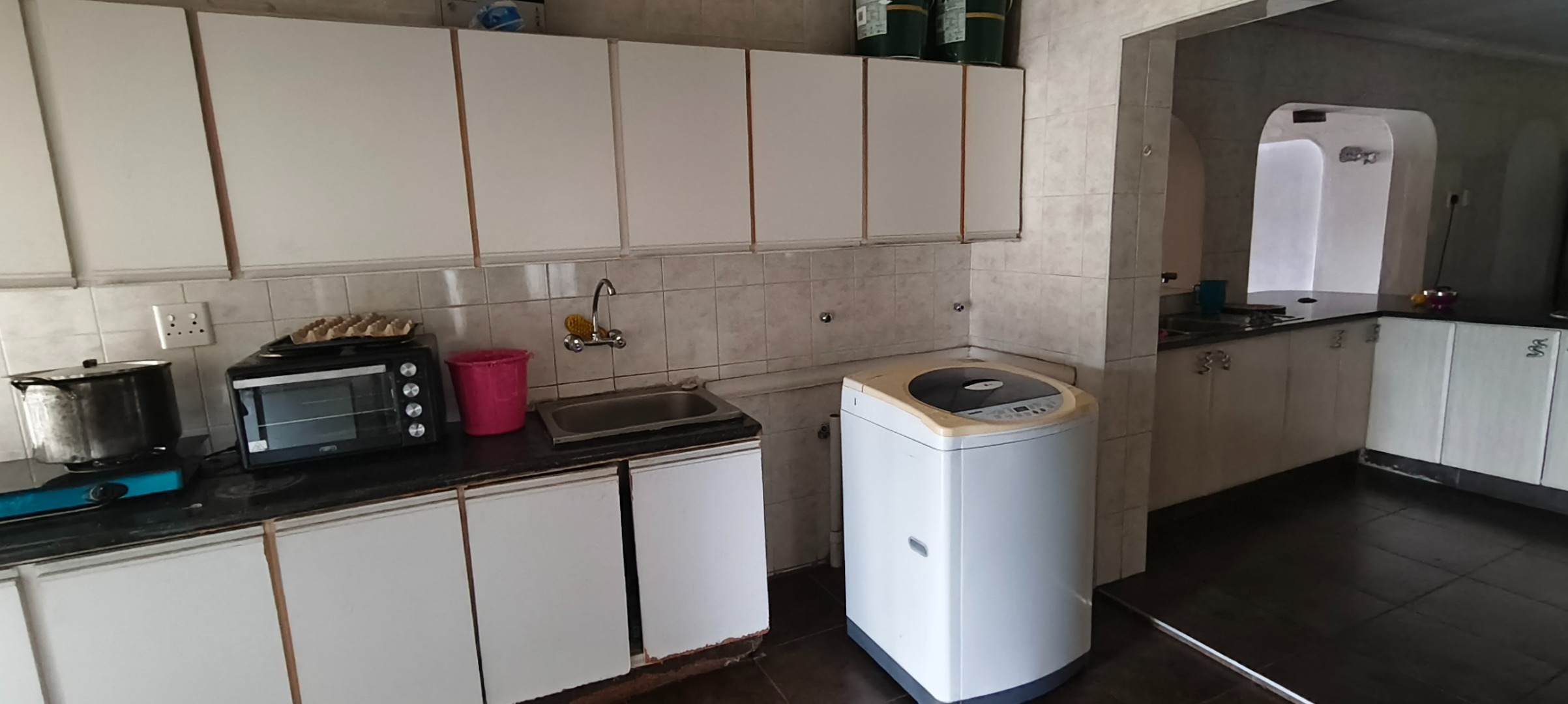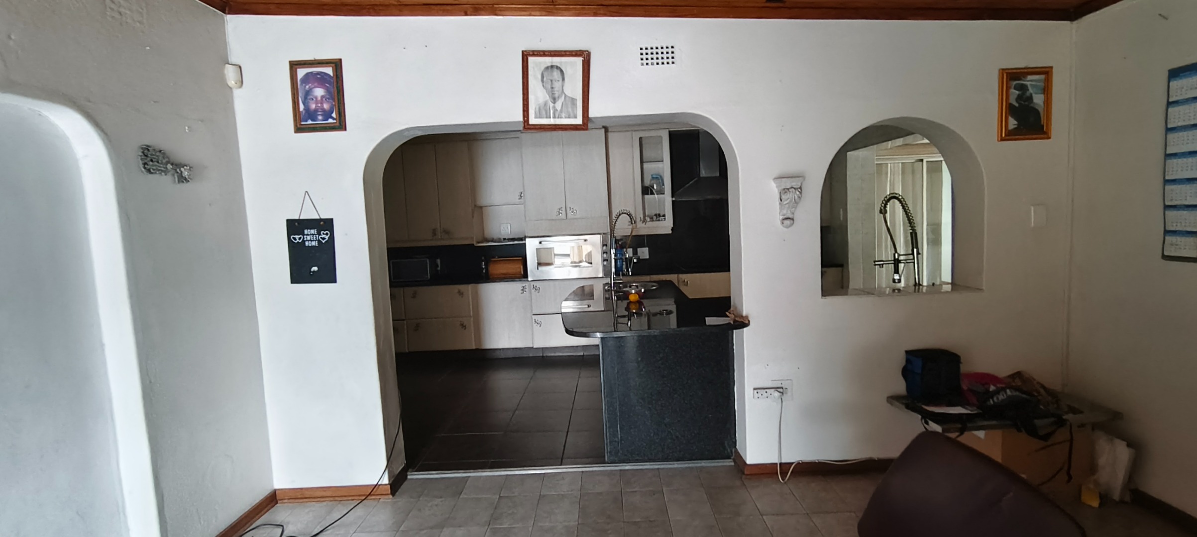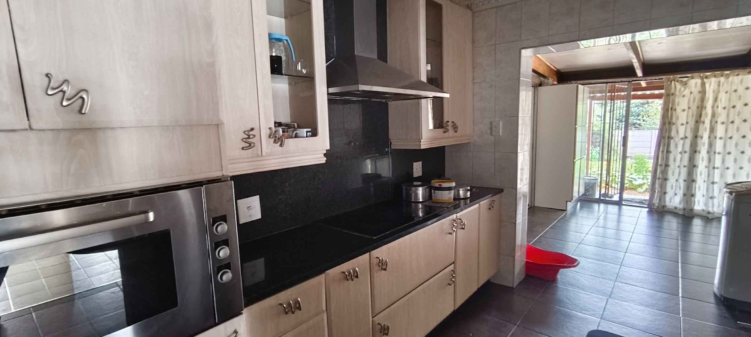 commencing with a spacious kitchen featuring a scullery, modern stove, extractor fan, and elegant granite counter-tops. Ample storage for provisions is complemented by a dedicated laundry area and a pantry. A notable advantage is the inclusion of a second kitchen, offering enhanced culinary flexibility. The open-plan lounge and dining room provide an inviting environment for both relaxation and formal entertaining.
