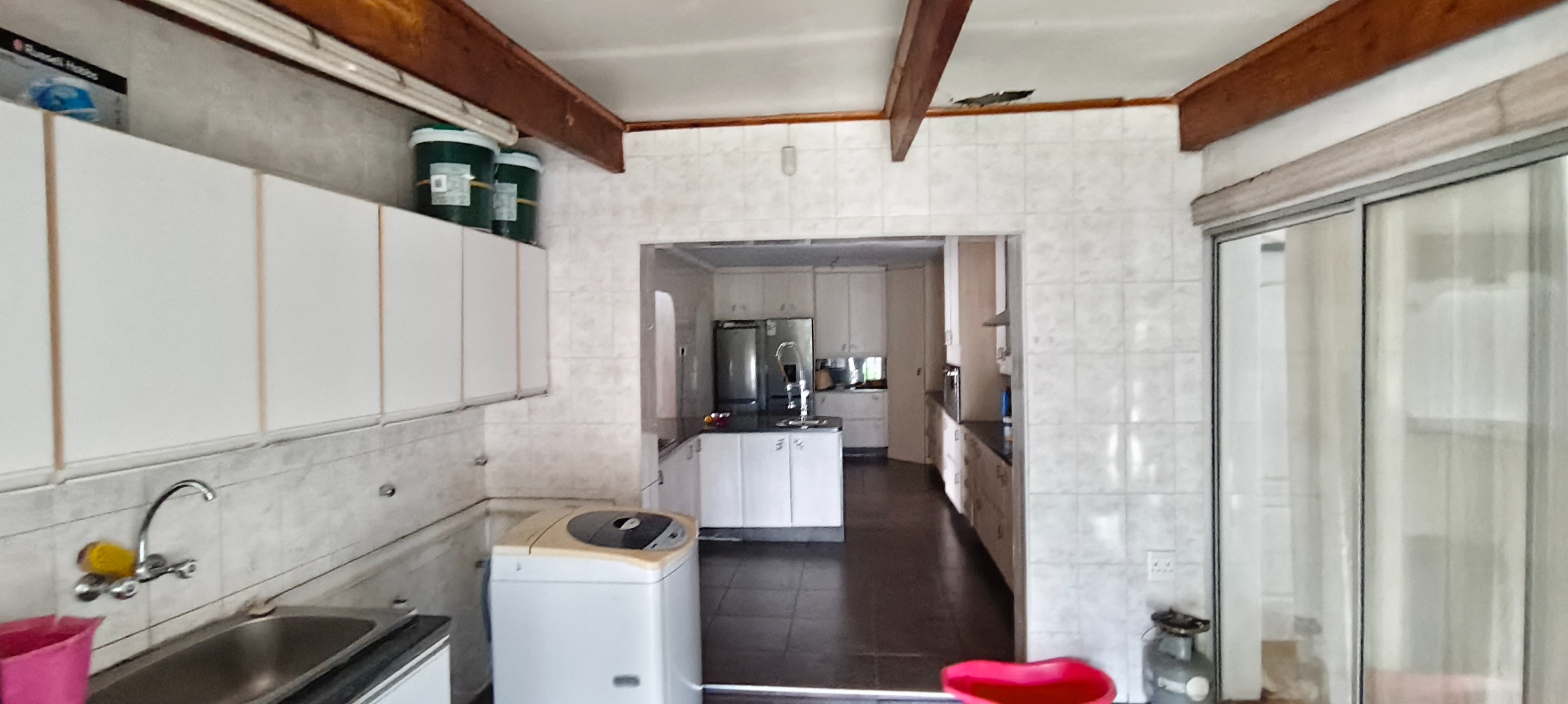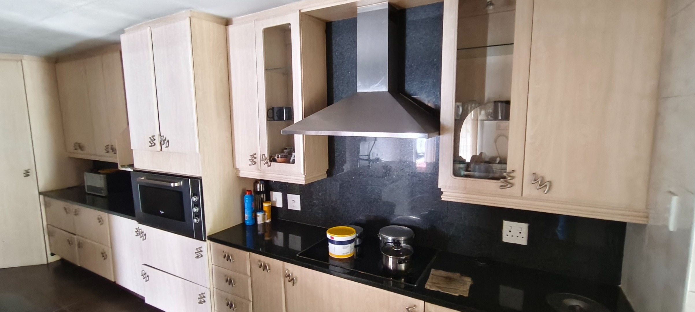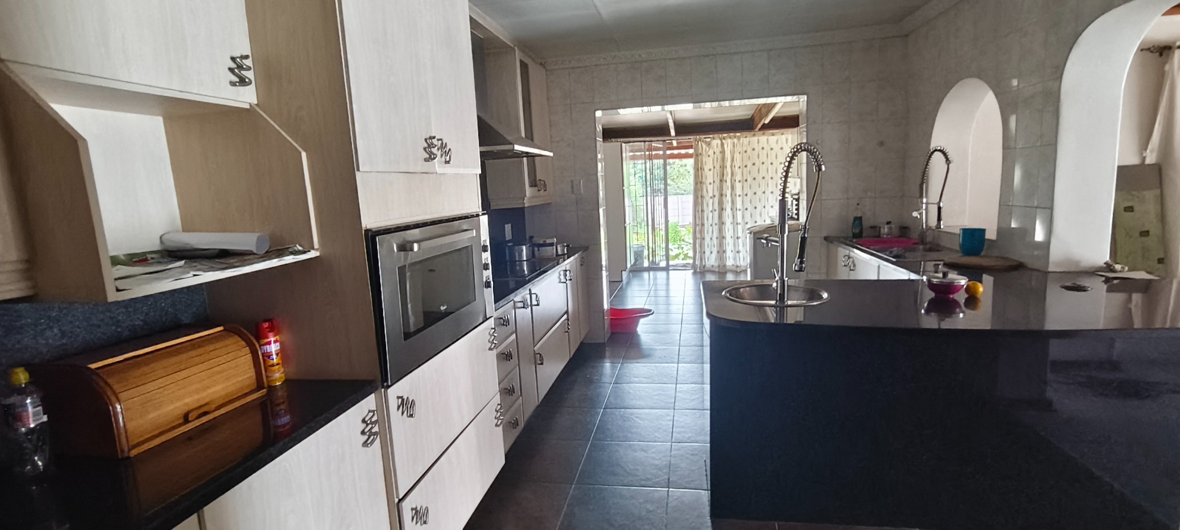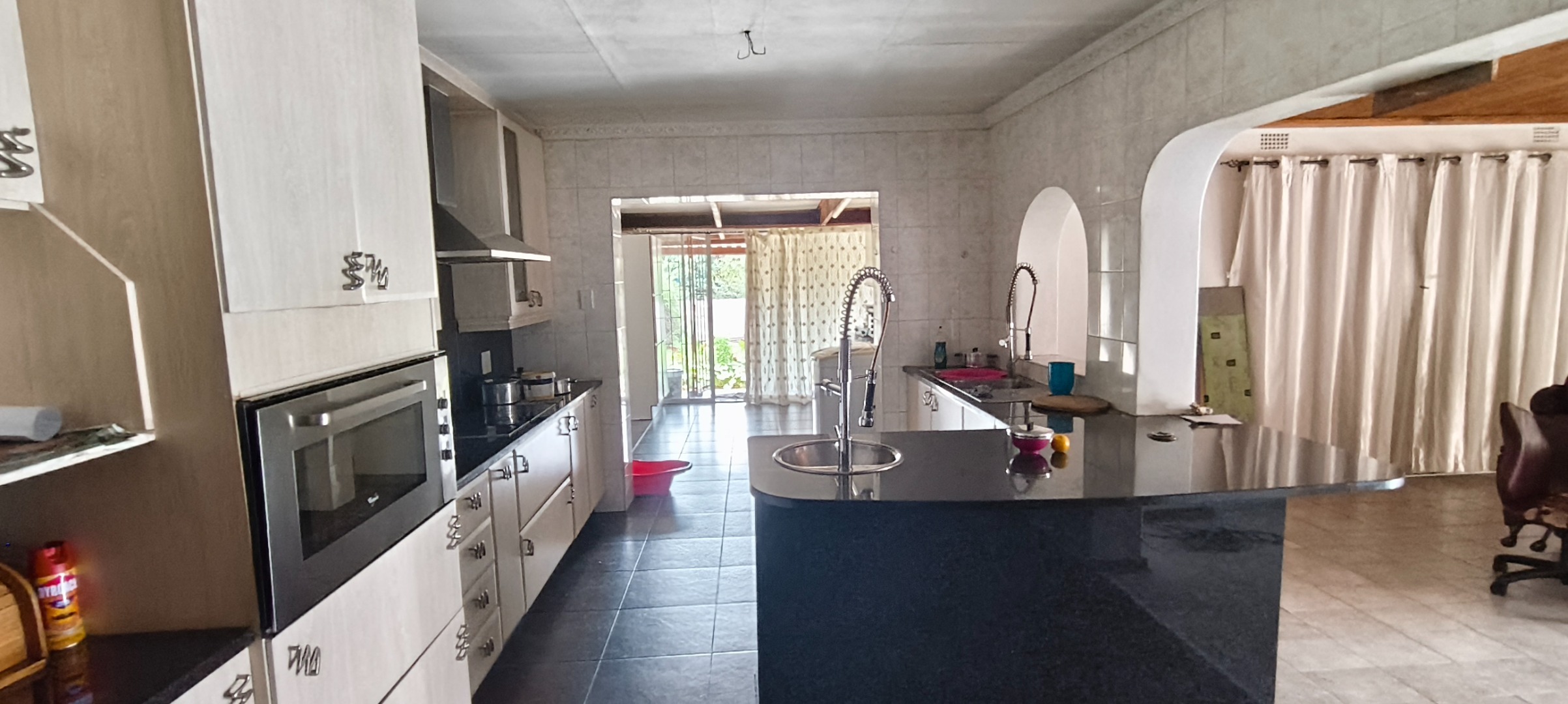 commencing with a spacious kitchen featuring a scullery, modern stove, extractor fan, and elegant granite counter-tops. Ample storage for provisions is complemented by a dedicated laundry area and a pantry. A notable advantage is the inclusion of a second kitchen, offering enhanced culinary flexibility. The open-plan lounge and dining room provide an inviting environment for both relaxation and formal entertaining.
