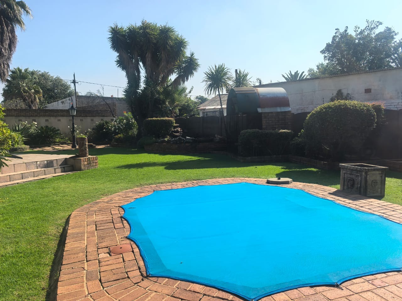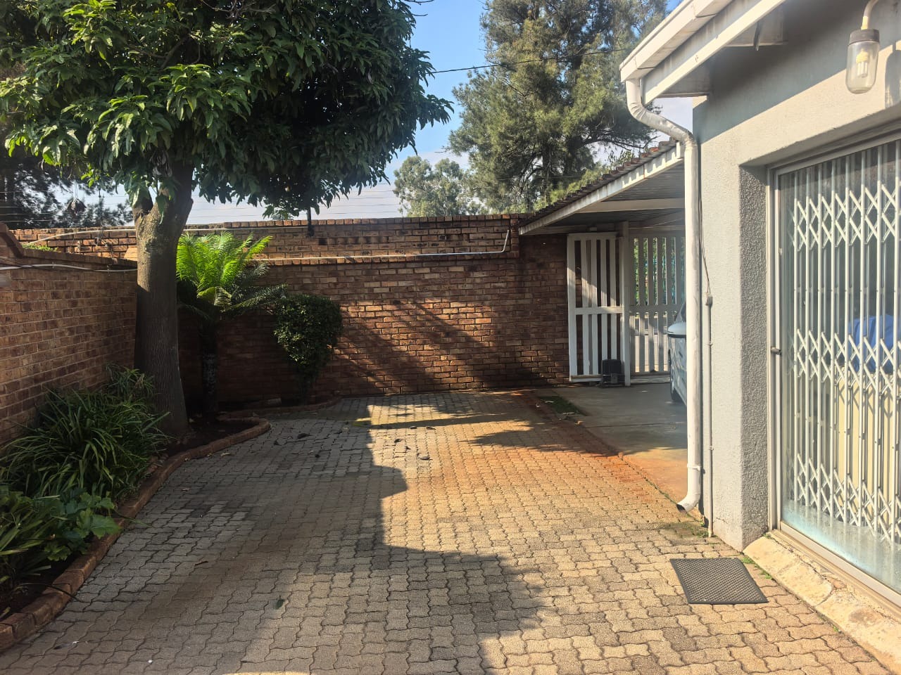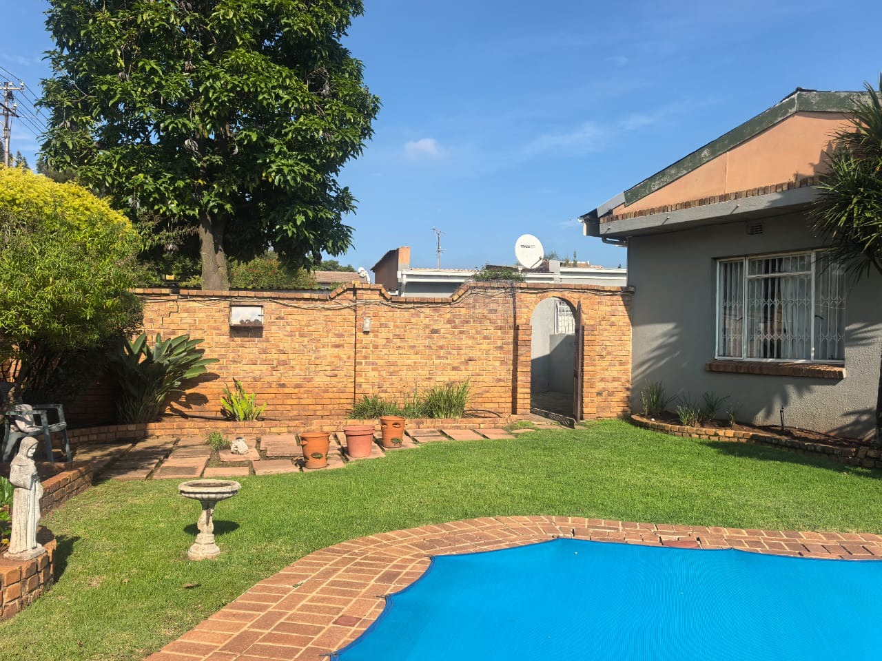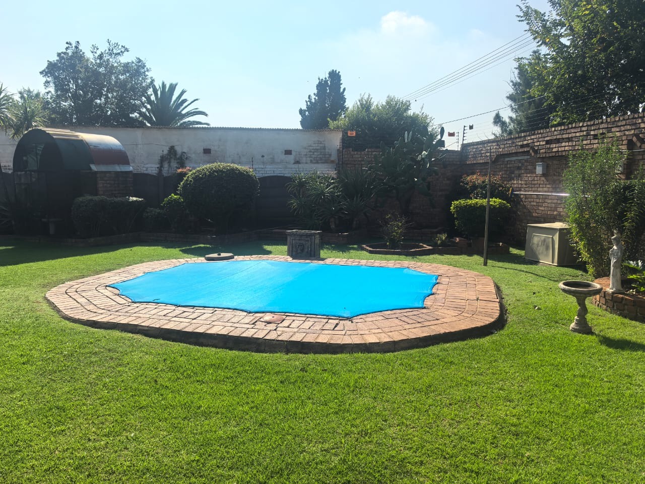 Outside, there is an entertainment area with a built-in braai overlooking the swimming pool, providing a functional space for relaxing or hosting guests. The property also includes two covered carports for parking.