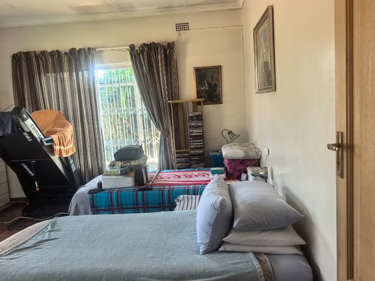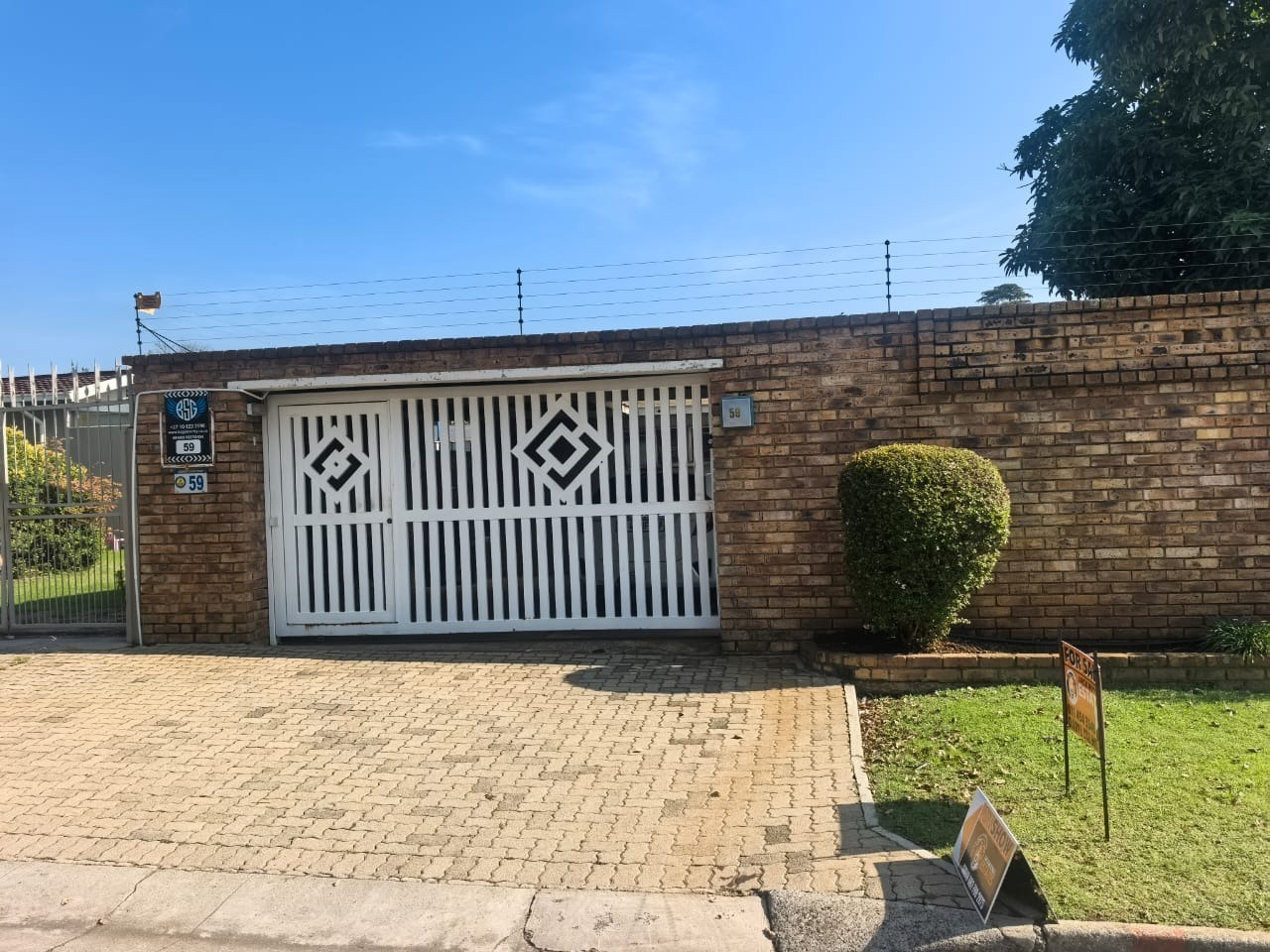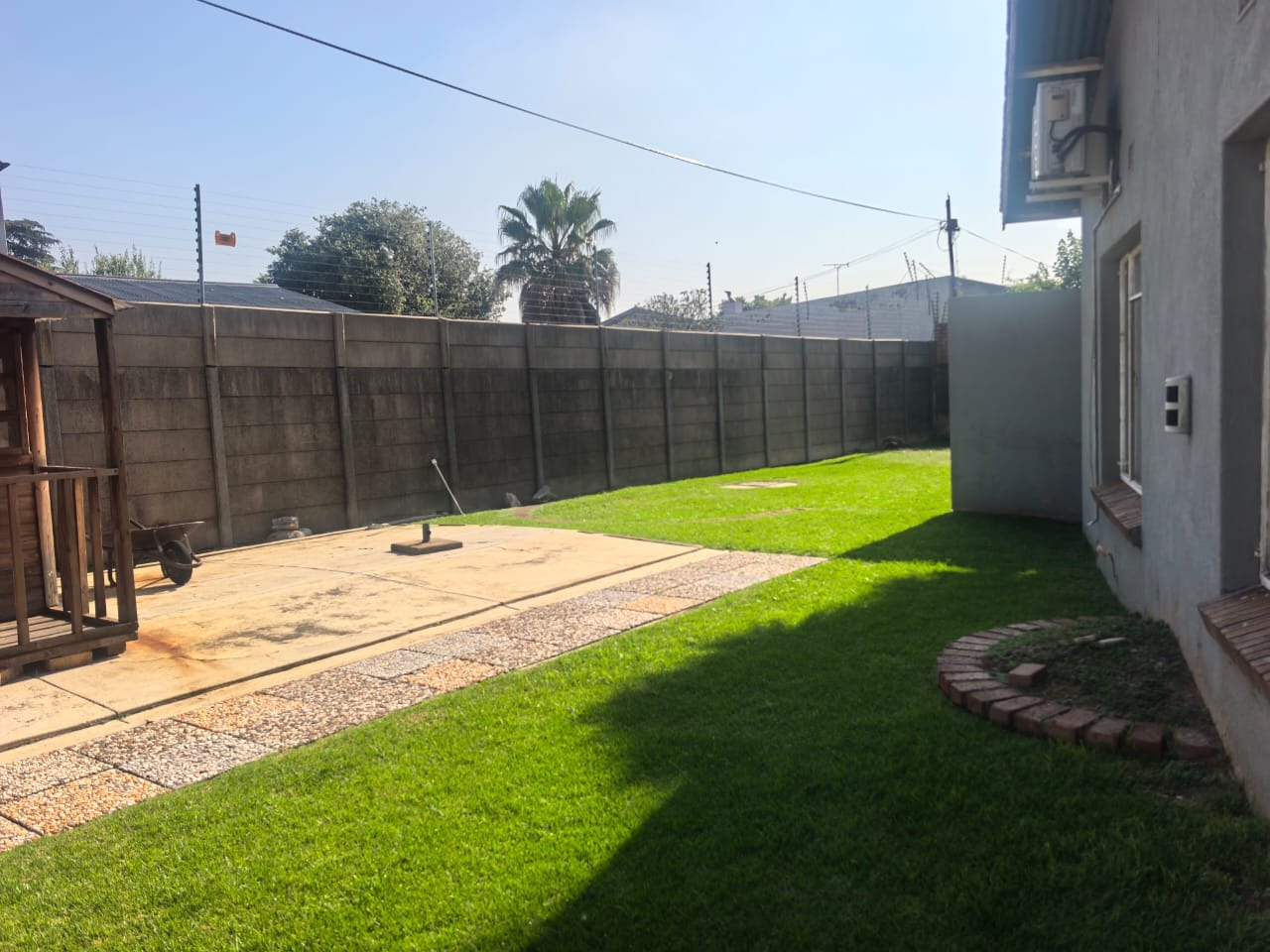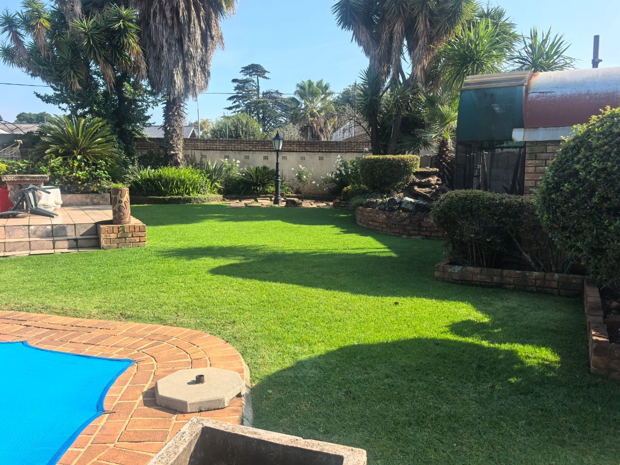 Outside, there is an entertainment area with a built-in braai overlooking the swimming pool, providing a functional space for relaxing or hosting guests. The property also includes two covered carports for parking.