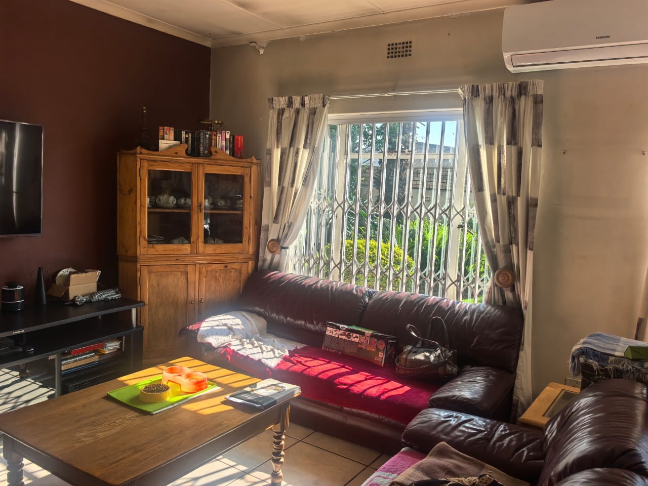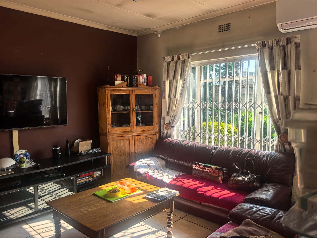 The home features two bedrooms, both fitted with air conditioning, and a full bathroom with a separate toilet for added convenience. The living areas include a spacious lounge, also air-conditioned, and a separate dining room.