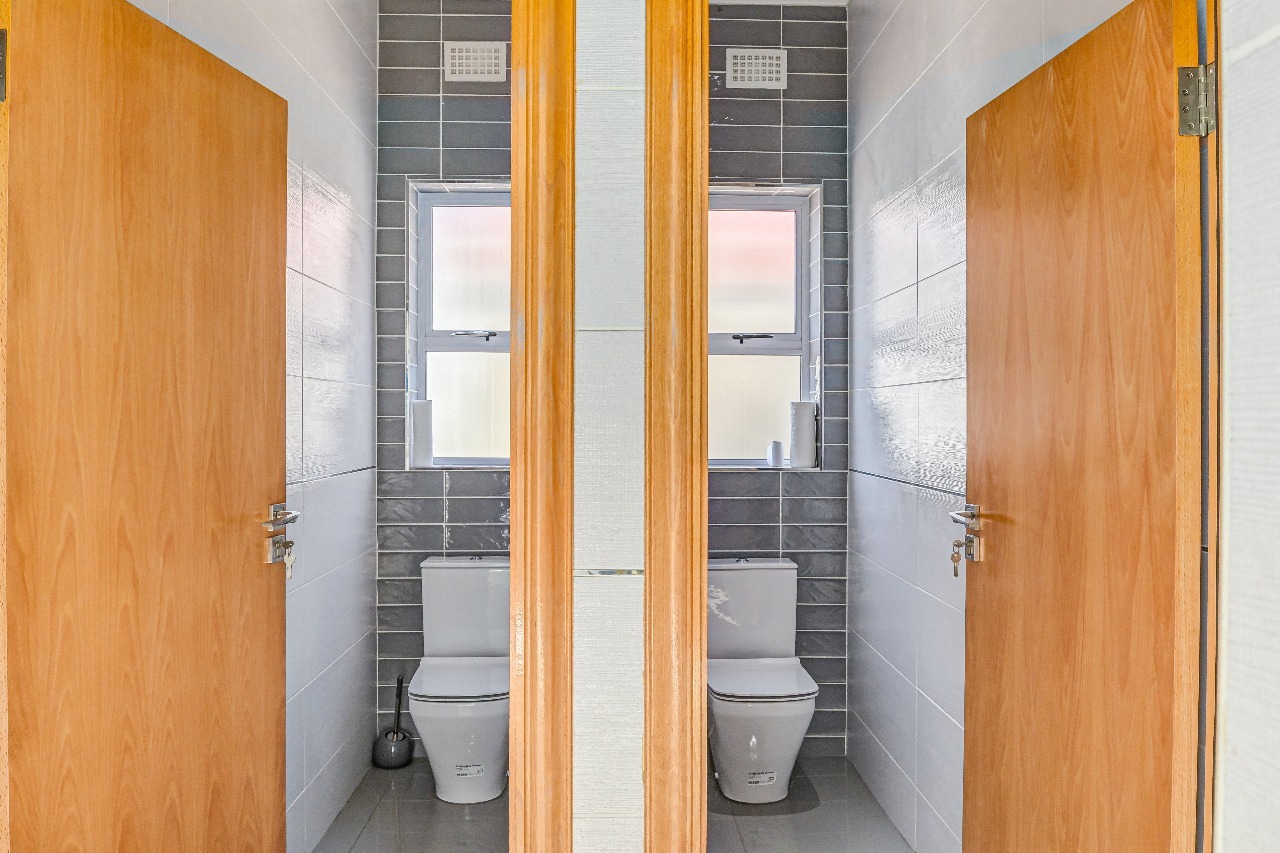 Functionality meets convenience with additional features including two garages, twelve extra parking bays, staff accommodation, domestic quarters, outside toilets, a laundry room, and ample storage space.