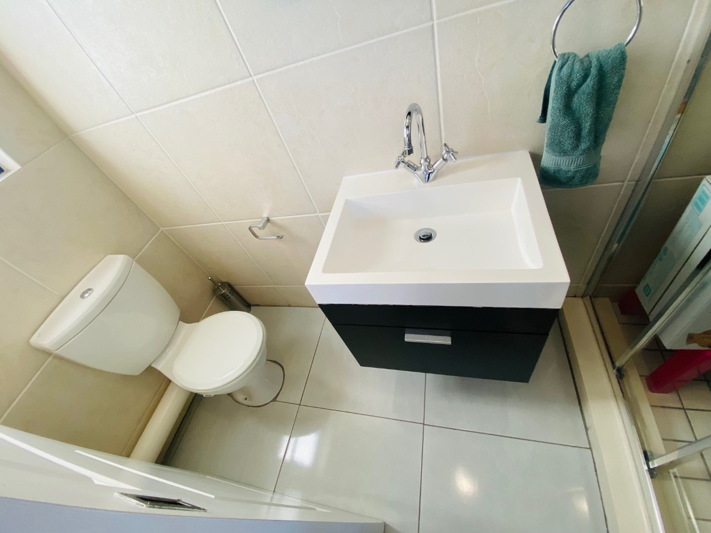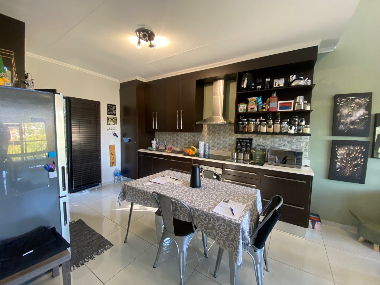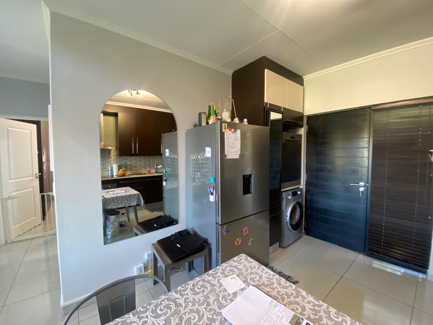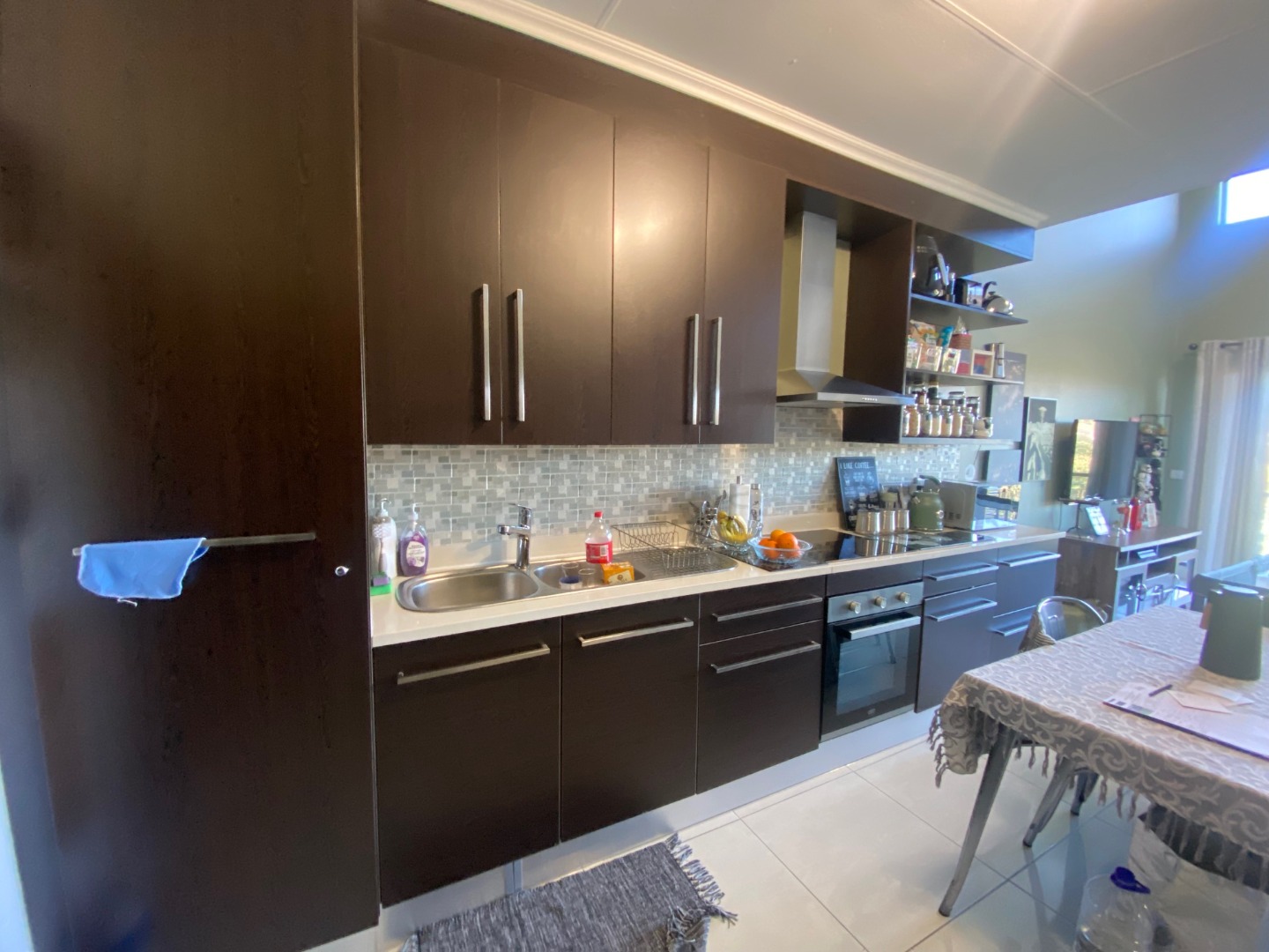 The fully fitted kitchen flows into a spacious, open-plan lounge that opens onto a private balcony—perfect for relaxing or entertaining. The unit is tiled throughout for a sleek, easy-care finish.