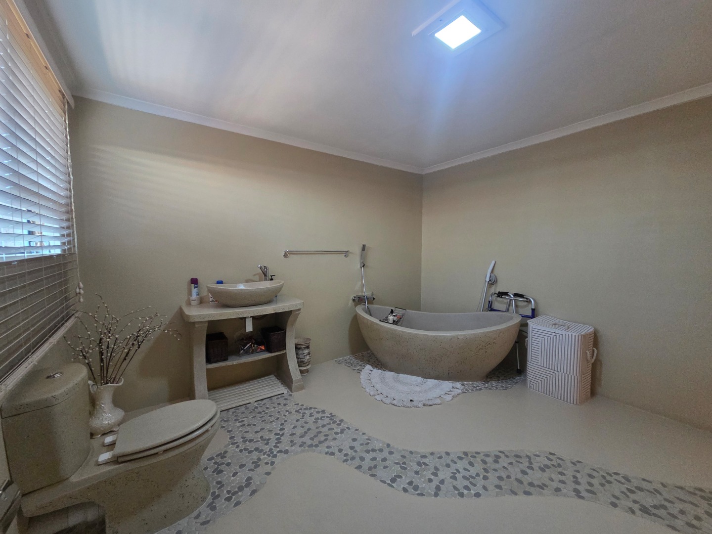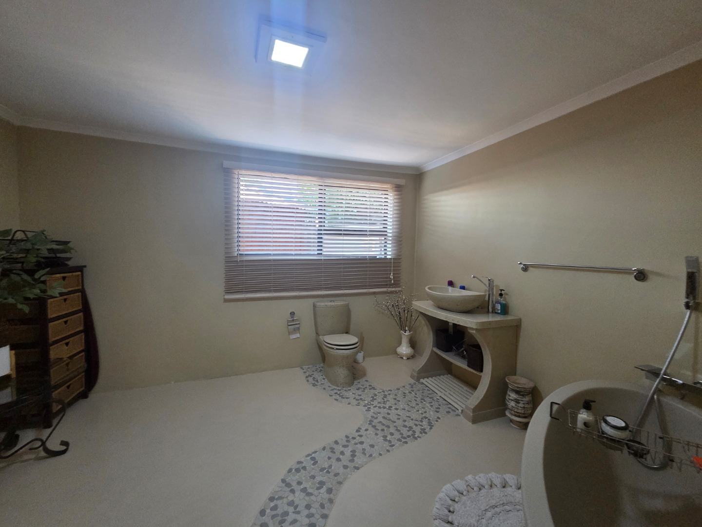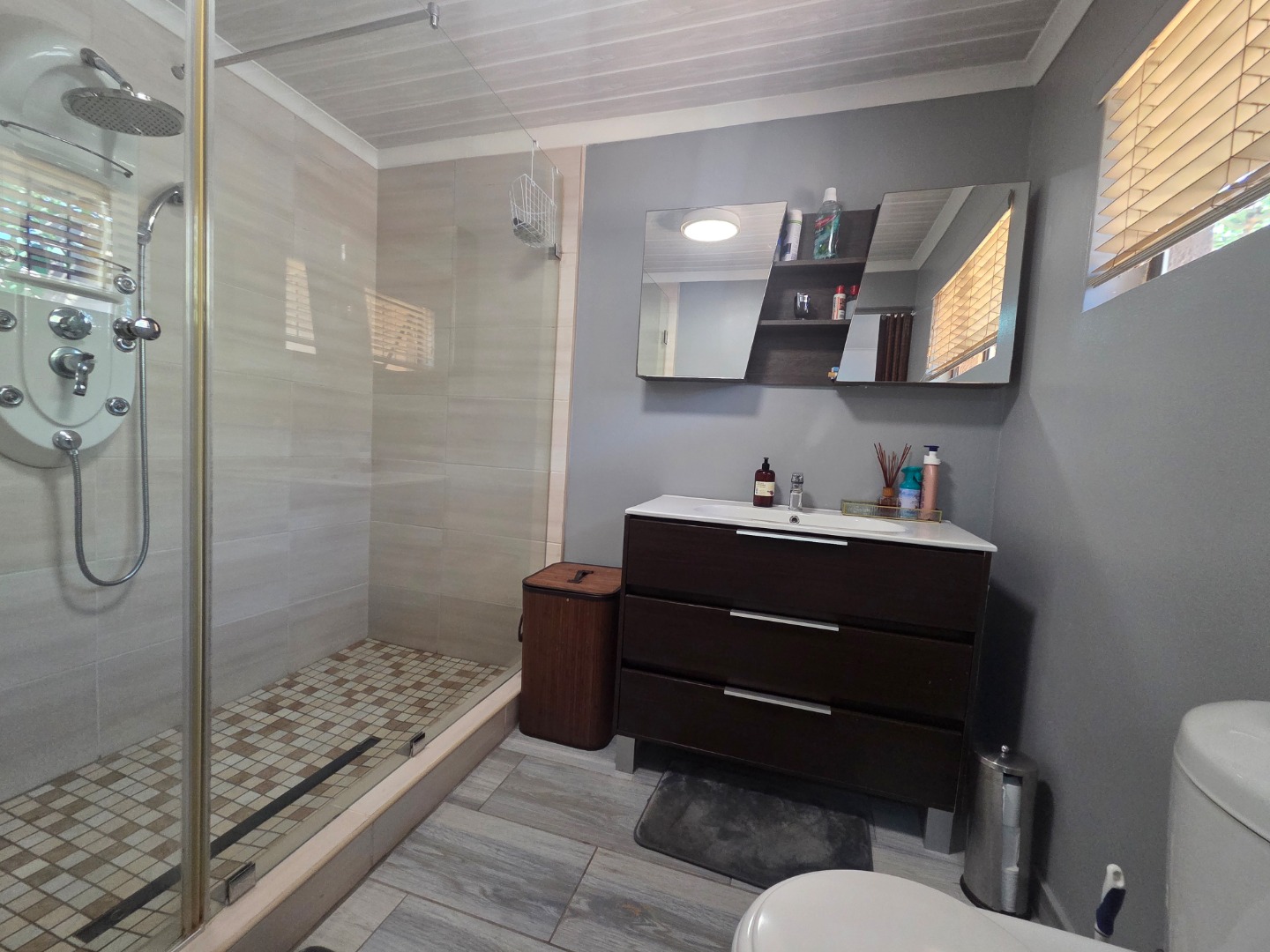 The property features two well-sized bedrooms, both fitted with built-in cupboards. The main bedroom boasts a spacious and modern en-suite bathroom, finished with contemporary fittings and designed for comfort. In addition, the home offers two more bathrooms, ensuring convenience for family members and guests alike.