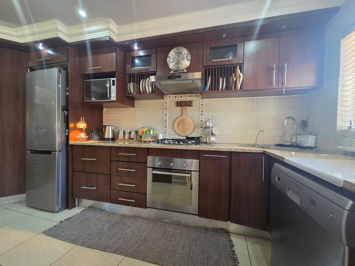 The heart of the home is the neat, well-appointed kitchen, fitted with stylish dark melamine cupboards and elegant granite countertops. Ample cupboard space provides excellent storage, making the kitchen both functional and attractive.