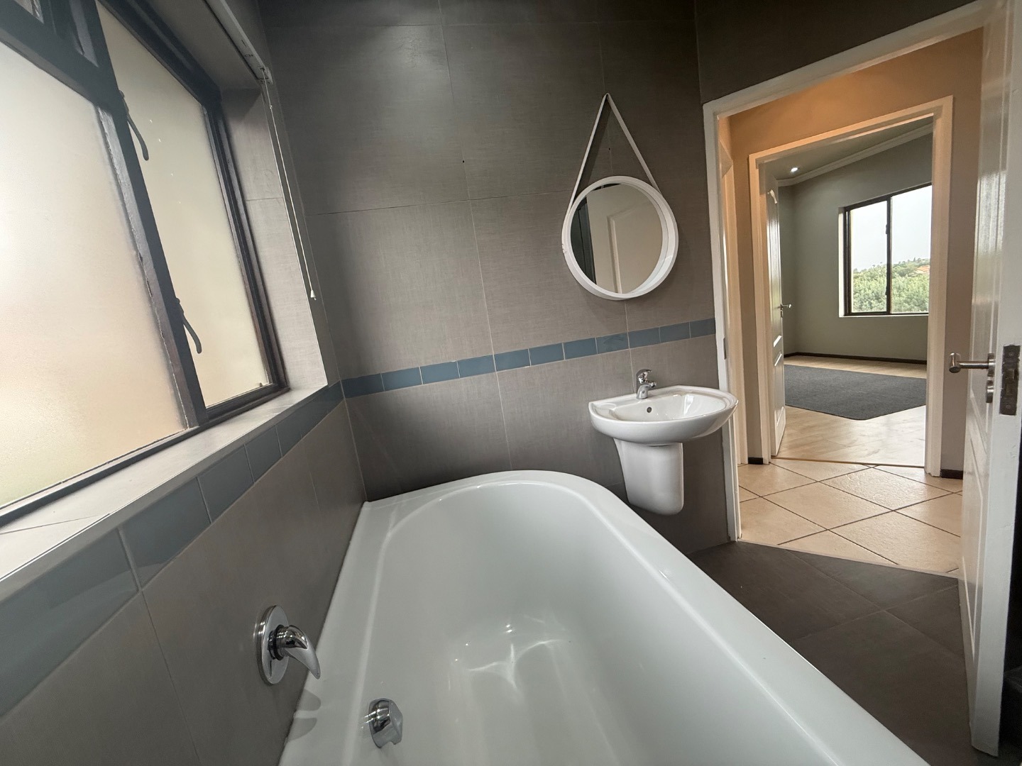 The apartment features 2 generously sized bedrooms, both fitted with built-in cupboards and large windows that invite in natural light. A sleek, full bathroom is beautifully finished with modern fittings, offering both a bath and shower for added convenience.