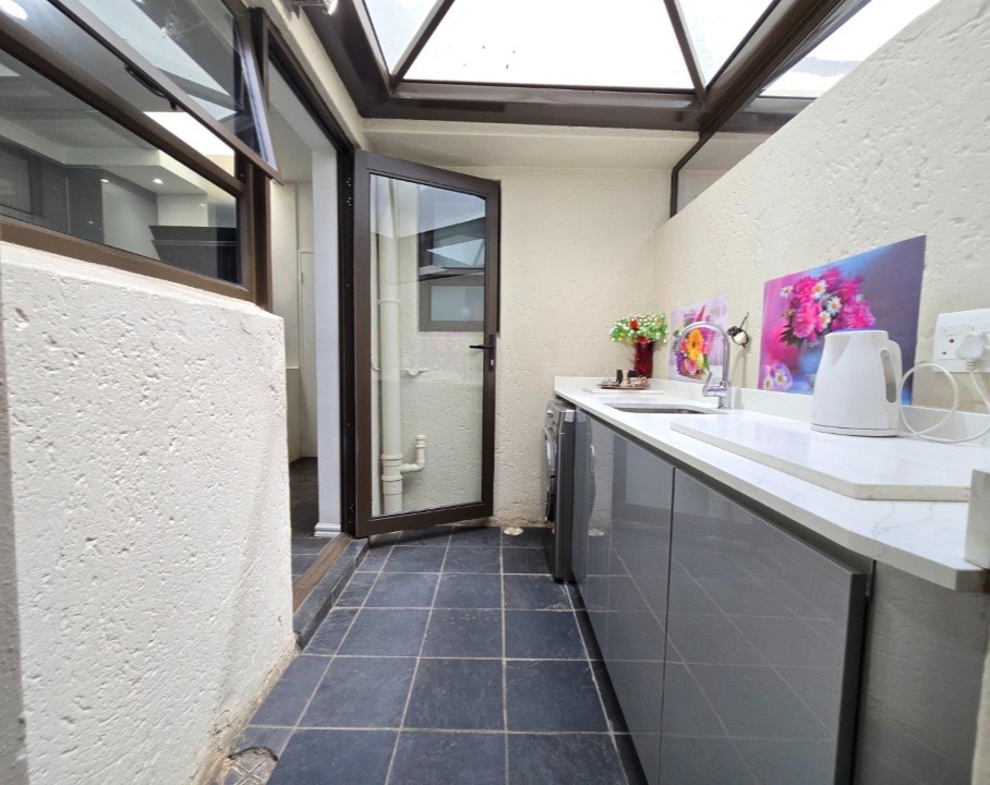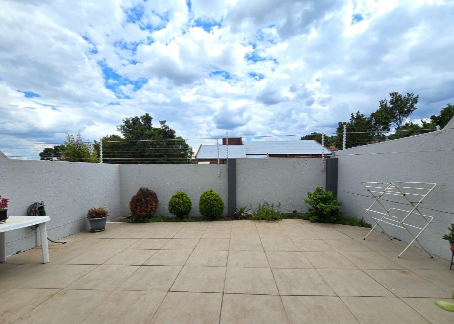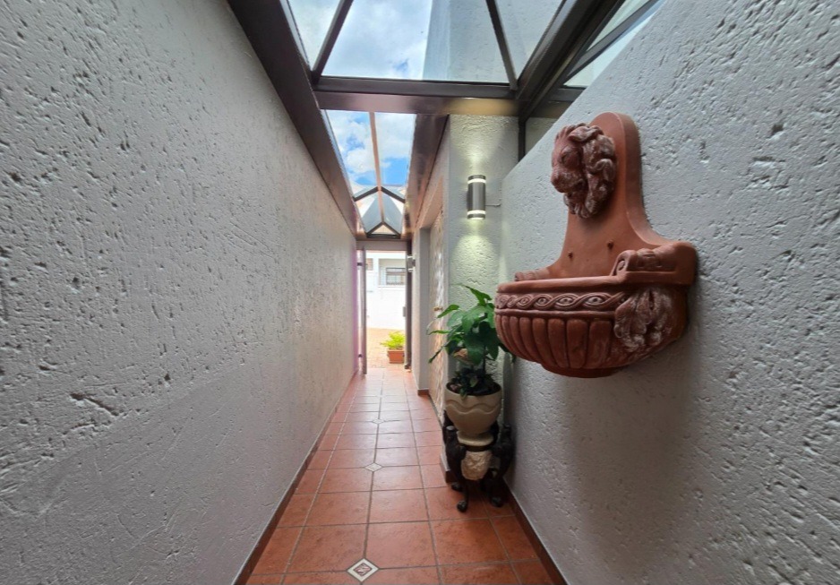 The allure extends outdoors to a captivating private garden, an idyllic setting for relaxation and alfresco gatherings, complemented by a sparkling swimming pool – a true oasis for leisure. Security is paramount, with electric fencing, burglar bars, and a security gate providing peace of mind within this totally walled complex. Additional conveniences include double garages, ample parking, fibre connectivity, and a pet-friendly environment, catering to every modern need.