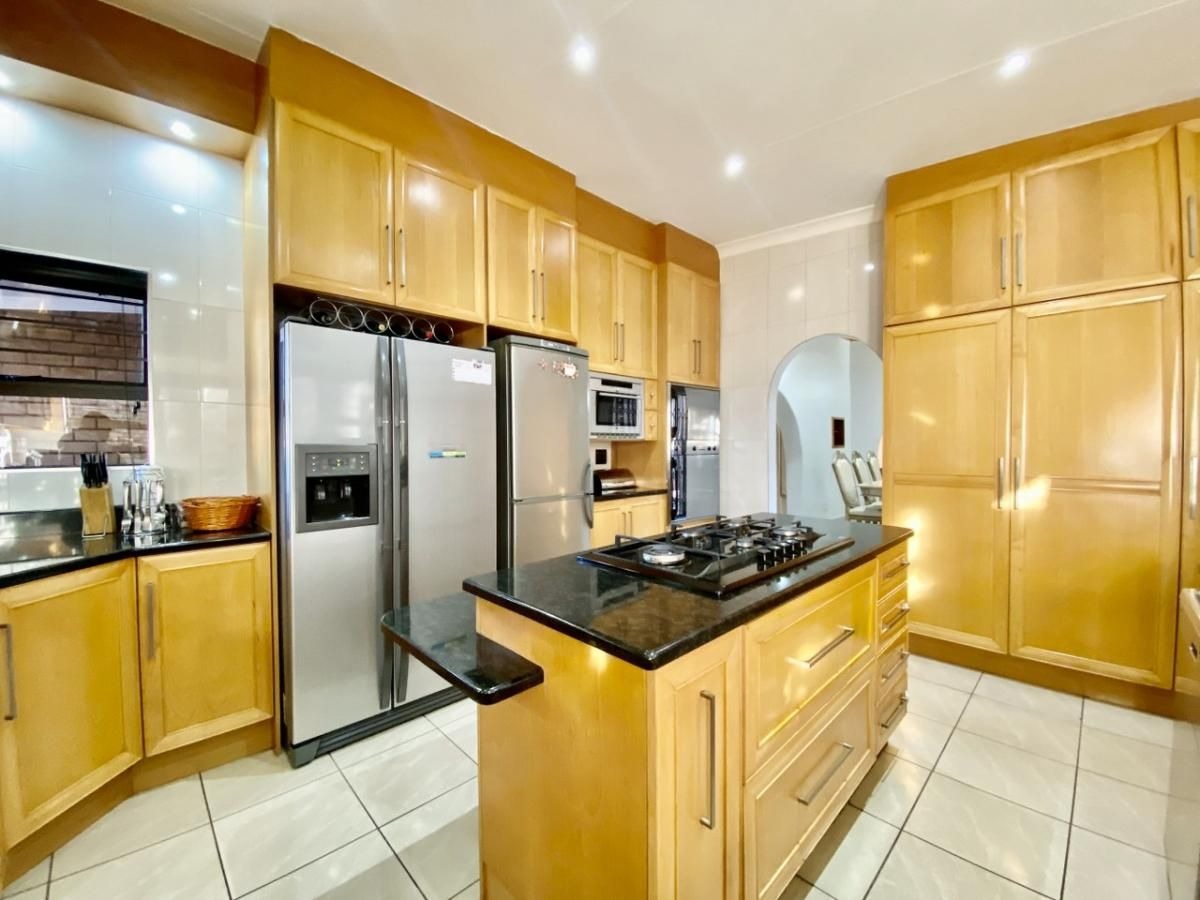 The well-appointed kitchen is both functional and stylish, featuring space for a double and single fridge, a gas stove, double oven, and ample cabinetry — catering perfectly to the needs of a modern household.