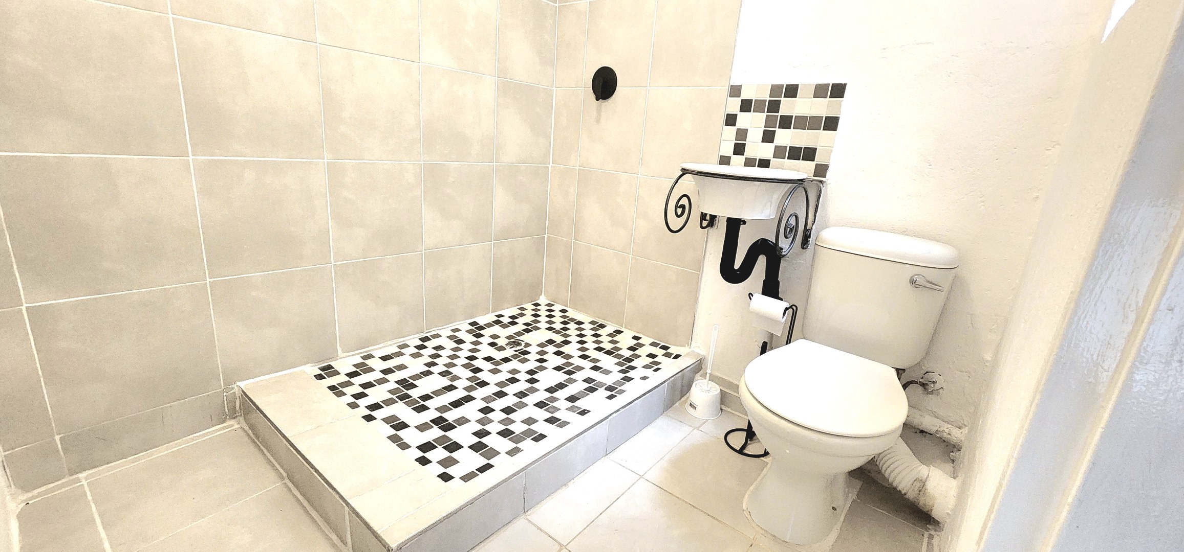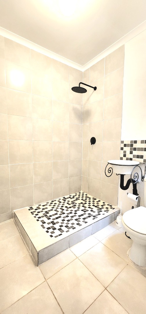 This apartment boasts two cozy bedrooms, each with that lovely parquet flooring and plenty of natural light, offering a peaceful retreat after a busy day. The single bathroom is compact and functional, featuring a walk-in shower with a modern black rain shower head and mosaic tiles, though it could benefit from some finishing touches to truly complete the look.