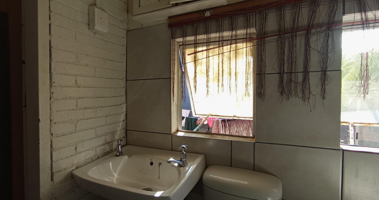 This residence comprises three comfortable bedrooms, each designed with practicality in mind. The bedrooms feature built-in wardrobes, providing essential storage solutions, and some include unique textured ceilings and ceiling fans for added comfort. Natural light streams in through well-placed windows, creating bright and airy spaces. The home offers two functional bathrooms, both fully tiled and featuring a complete suite including a pedestal sink, toilet, and bathtub, with one bathroom also including a grab bar for convenience.