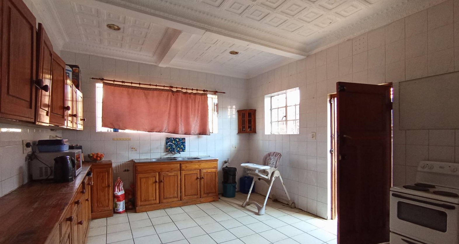 Step inside to find a welcoming interior featuring decorative ceilings and a neutral colour palette throughout. The living areas are spacious and benefit from ample natural light, creating a warm and inviting atmosphere. An arched doorway adds character, connecting different zones of the home seamlessly. The functional kitchen is equipped with wooden cabinetry, tiled floors and walls, and ample counter space, including a stove/oven, making it well-suited for daily meal preparation.