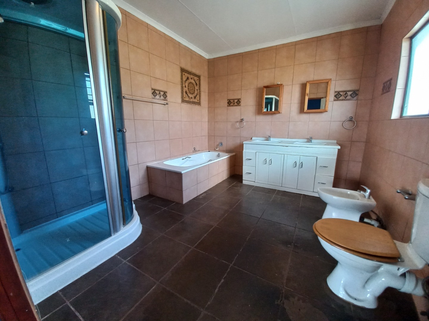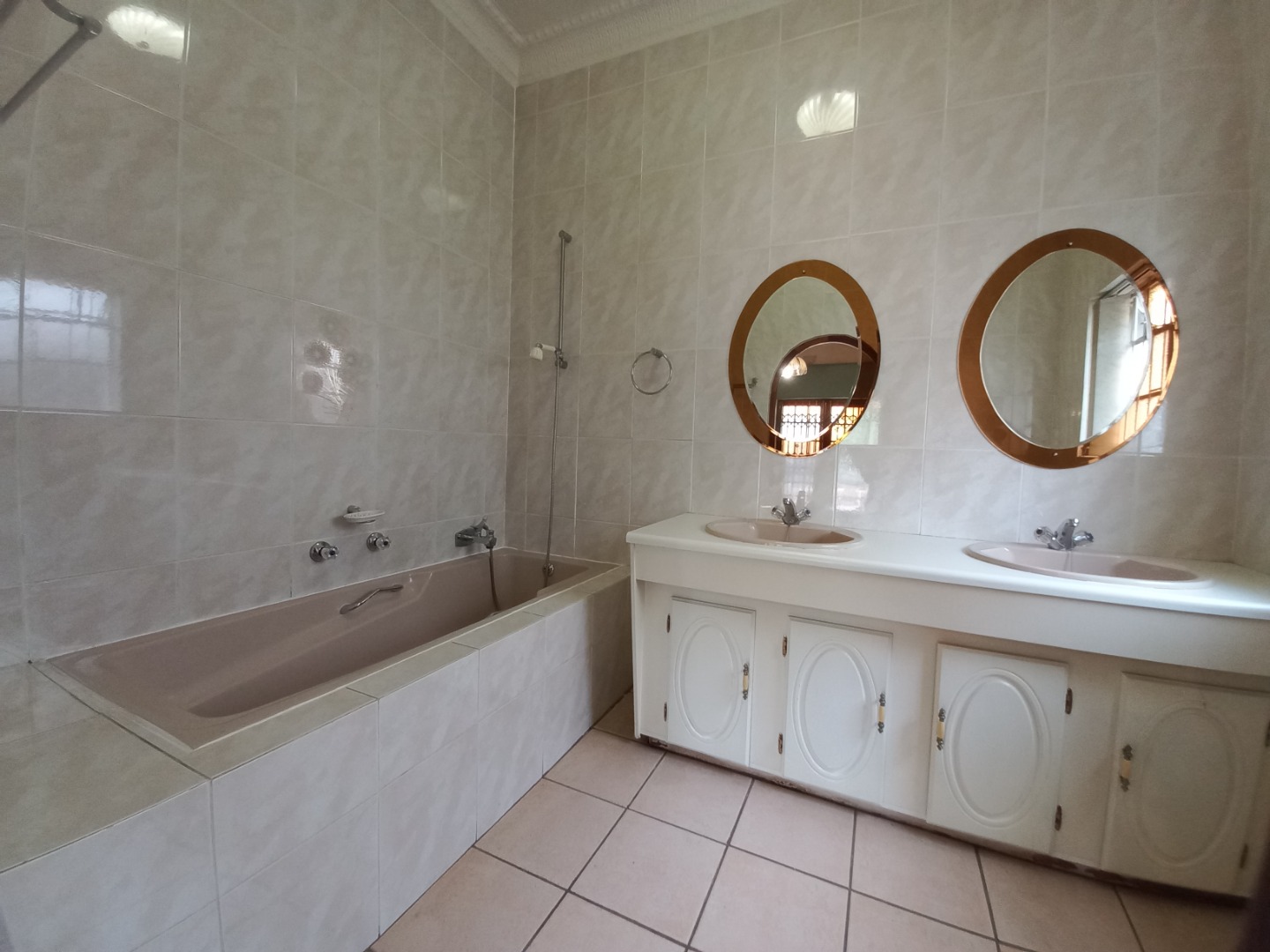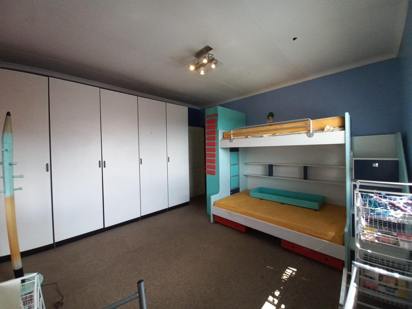 Taking the beautiful wooden staircase upstairs you are welcomed with ample built in cupboard space to fit linen, Bathroom supplies as well as extra clothing space etc. To the left you will find your 4th bedroom it is cozy and offers a peaceful escape including spacious built in cupboards, the 5th and 2nd master bedroom is simply Devine with an expansive floor to ceiling length open cupboards and massive bedroom space with an incredible patio that allows space for a lovely couch set and table that will let you take in a glorious 180 degree view of jhb whether it be for early morning sunrises and tea or an evening sunset with a glass of wine or cognac, the 6th bedroom is spacious with a lovely view and offering spacious built in cupboards, your 7th bedroom is spacious with built in cupboard space as well as a en-suite bathroom that offers 2 toilets, bath shower and his and her sink, it also shares the lovely 180 degree view as well as the patio, there is a 3rd bathroom which serves as a space for bedroom 4 and 6.