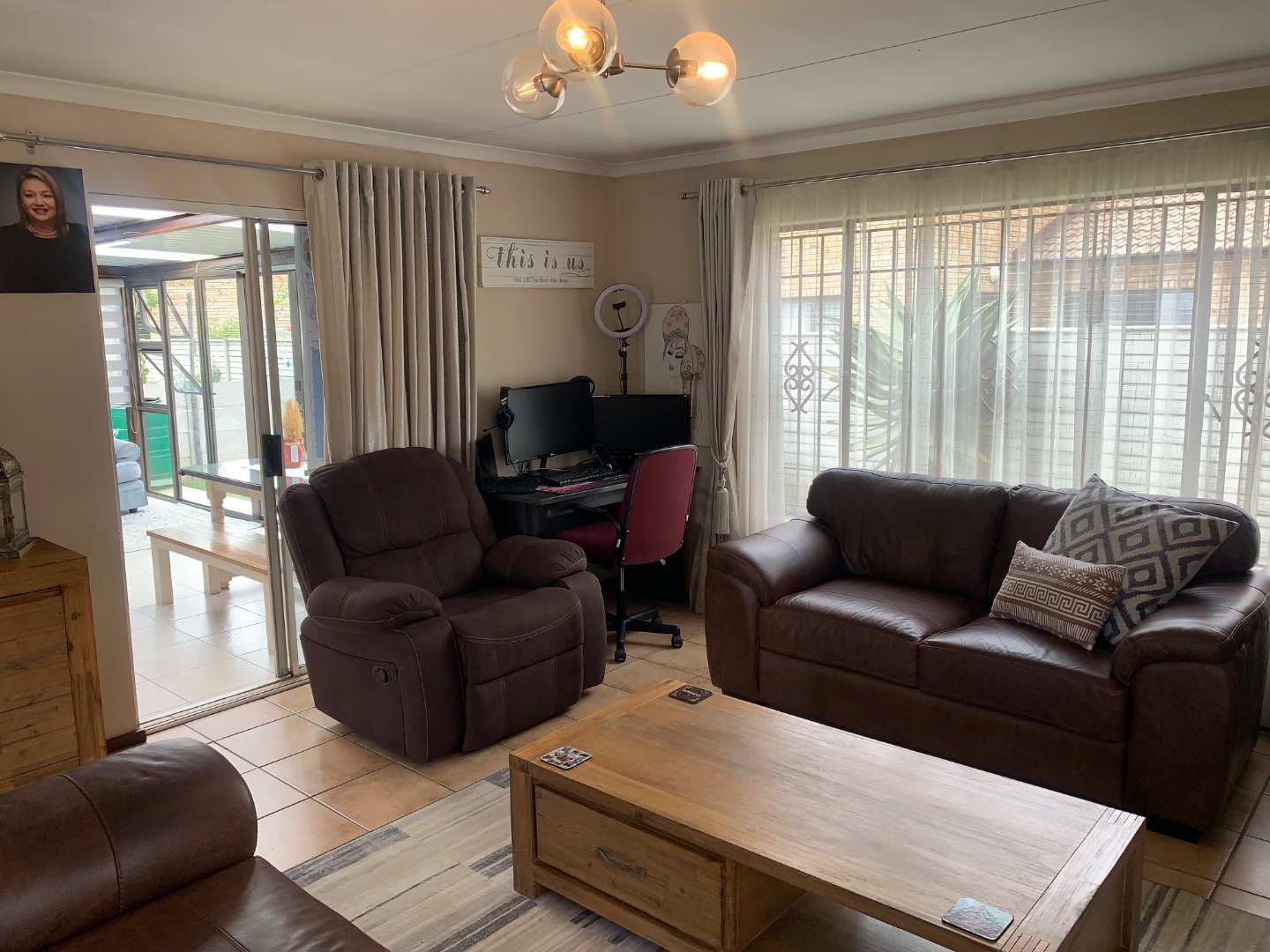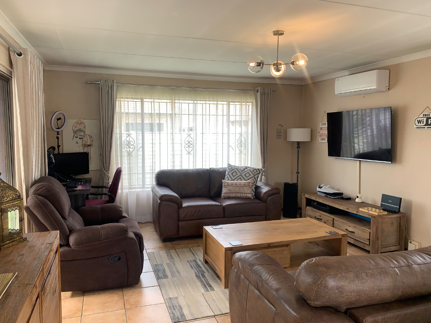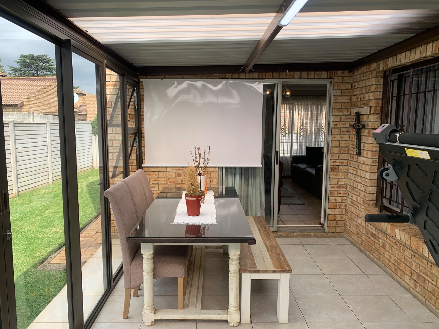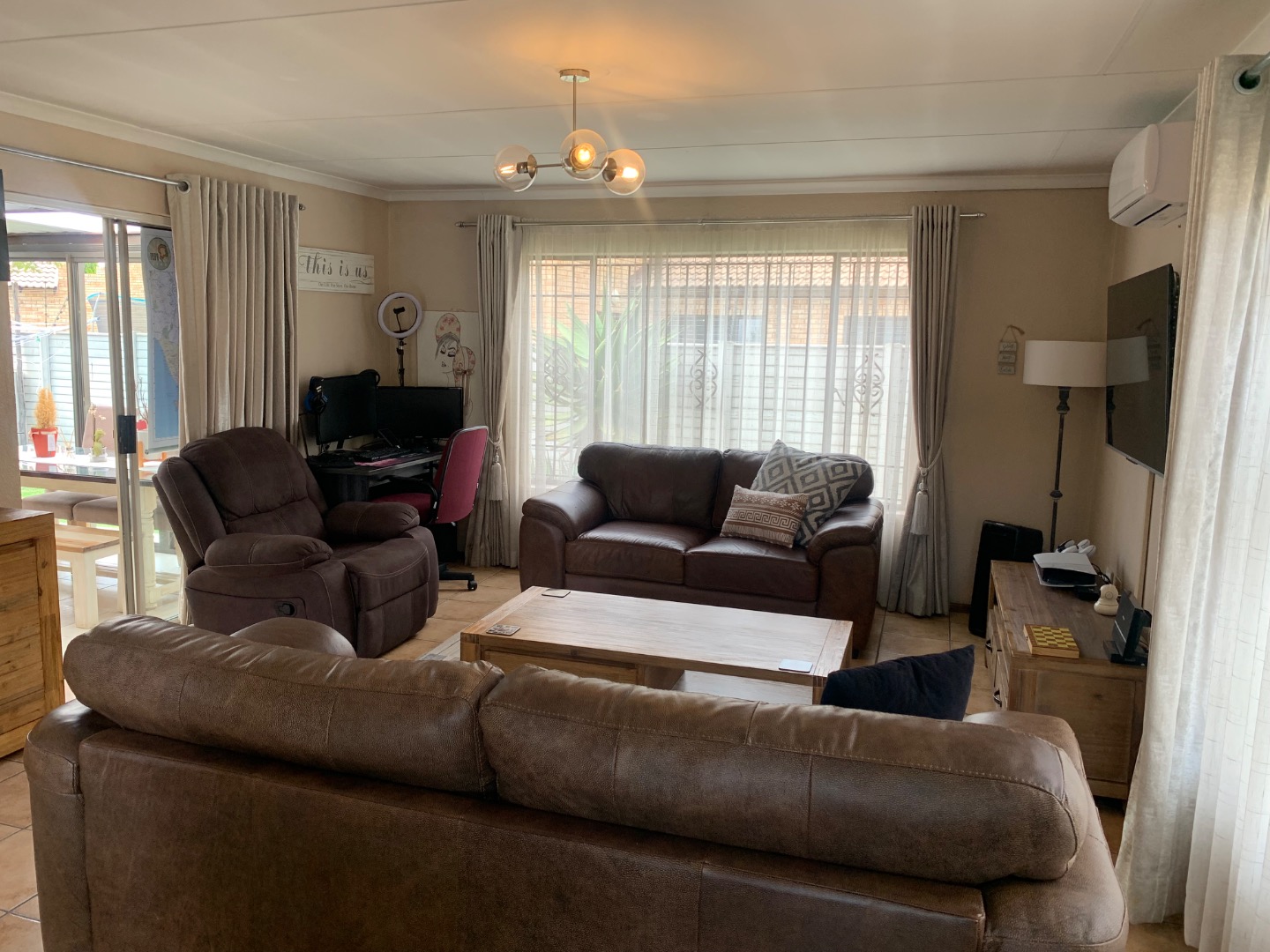 The interior features a functional layout, including a well-equipped kitchen, a dedicated dining room perfect for entertaining, and a comfortable lounge area. The property benefits from air conditioning, ensuring a pleasant environment throughout the year. Sliding doors enhance the flow between indoor and outdoor spaces, promoting a bright and airy atmosphere.