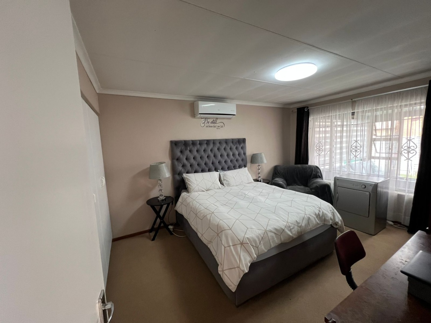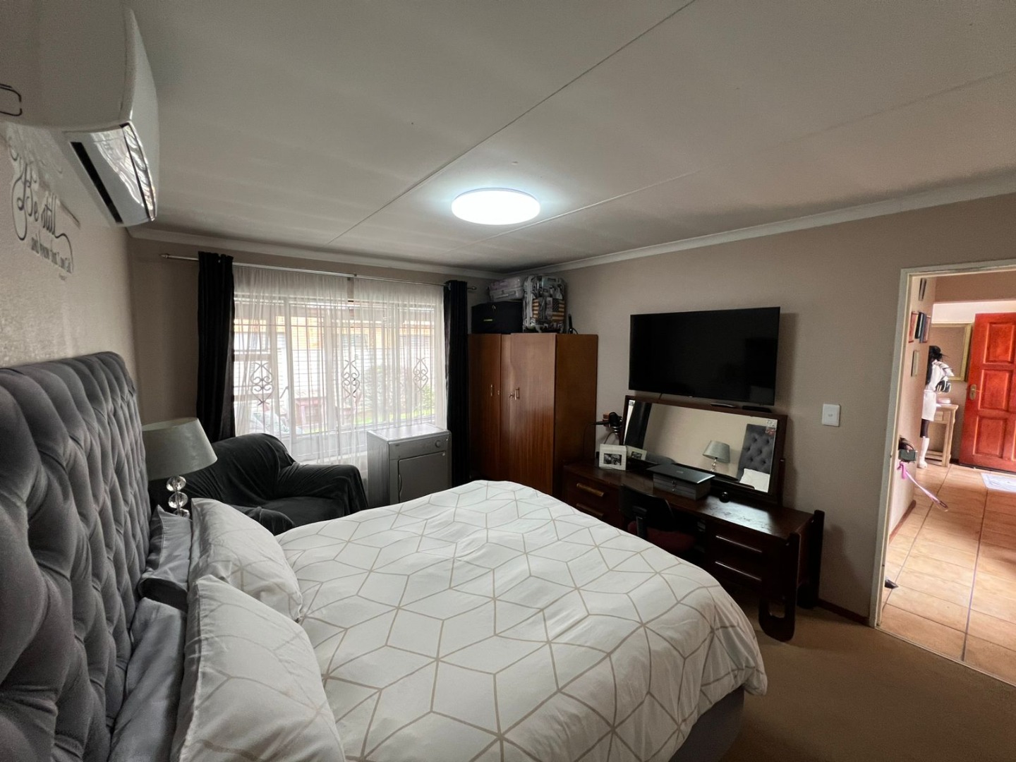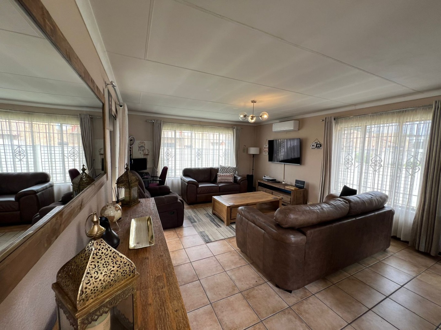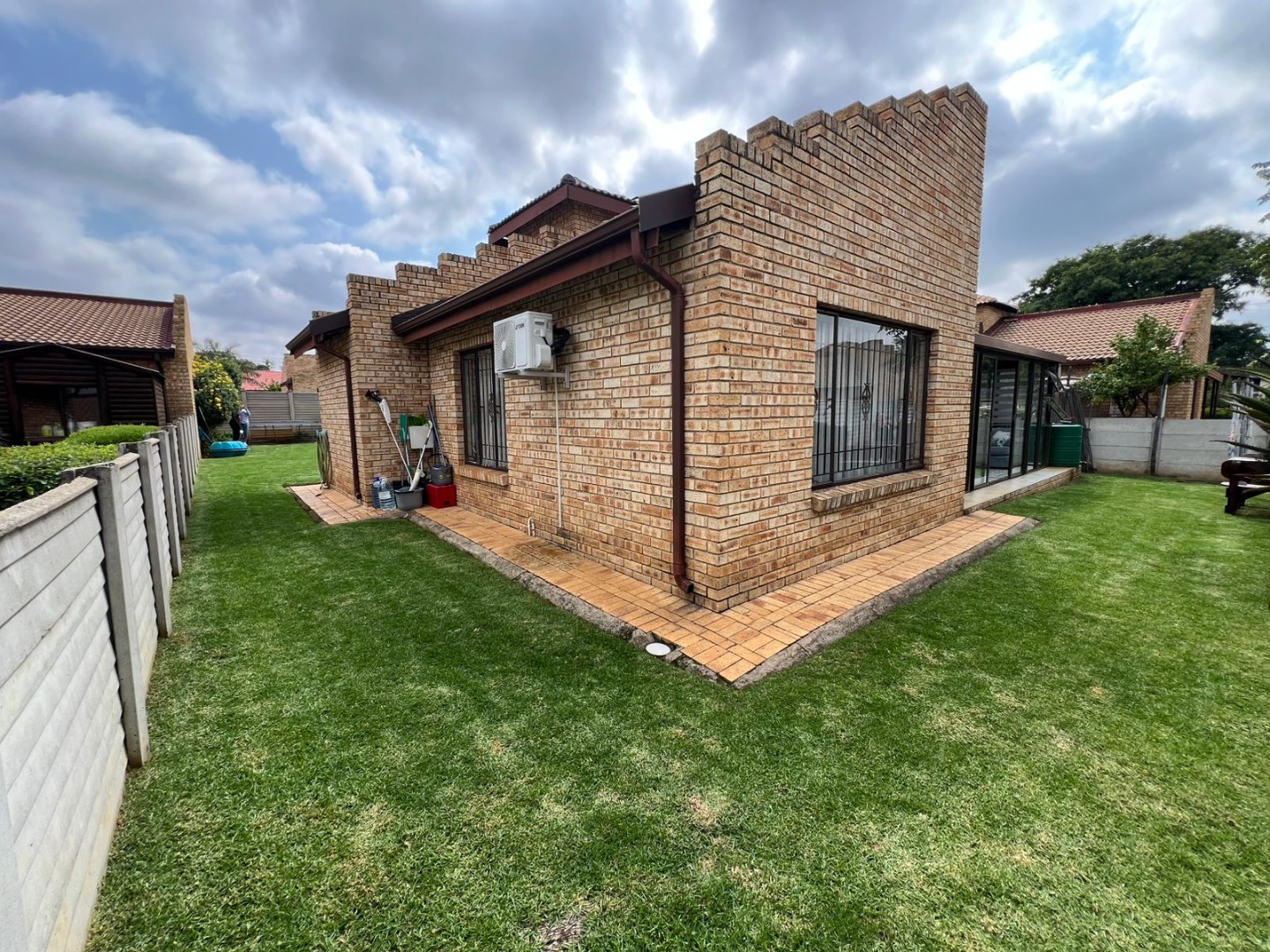 Enhancing the appeal of this residence is a private swimming pool, perfect for enjoying warm South African days. Modern conveniences include air conditioning for year-round comfort and fibre internet connectivity, catering to contemporary living needs. The property also boasts a private garden, offering a tranquil outdoor retreat without extensive upkeep.