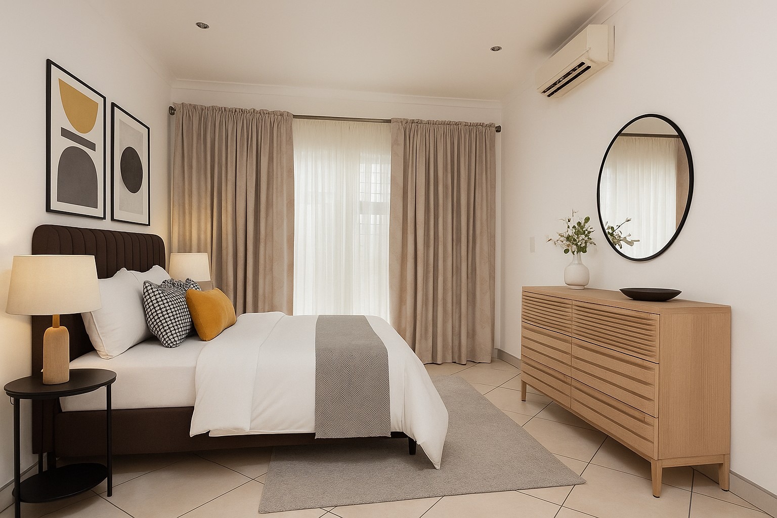 The modern kitchen and bright interiors complement the apartment’s welcoming atmosphere, while the master bedroom features an elegant en-suite bathroom and ample built-in cupboards for convenient storage.