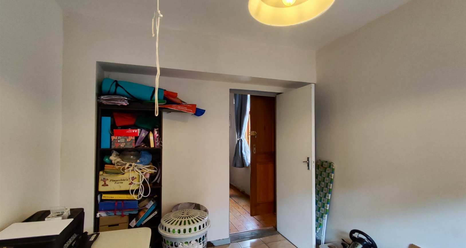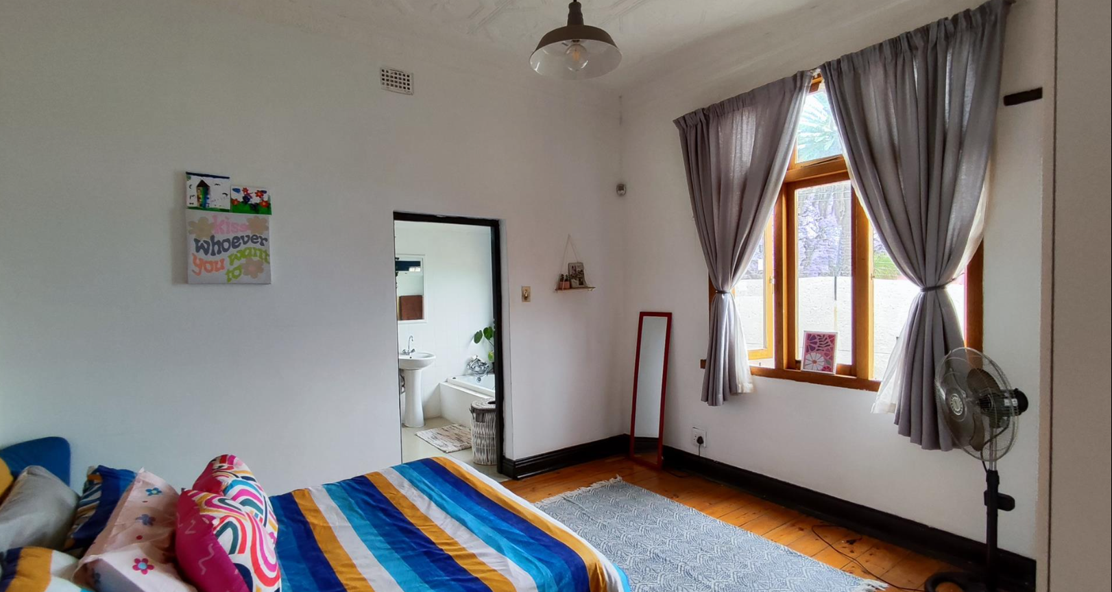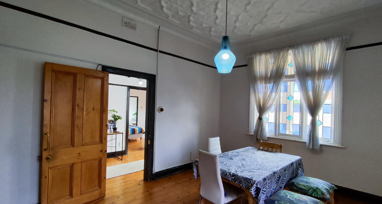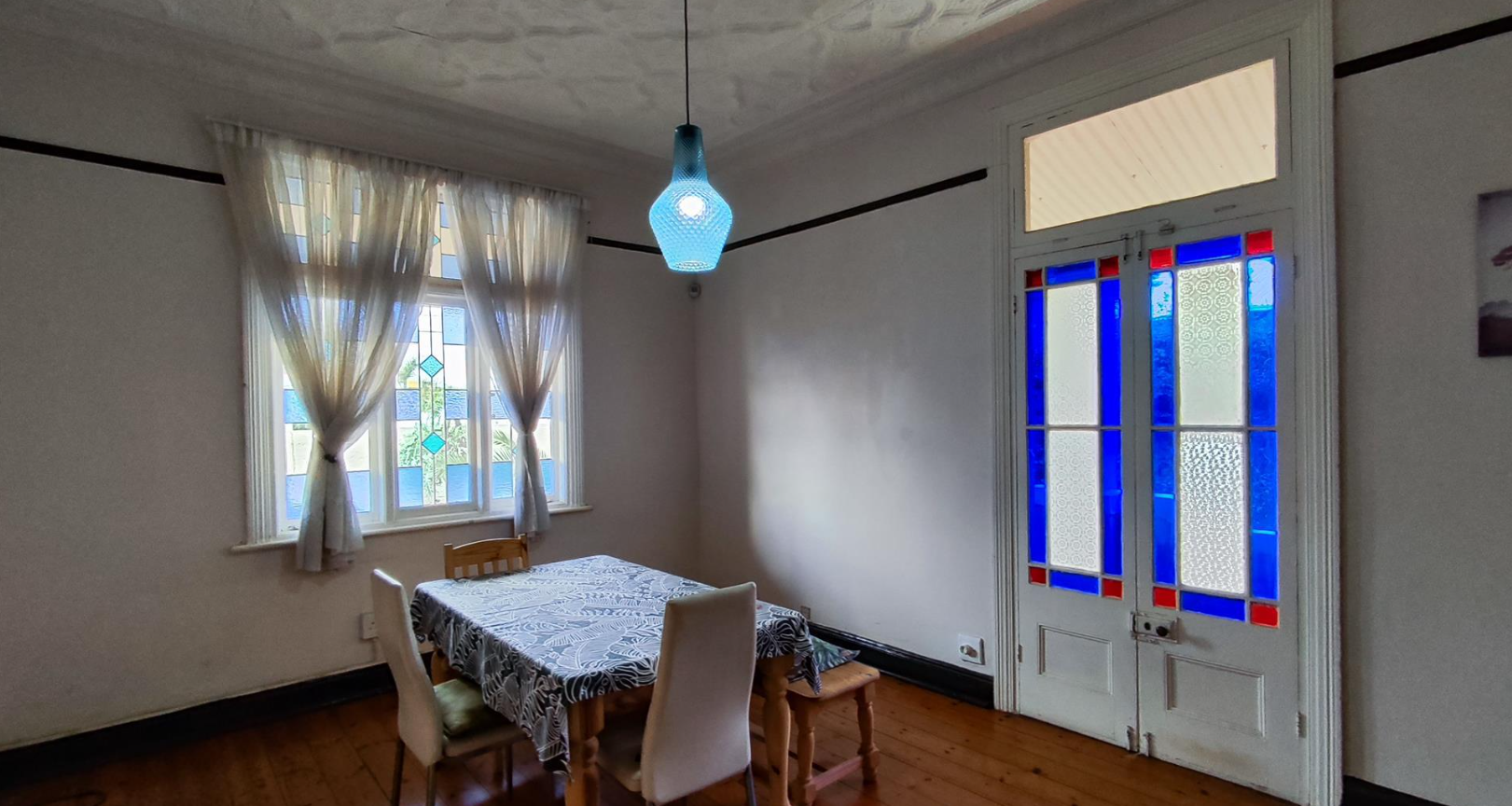 The living areas feature warm hardwood floors, distinctive high ceilings with coffered or plank detailing, and charming stained glass windows, creating an inviting atmosphere. The property comprises four comfortable bedrooms and two well-appointed bathrooms, providing ample accommodation for a family. An additional study offers a dedicated space for work or quiet reflection. The layout includes a versatile flatlet, enhancing the property's appeal and potential uses.