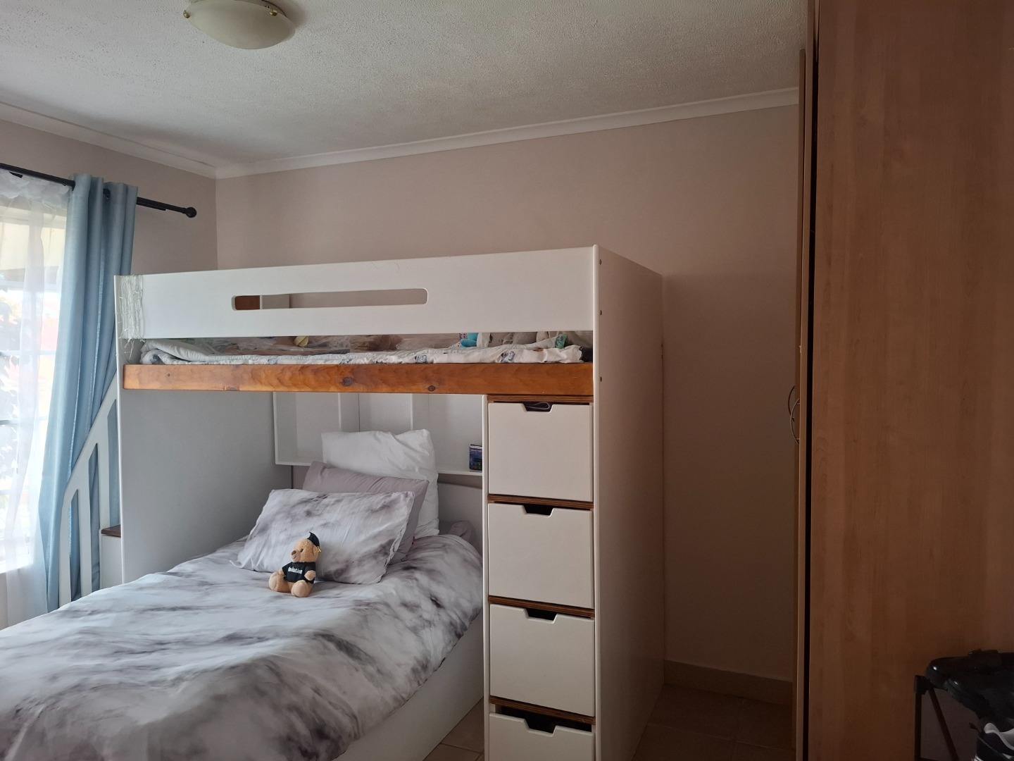 Spanning 90 square metres, the home features a well-designed layout that includes a functional kitchen, a dedicated dining room, and a comfortable lounge area, providing ample space for daily living and entertaining. One of the two bathrooms is an en-suite, adding a touch of privacy and luxury to the master bedroom.