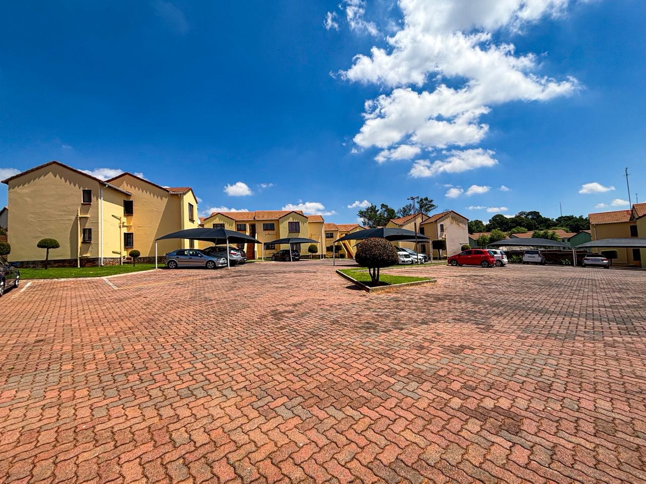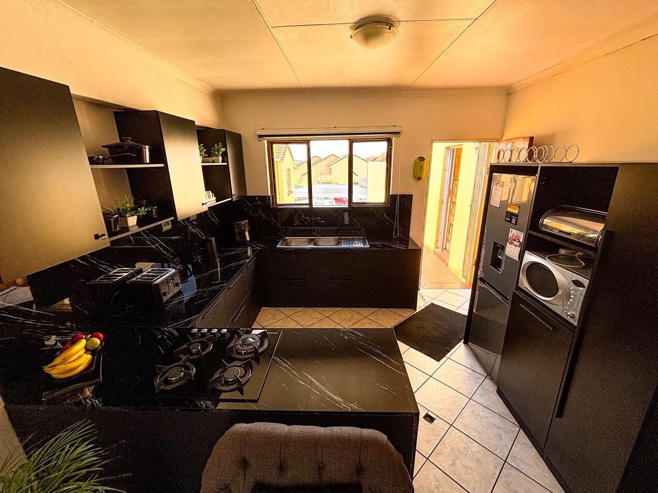 Discover this inviting residential apartment situated within a vibrant complex in Mondeor, Johannesburg. This multi-unit property boasts bright yellow and orange exteriors, complemented by well-maintained green lawns and decorative topiaries, creating an appealing first impression. Access to units is via paved stairs and walkways. Step inside to an open-concept living and kitchen area, designed for modern comfort and seamless flow. The contemporary kitchen features sleek black cabinetry and elegant marble-look surfaces, providing a stylish space for culinary pursuits. The living area is enhanced by a stylish accent wall with a large wall-mounted TV, offering a focal point for relaxation and entertainment. Tiled flooring throughout ensures easy maintenance and a cohesive aesthetic, while ample natural light brightens the space. This apartment offers two comfortable bedrooms and two well-appointed bathrooms, providing ample accommodation for residents. Enjoy the South African climate from your private, covered outdoor patio, complete with comfortable seating and a BBQ grill – perfect for entertaining or quiet relaxation. The patio features artificial turf, adding a touch of green. Residents also benefit from access to a communal pool, ideal for cooling off on warm days. Practical amenities include paved parking with carports, ensuring convenience for vehicle owners. Security is a priority with 24-hour security services, offering peace of mind. This well-established Johannesburg suburb provides a convenient location with access to local amenities and transport routes, making it an attractive choice for urban living. Key Features: * 2 Bedrooms, 2 Bathrooms * Open-plan living and kitchen * Modern kitchen with black cabinets * Private covered patio with BBQ * Communal swimming pool * Paved parking with carports * 24-hour security * Located in Mondeor, Johannesburg