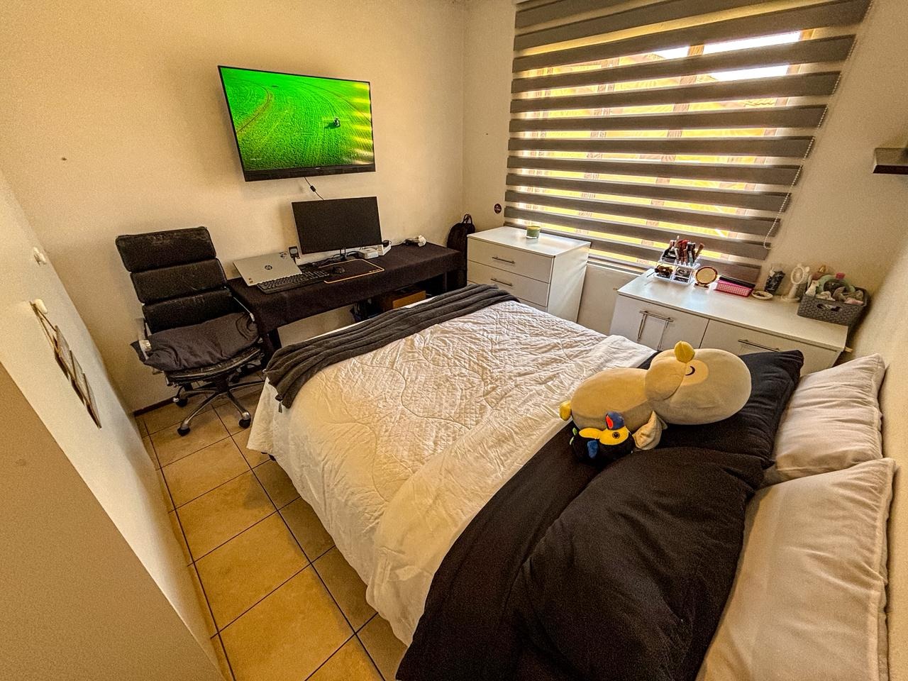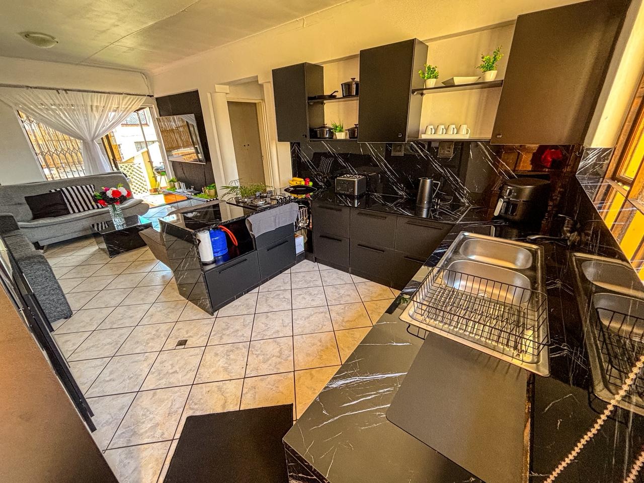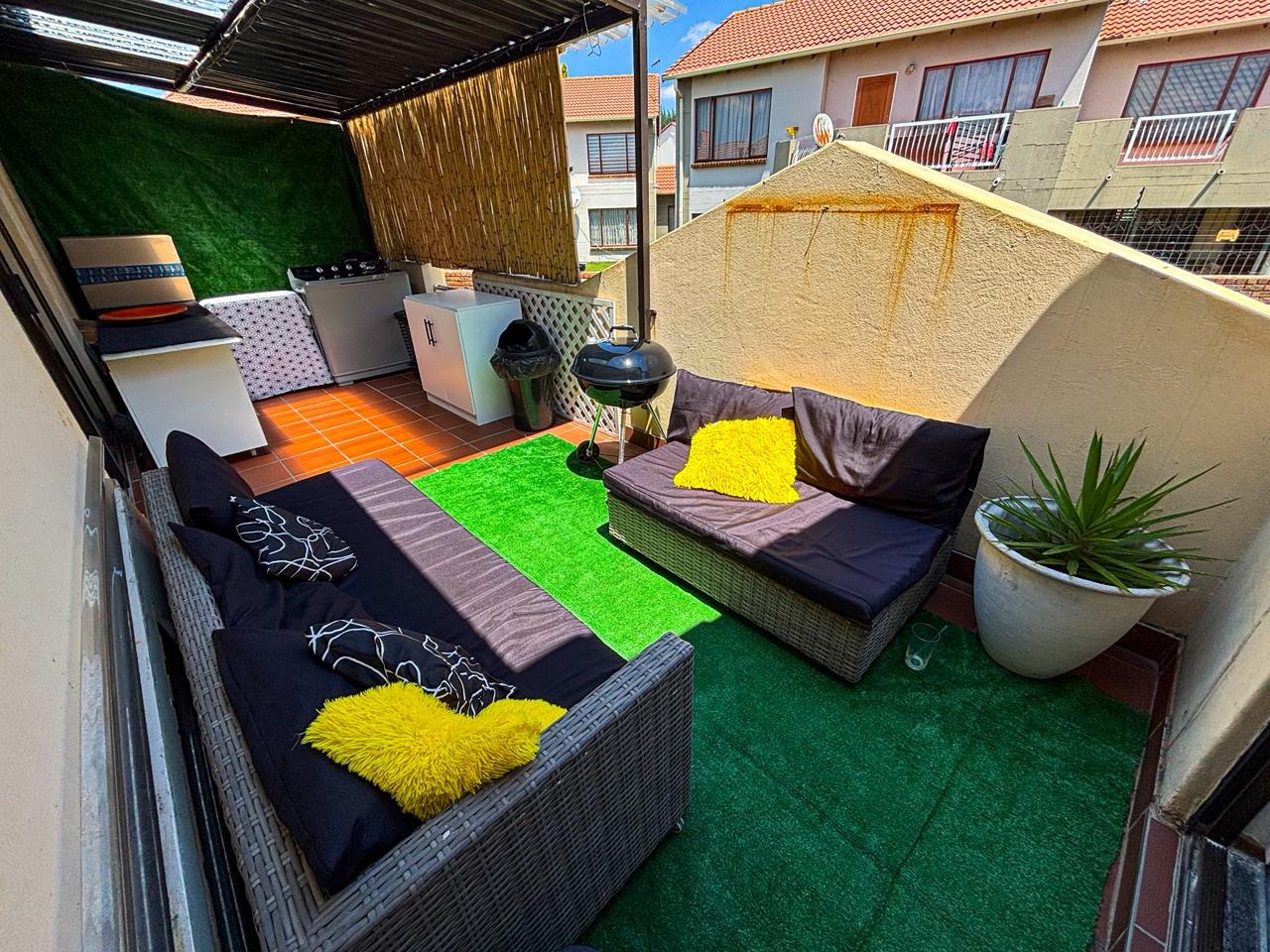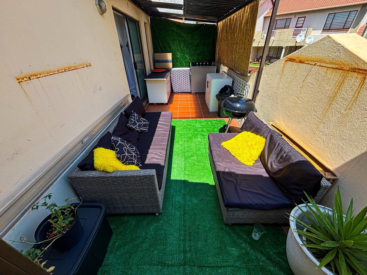 Discover this inviting residential apartment situated within a vibrant complex in Mondeor, Johannesburg. This multi-unit property boasts bright yellow and orange exteriors, complemented by well-maintained green lawns and decorative topiaries, creating an appealing first impression. Access to units is via paved stairs and walkways. Step inside to an open-concept living and kitchen area, designed for modern comfort and seamless flow. The contemporary kitchen features sleek black cabinetry and elegant marble-look surfaces, providing a stylish space for culinary pursuits. The living area is enhanced by a stylish accent wall with a large wall-mounted TV, offering a focal point for relaxation and entertainment. Tiled flooring throughout ensures easy maintenance and a cohesive aesthetic, while ample natural light brightens the space. This apartment offers two comfortable bedrooms and two well-appointed bathrooms, providing ample accommodation for residents. Enjoy the South African climate from your private, covered outdoor patio, complete with comfortable seating and a BBQ grill – perfect for entertaining or quiet relaxation. The patio features artificial turf, adding a touch of green. Residents also benefit from access to a communal pool, ideal for cooling off on warm days. Practical amenities include paved parking with carports, ensuring convenience for vehicle owners. Security is a priority with 24-hour security services, offering peace of mind. This well-established Johannesburg suburb provides a convenient location with access to local amenities and transport routes, making it an attractive choice for urban living. Key Features: * 2 Bedrooms, 2 Bathrooms * Open-plan living and kitchen * Modern kitchen with black cabinets * Private covered patio with BBQ * Communal swimming pool * Paved parking with carports * 24-hour security * Located in Mondeor, Johannesburg