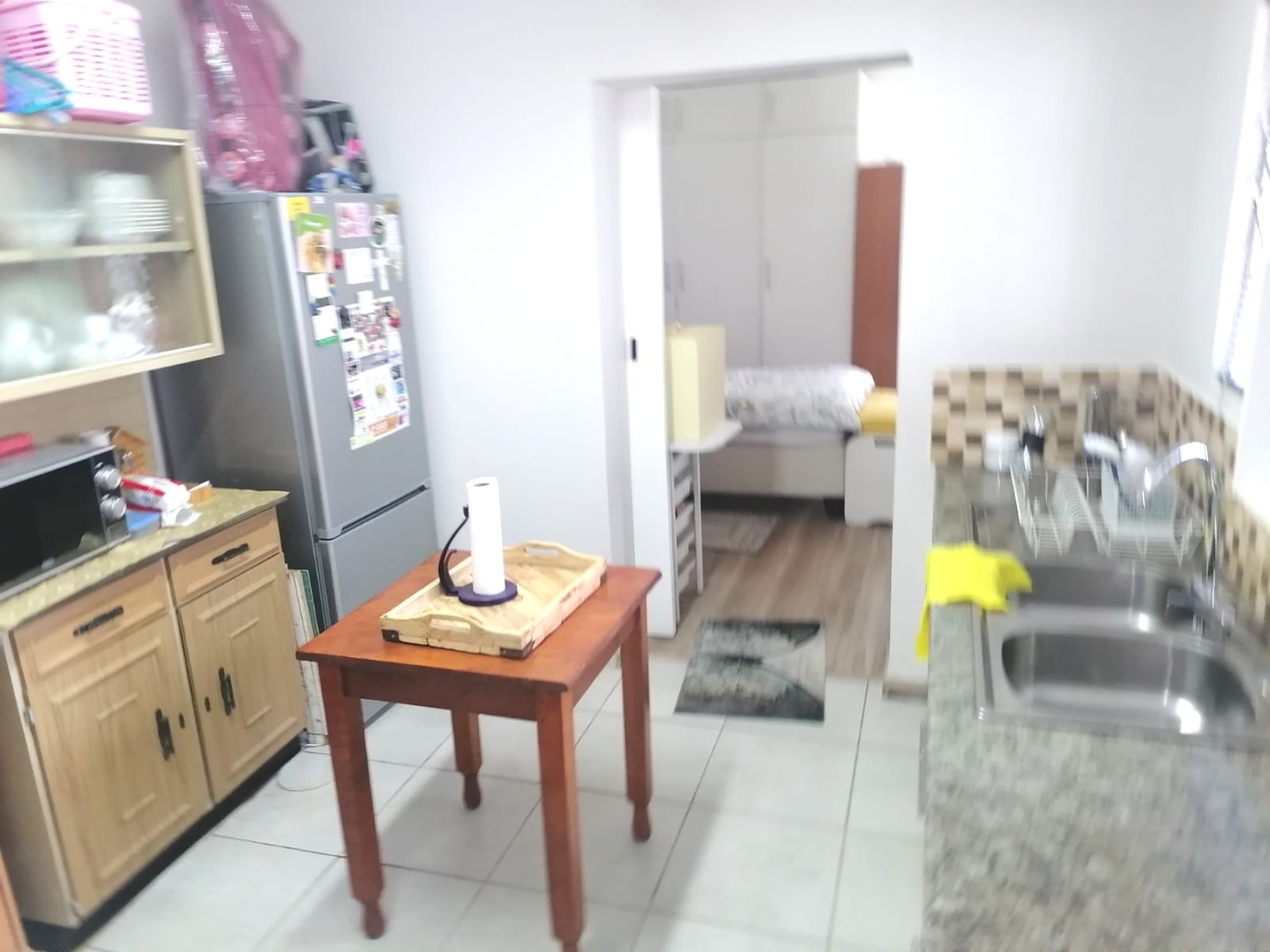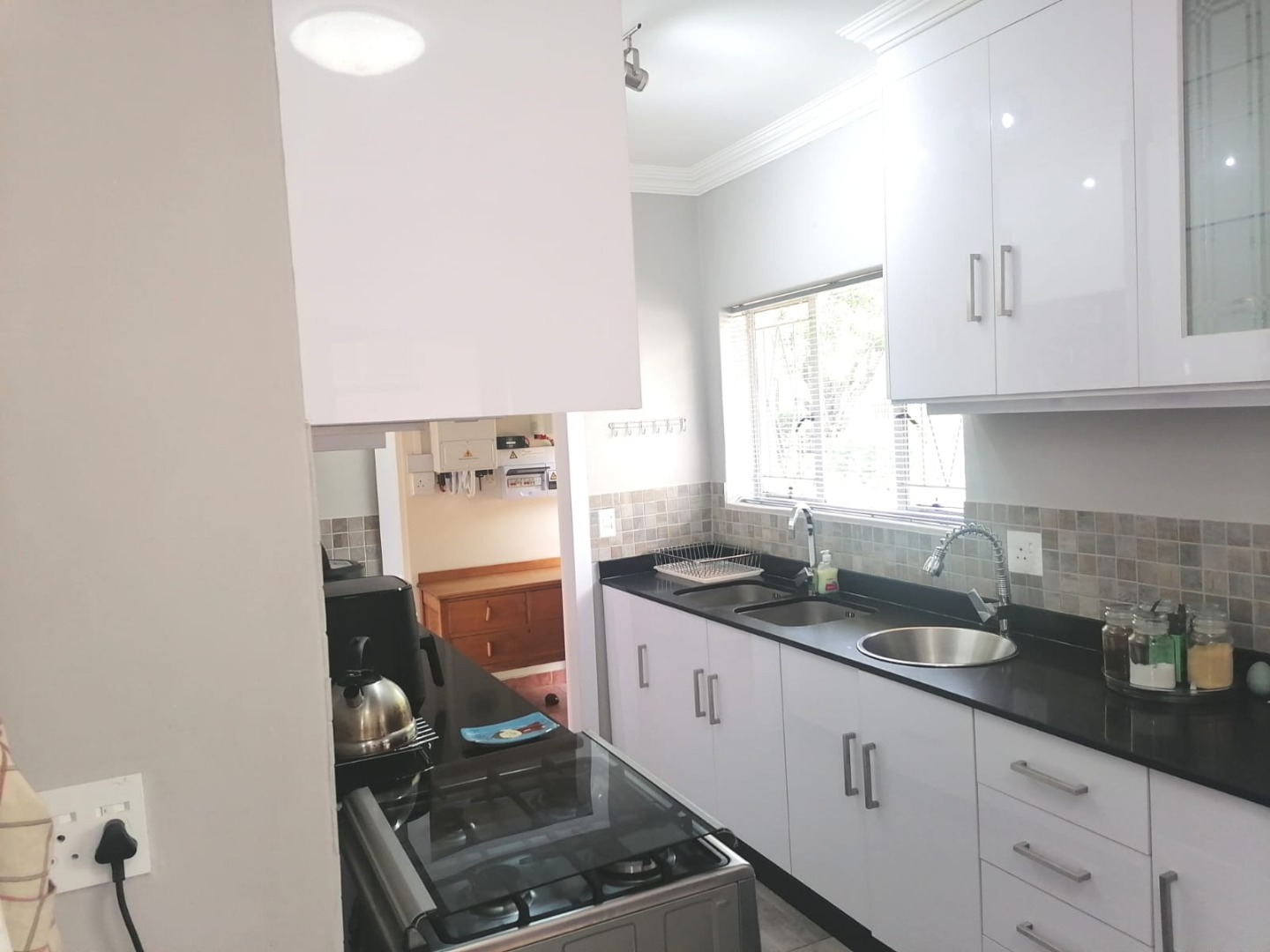 - A modern kitchen equipped with built-in cupboards (BIC), a gas stove, and elegant granite countertops.