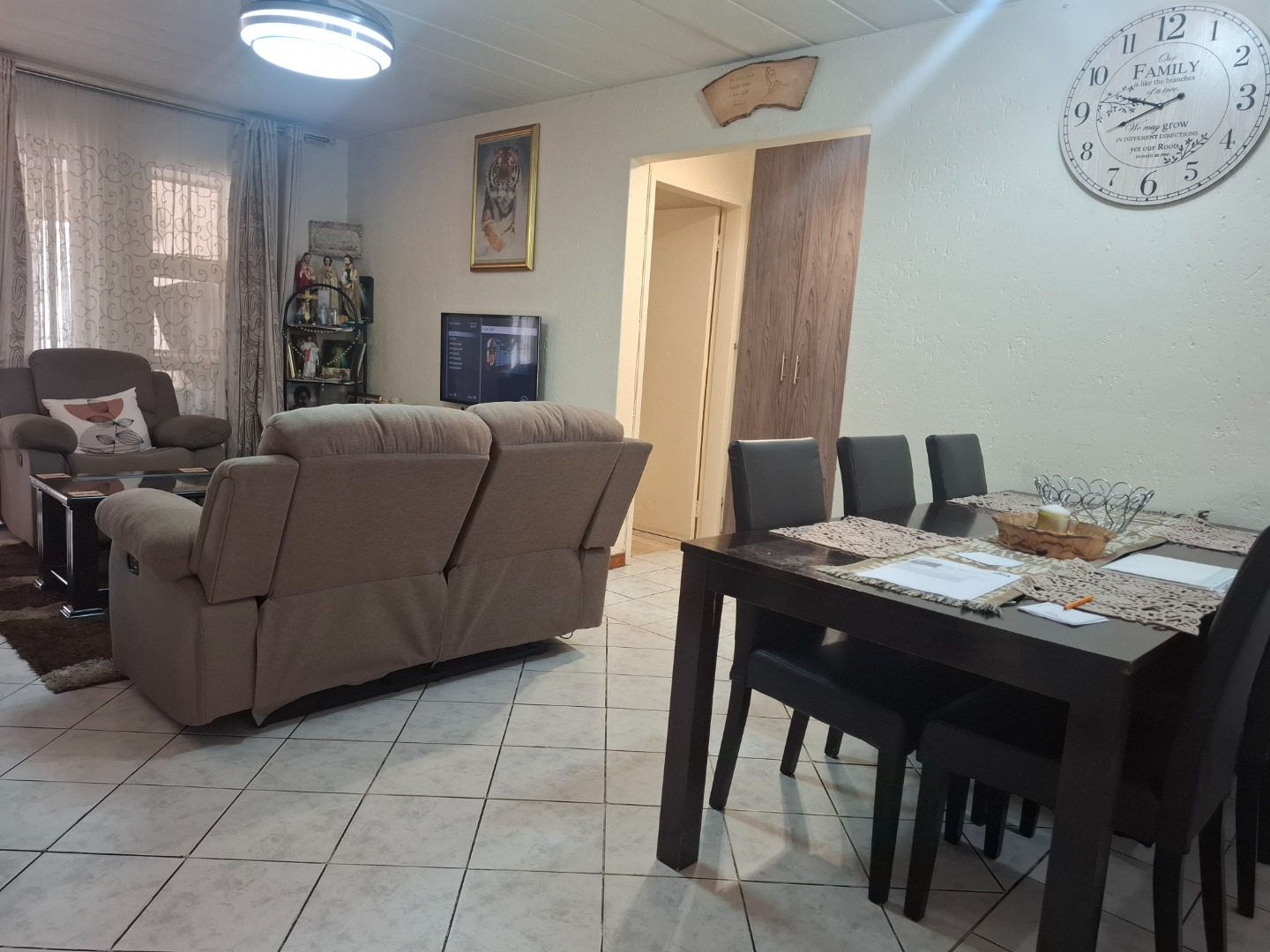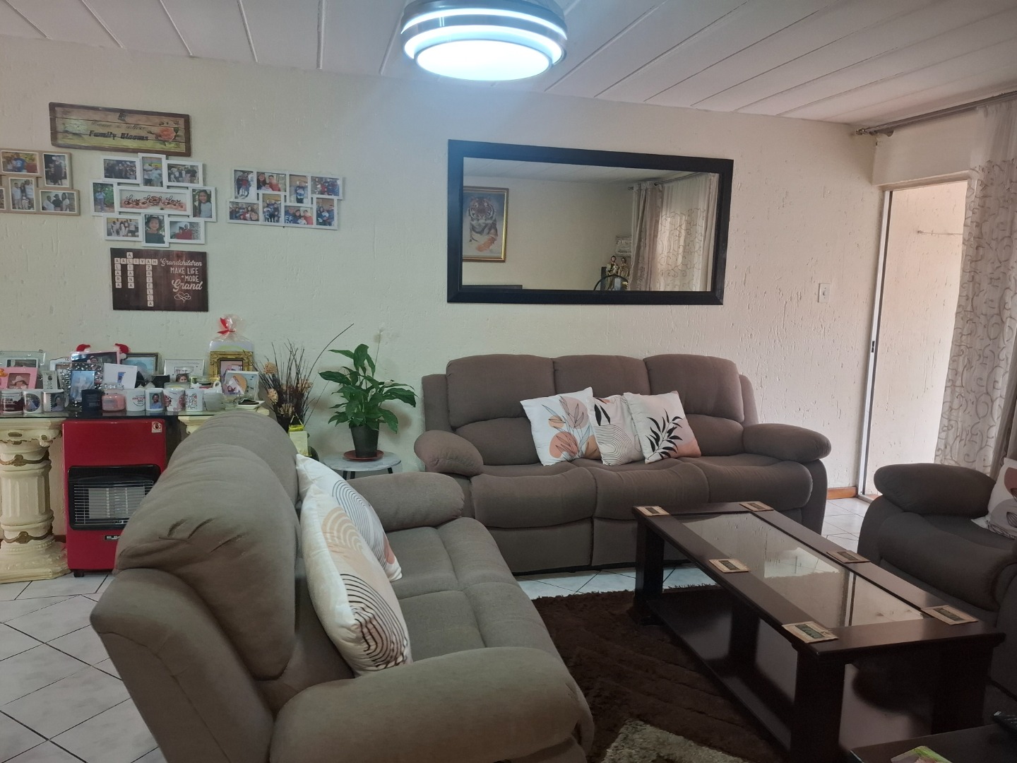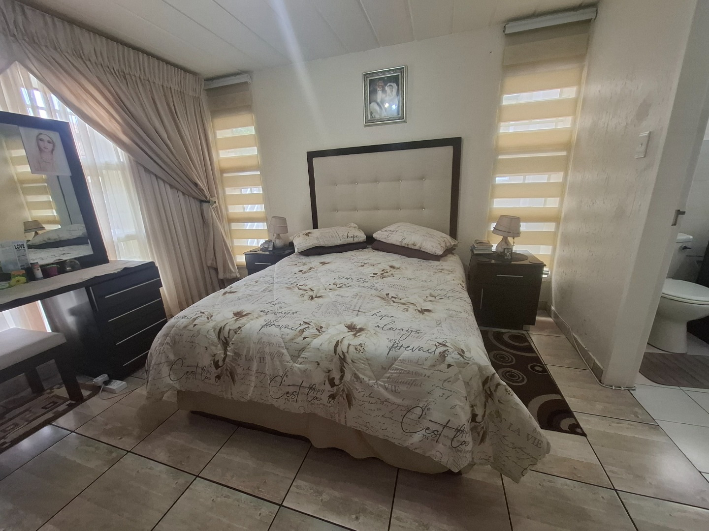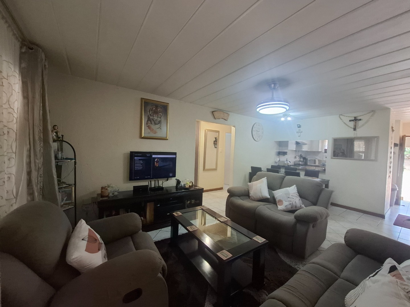 Inside, you’ll find three well-proportioned bedrooms, all complete with built-in cupboards. The home is serviced by a full family bathroom, while the main bedroom boasts its own private en-suite, offering added comfort and privacy.